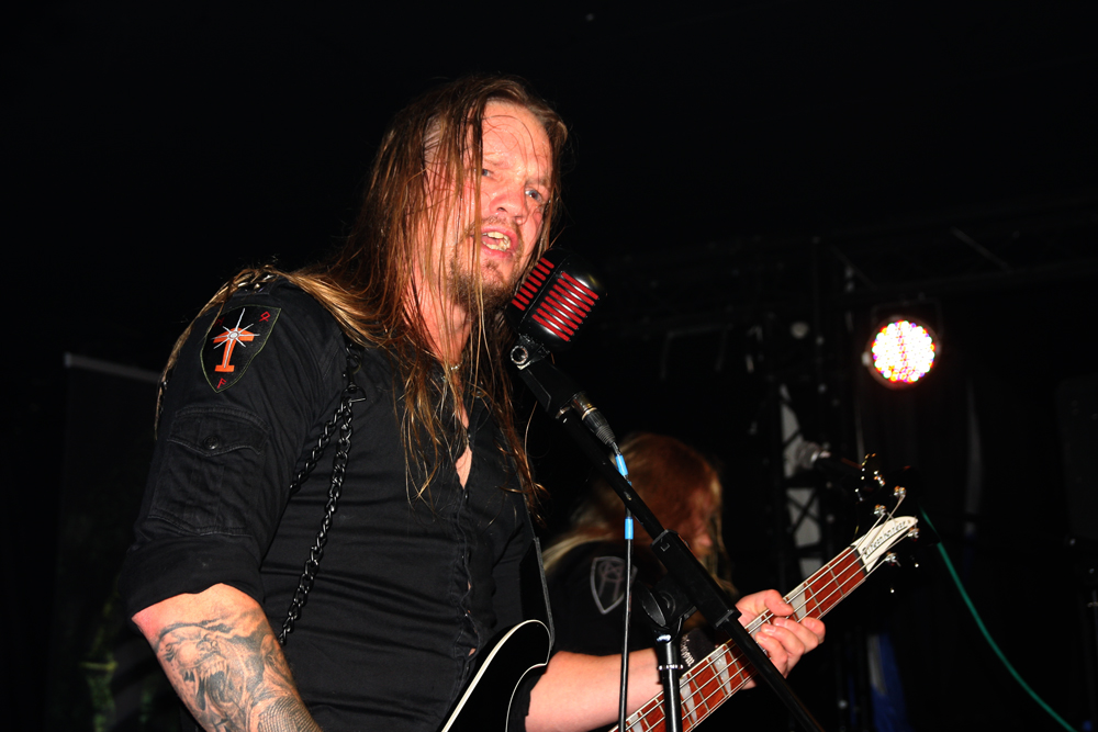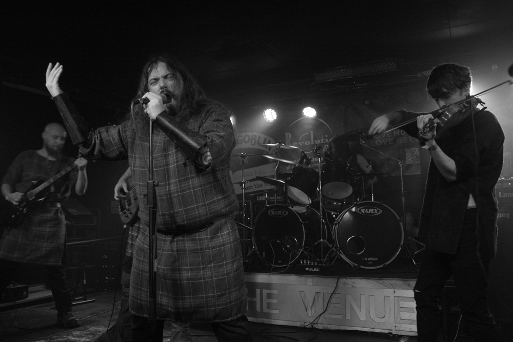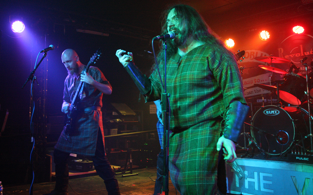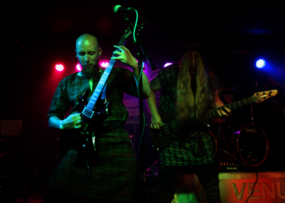 Plaid outfits and a fiddle player announce Irish band Celtachor are on stage. ‘Arrival Of The Tuatha’ opens the battle, from their ‘Nuada Of The Silver Arm’ album and their vocalist Stephen Roche is a wild eyed, energetic presence and their sound is much heavier than I expected, more Primordial than twee folk. There’s a bit of the faster bits of Mael Mordha in there too, though sadly no clean vocals. It’s driving, intensely passionate stuff and they certainly have their fans in from the enthusiastic response. Heavy but with melody aplenty (whistles from Roche and fiddle from the young Liam Henry) they draw on songs from both ‘Nuada…’ and ‘Nine Waves From The Shore’ and maybe an older song (I couldn’t catch all that was said from the stage). Occasional niggling mic problems aside they put in a fine performance that keeps a good day bouncing and rolling along. (Giz)