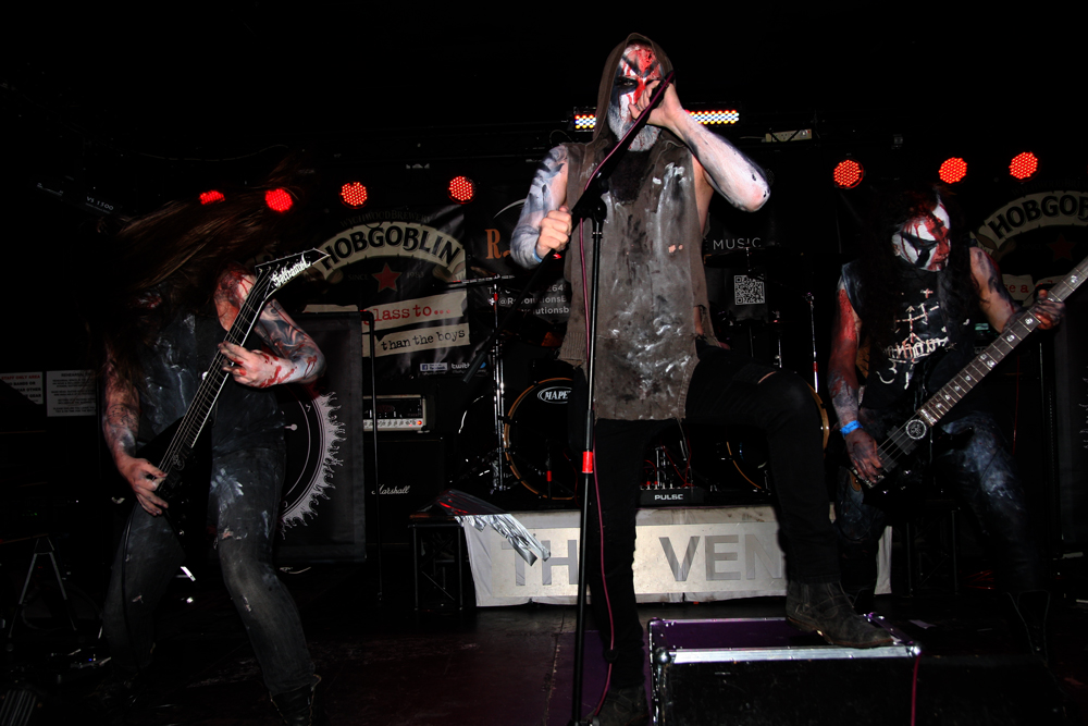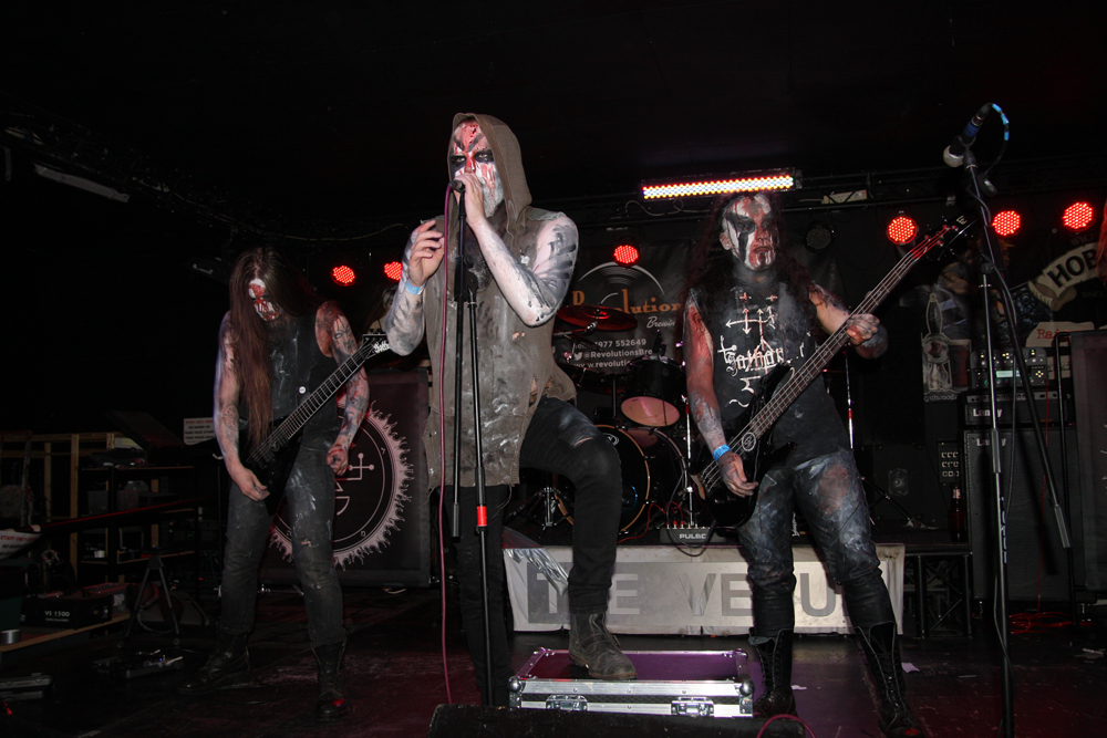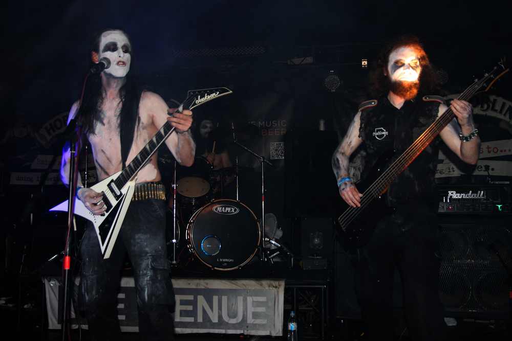 Also from London but far from strangers are unholy trio Scutum Crux. Selby has probably sold out of certain cosmetics as they are another lot who don’t hold off when it comes to plastering themselves in corpse paint and look a touch on the grim side. Clattering off and intending to destroy they are quickly out the traps. The complexity behind the all-out pummelling attack is illustrated by some technical guitar licks and it is all pretty damn frenzied sending the unsuspecting heads into a spin. Stage front there is plenty of twirling hair in co-ordination and the Polish flavours come out in the musical storm, especially with the gargled in between song announcements. The snares and cymbals batter away crunching all the way to the back of the room and this is an energetic and hateful display that no doubt wins the band some new followers in Yorkshire.