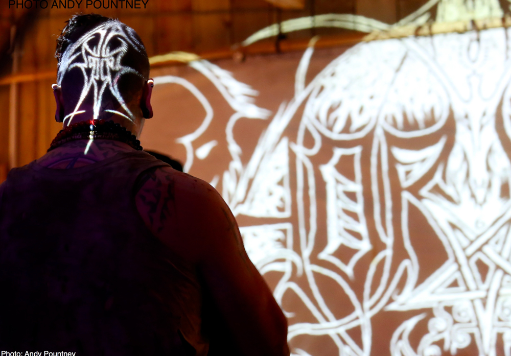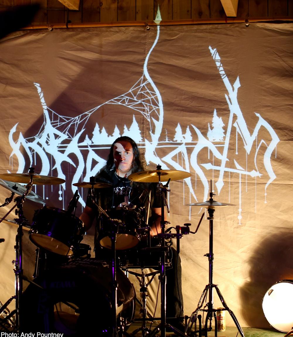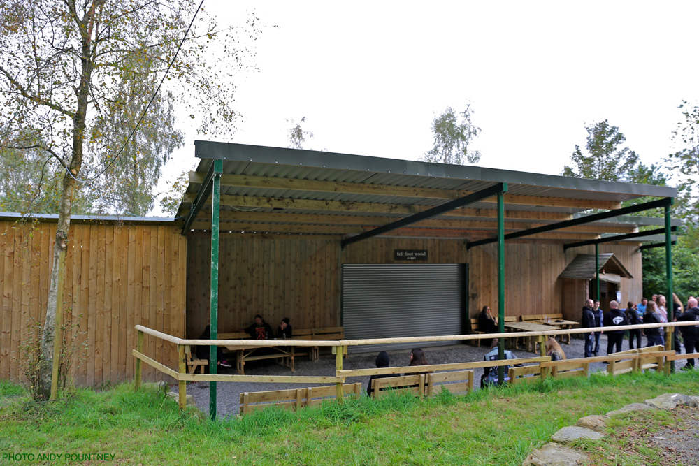 The Blackwood Gathering is set in the Lake District, specifically in a remote wooded area on a hillside overlooking Lake Windermere giving the perfect atmosphere to showcase extreme metal from both home and abroad. The event is held in a moderately sized wooden structure (imagine a big shed!) which incorporates the bar and merch areas, as well as the stage. When the crowd gathers, the side of the building is retracted, meaning the gathered hordes can watch from outside the building, under the stars, amongst the trees next to the fire pit.