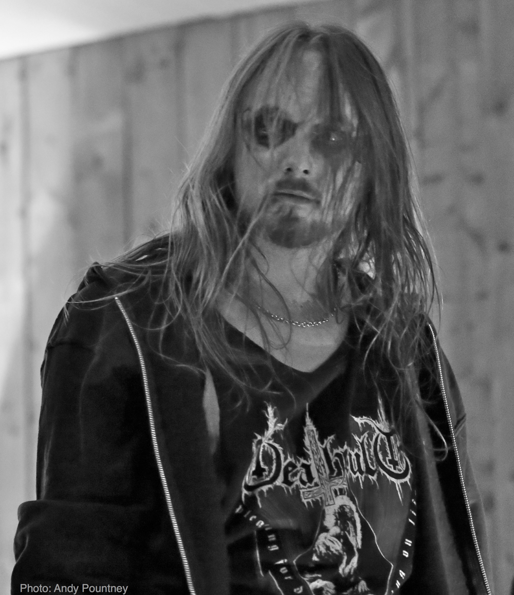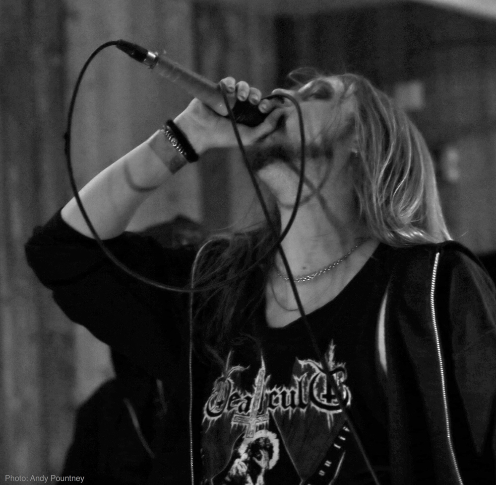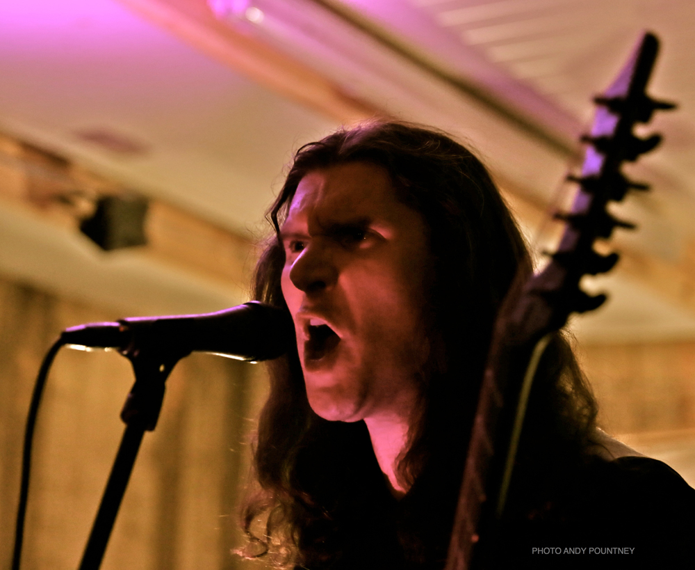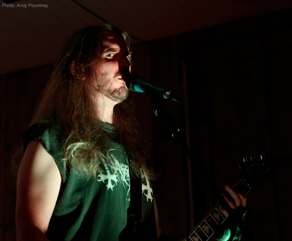 Having sampled a pint of (very tasty!) locally brewed “Gnat’s Piss” ale, I found a spot for Welsh one man project ‘Deheubarth’. Mastermind Myrggh was joined by a drummer and bassist for this live outing, and together they were suitably battering and got heads moving amongst the gathered throng at the front. Variations in pace and vocal style amidst the throws of raw despair kept things interesting and although there were one or two technical issues, their set flew by and went down well.