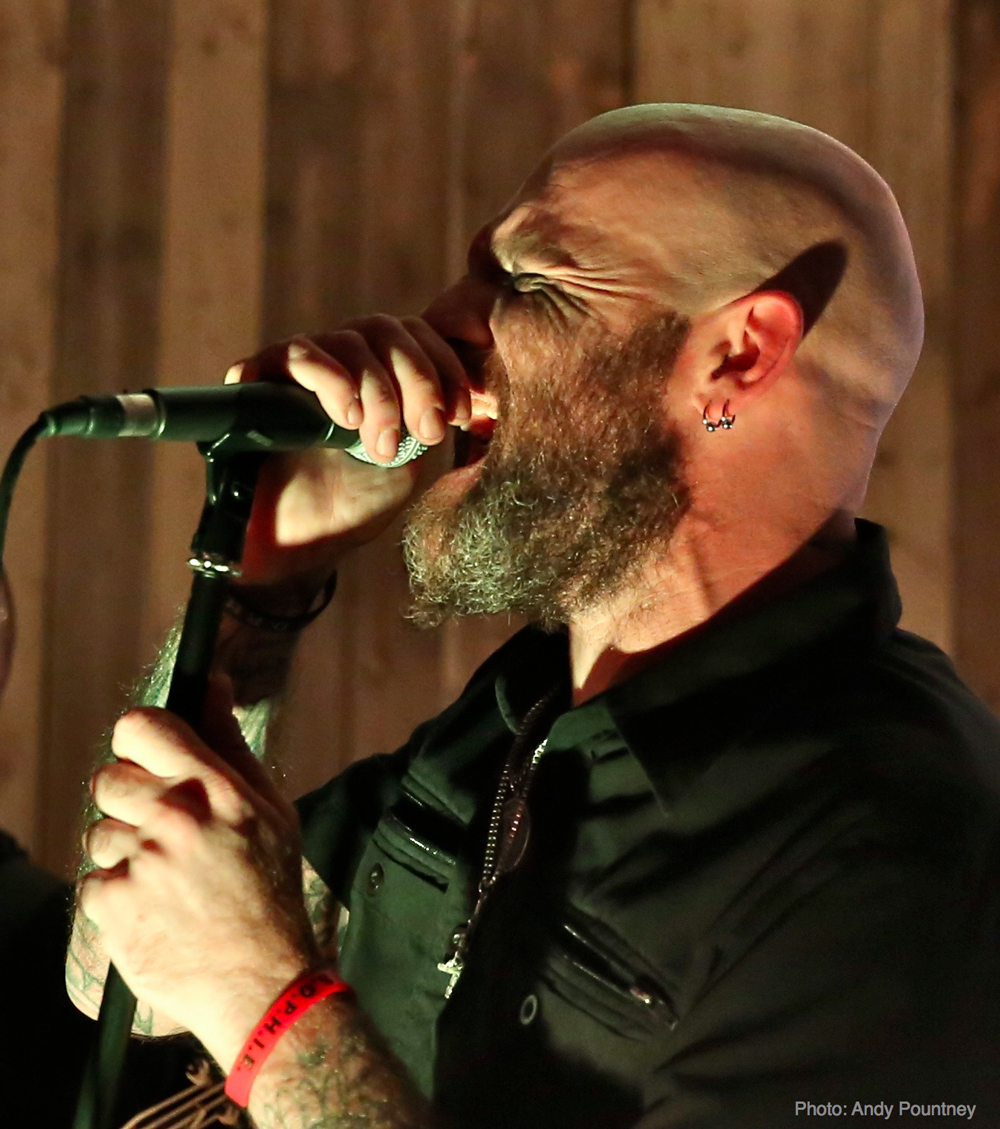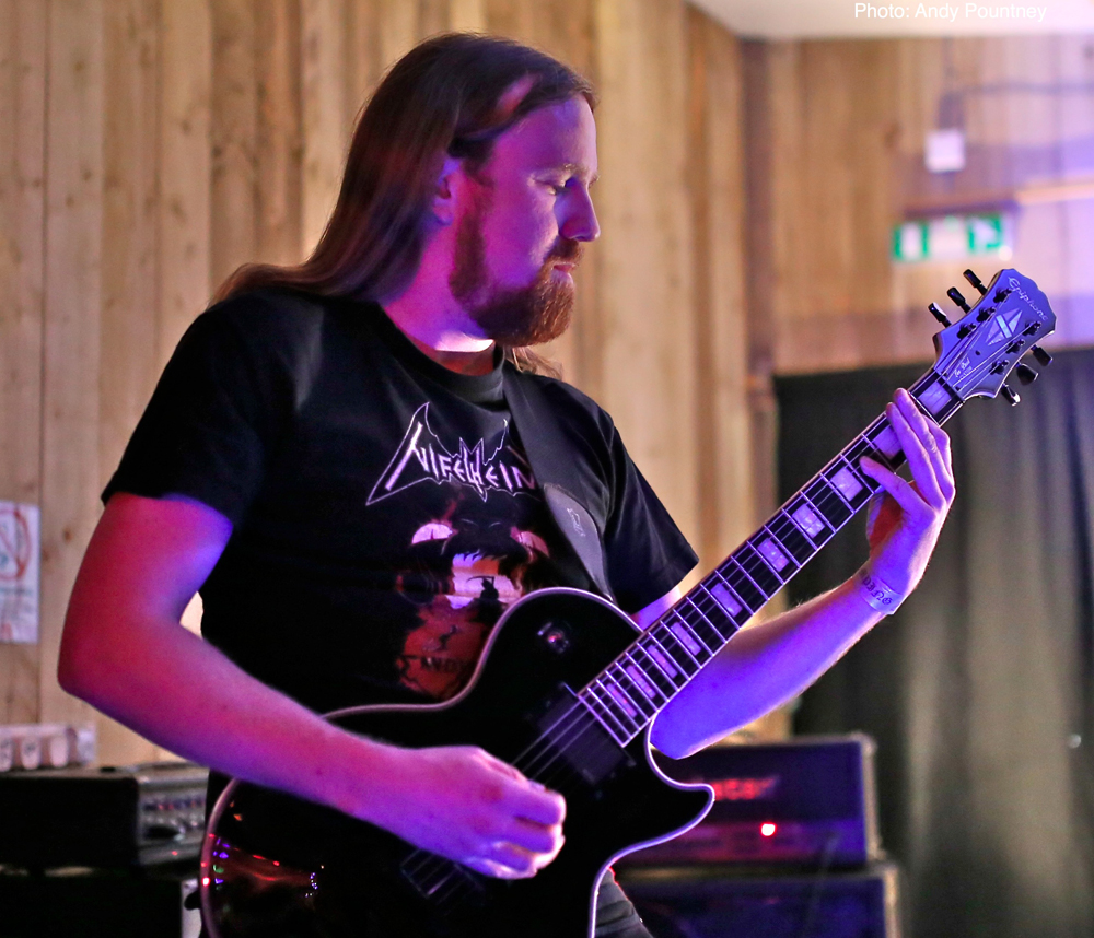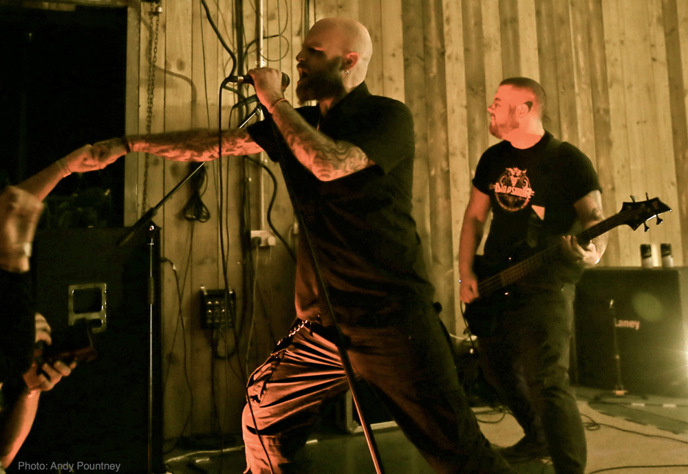 Having sampled a pint of (very tasty!) locally brewed “Gnat’s Piss” ale, I found a spot for Welsh one man project ‘Deheubarth’. Mastermind Myrggh was joined by a drummer and bassist for this live outing, and together they were suitably battering and got heads moving amongst the gathered throng at the front. Variations in pace and vocal style amidst the throws of raw despair kept things interesting and although there were one or two technical issues, their set flew by and went down well.