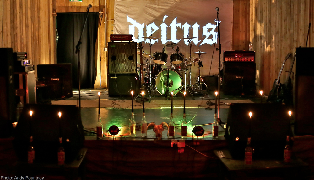 Day two began with masked London black metal trio Deitus who, took to a stage adorned with a skull and candles after a long intro tape, and drew the hordes in from the late summer sunshine with opening track ‘Lightbearer’. We were then treated to ‘Todestrieb’ and ‘Manifest’ also from the debut ‘Acta Non Verba’, as well as ‘Highest Power’, one of its bonus tracks. Their brand of aggressive black metal certainly cleared a few hangovers!