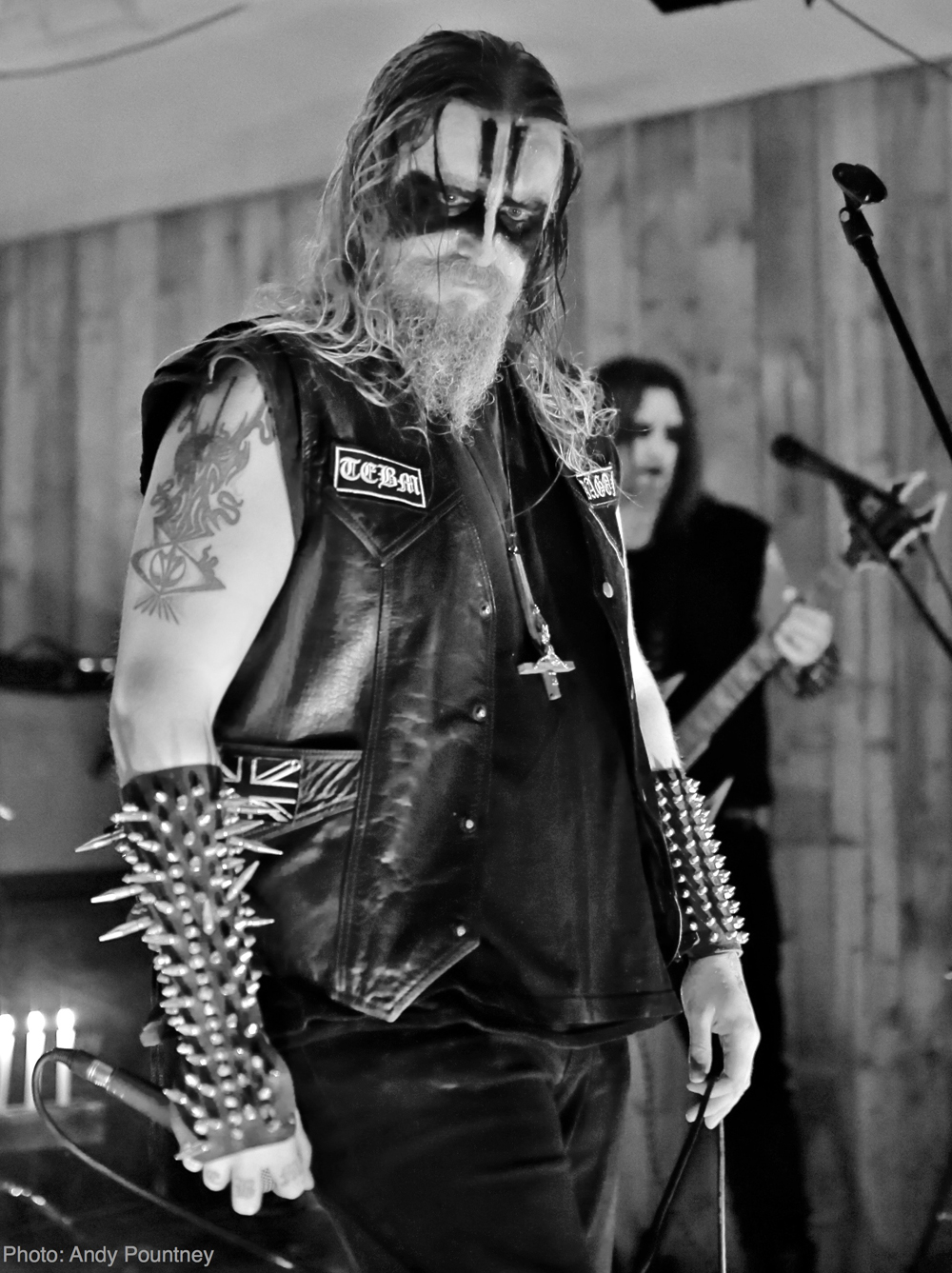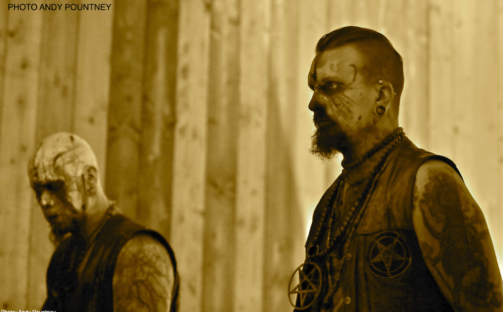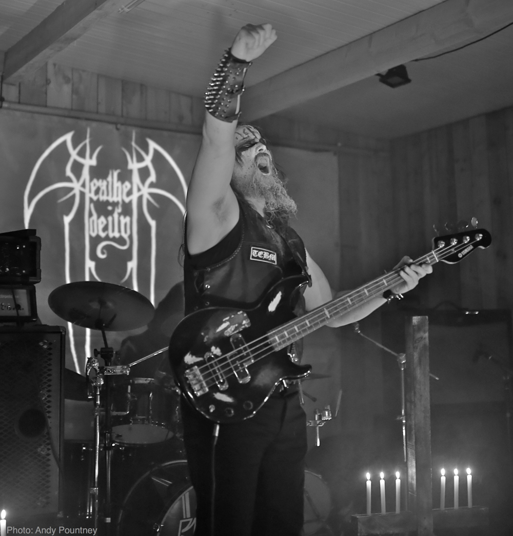 Next up were Heathen Deity a band who have been around since 1998, but had been on an extended hiatus and the Blackwood gathering was to be their rebirth. Two inverted crosses illuminated by candles were placed on the stage before a twin guitar, corpse painted attack was unleashed. Vocalist Dagon was a particularly uncompromising, intimidating figure on stage while spitting forth his venomous bile during opening track ‘The Flames of the Gathering Darkness’. He took a few moments, to welcome us to their “Rebirth” and said that they had been away from the scene for too long, before resuming the ceremonials. Their old school black metal was appreciated by a packed crowd, but there wasn’t much movement down the front, much to the disgust of Dagon who scolded the crowd saying “Call yourself black metallers? You’re pathetic! Only death is real!”, before launching into a stunning cover of Mayhem’s ‘Deathcrush’, which only a pitiful number of people seemed to recognise. The crowd were asked whether any of them considered themselves to be “Anti-Christian” before being pummeled with ‘Gut the Church’, which included Dagon throwing his inverted cross into the throng. Heathen Deity are resurrected, and I left very impressed!