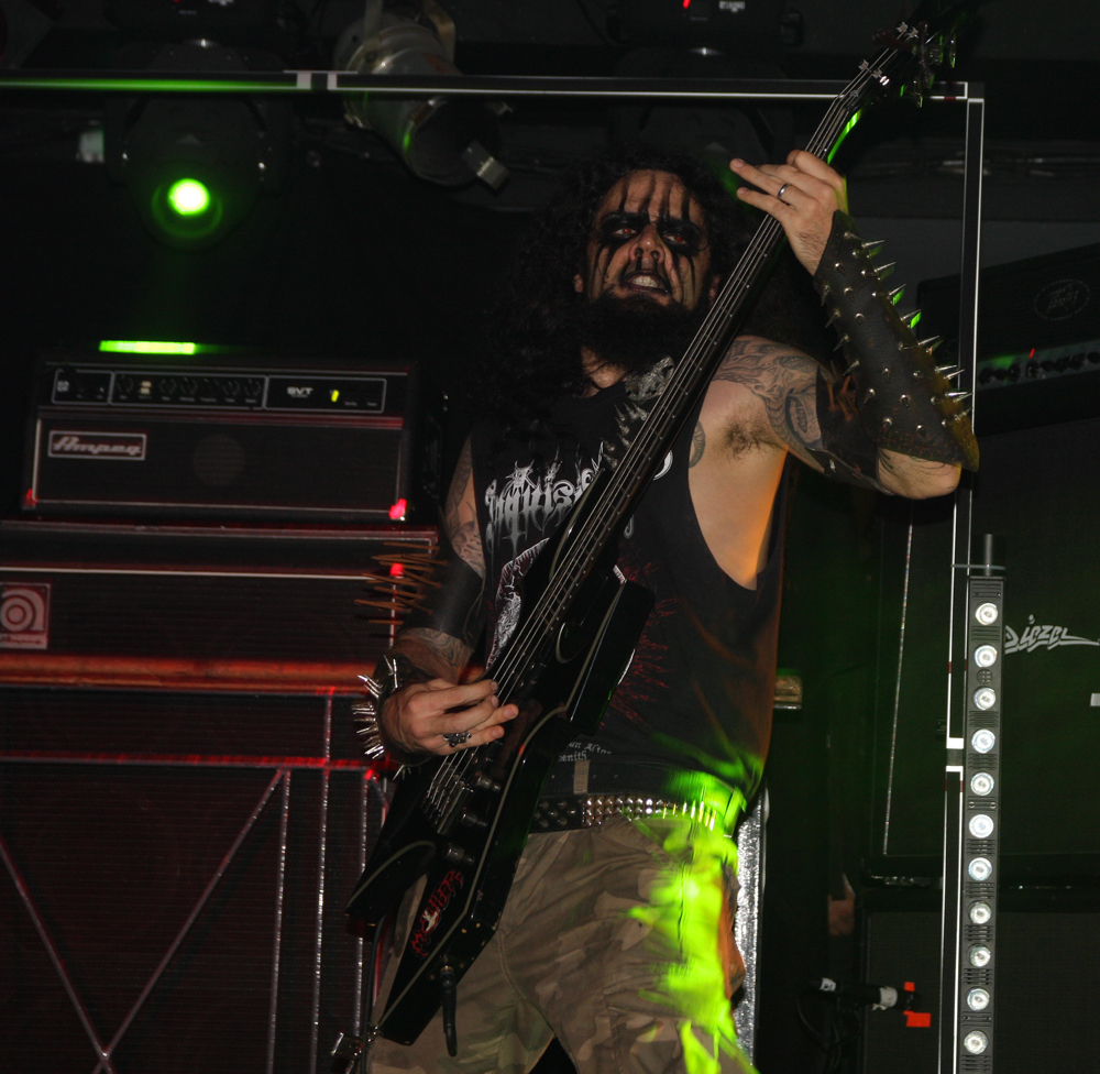 From Chaos They Came and that’s exactly what dastardly duo Inquisition deliver. Mercifully it has emptied just enough to make things slightly more bearable proving that for many Rotting Christ were definitely the main draw. It’s very much a case of ‘ooomph’ as a first thought as Incubus floors it and the drum sound goes straight through the ribcage realigning internal organs on the way. Strumming and croaking like a possessed banshee at the front all eyes are on Dagon and the sound is again immense. We know the pair are capable of making their recorded material sound so damn good in the live arena but it still kind of knocks you for six on witnessing it. Dagon has upped the visual element of the performance by having microphone stands on both sides of the stage so he can to and fro between them. What else can a duo do to entertain, apart of course from battering out satanic hymns in all their dark cloying glory?
