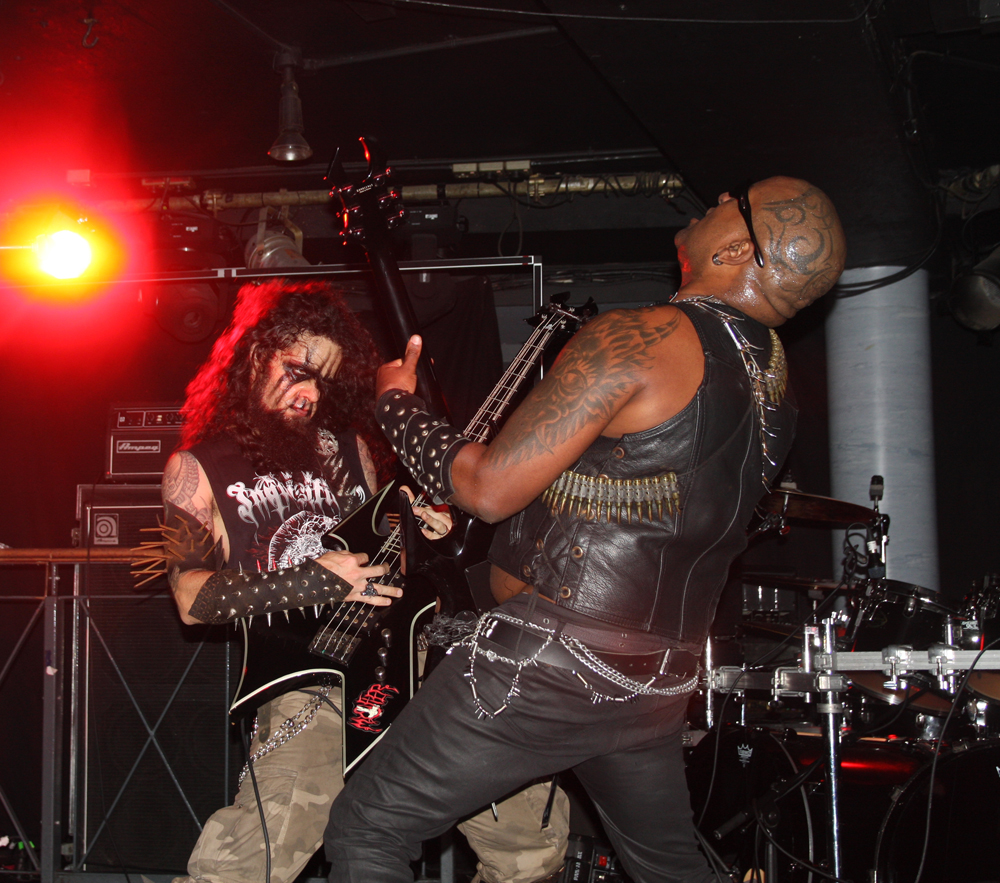 Also making a very welcome return to our shores it’s Mystifier up next all the way from Brazil. No hiding in ice here, they blaze away lit up and hit an immediate groove. Beelzeebubth looking cool as fuck in his shades postures away right in front of me occasionally joining in with Diego for an axe duel, they rasp, scythe and clatter away. They have a more natural thrashing, gnarly sound and get the front ranks banging heads in appreciation, the capital’s South American contingent are out in force and in fine voice with them. Black spell books are opened, rabid cries of Ave Satanas fill the air, there are ghastly cackles as flailing riffs are fired out with abandon. The tyrannical trio are uncouth and get the blood flowing. A nightmare in the form of a Sarcofago cover is unleashed, someone is dragged on stage to bellow to it briefly, I think the band said that he was one of the brothers of one of the original group but don’t quote me on that. There’s a real fervour and red mist as they all trade off each other. Towards the end of the set Diego cranks up the keyboard giving things a creepy and sinister flavour, total kvlt and a blazing set from beginning to end.