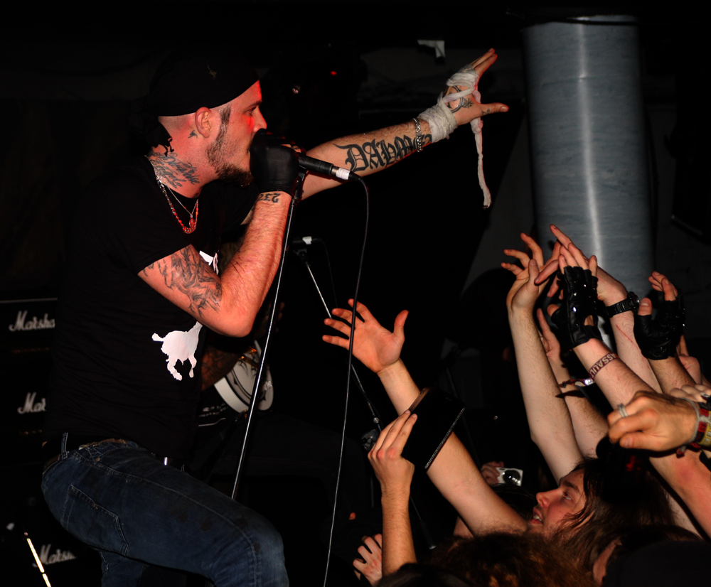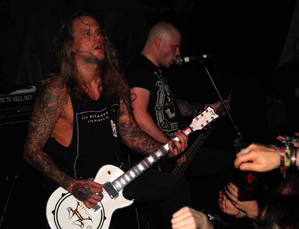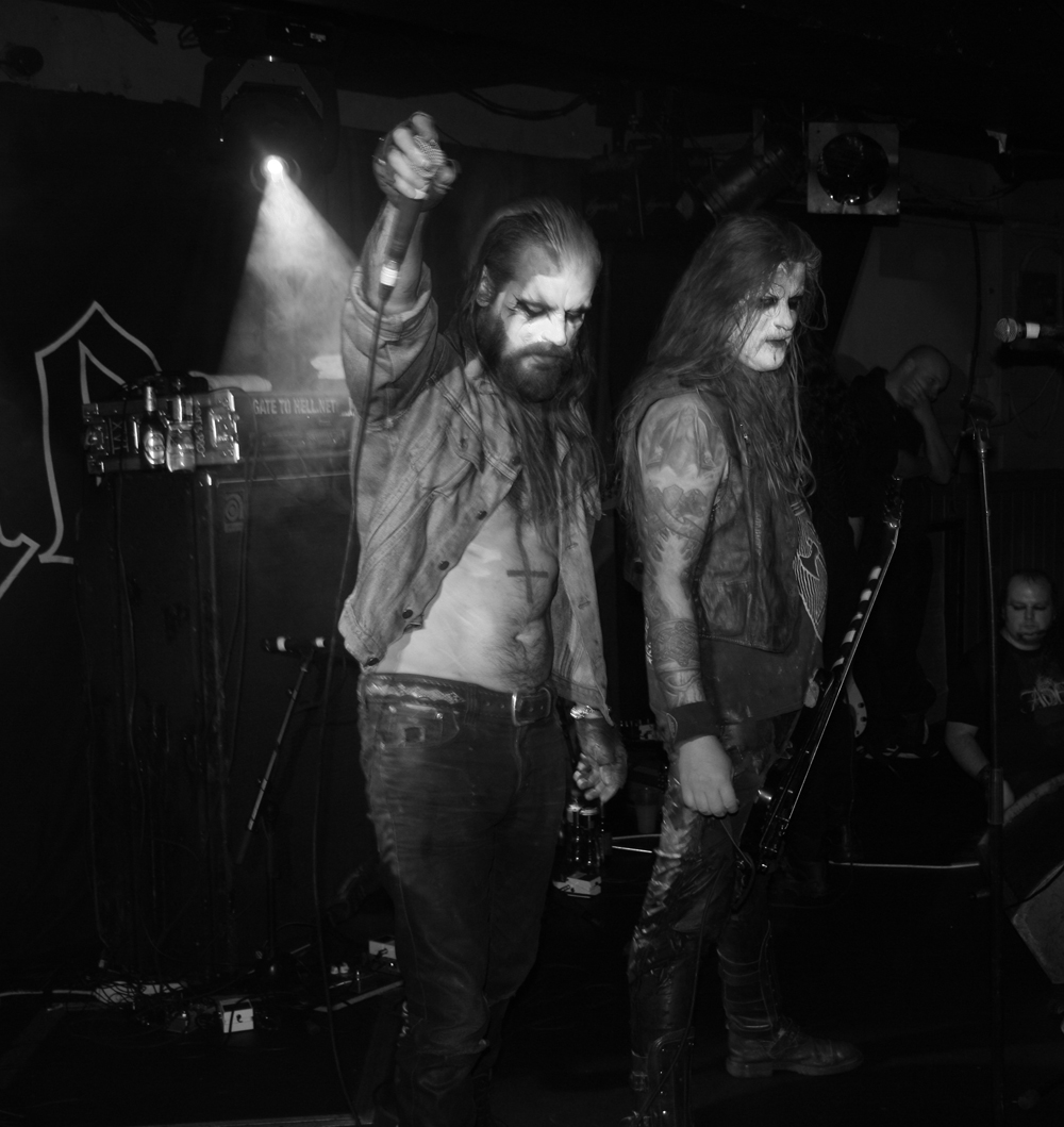 Most people seemed to come back to celebrate 20 years of Shining, unfortunate as this turned out to be in some cases. Not long after the Swedes had taken the stage and started playing and hailing darkness Niklas suddenly stopped things in their tracks shouted out that someone had lobbed a bottle at him and said the show was over. The feckless wonder who had thrown the missile must have done so with some force as I completely missed seeing it (others have since said it was actually a bottle-top or bubblegum) and it’s a damn shame others had not witnessed where it came from and stomped the person right out the venue. After a lecture from the tour manager (I assume) to behave if we wanted the rest of the show the band started up precisely where the song had been curtailed but it was obvious the singer was not at all well. We got an apology from Kvarforth that he was suffering terrible flu but he seemed amicable enough and shared bourbon and germs with those hemmed in at the front of the stage. There’s no shortage of booing and catcalls throughout the show though and it seemed like a fair few baying hyenas had no respect for someone trying their best to put on as great a show as possible whilst suffering incredibly. The bourbon sips rather than normal gulps were probably the only thing keeping him going; let’s face it a Lemsip is hardly going to do anything to take the edge off as he strove through songs like Claws Of Perdition actually having to leave the stage in the capable hands of Hoest momentarily to take a toilet break backstage.