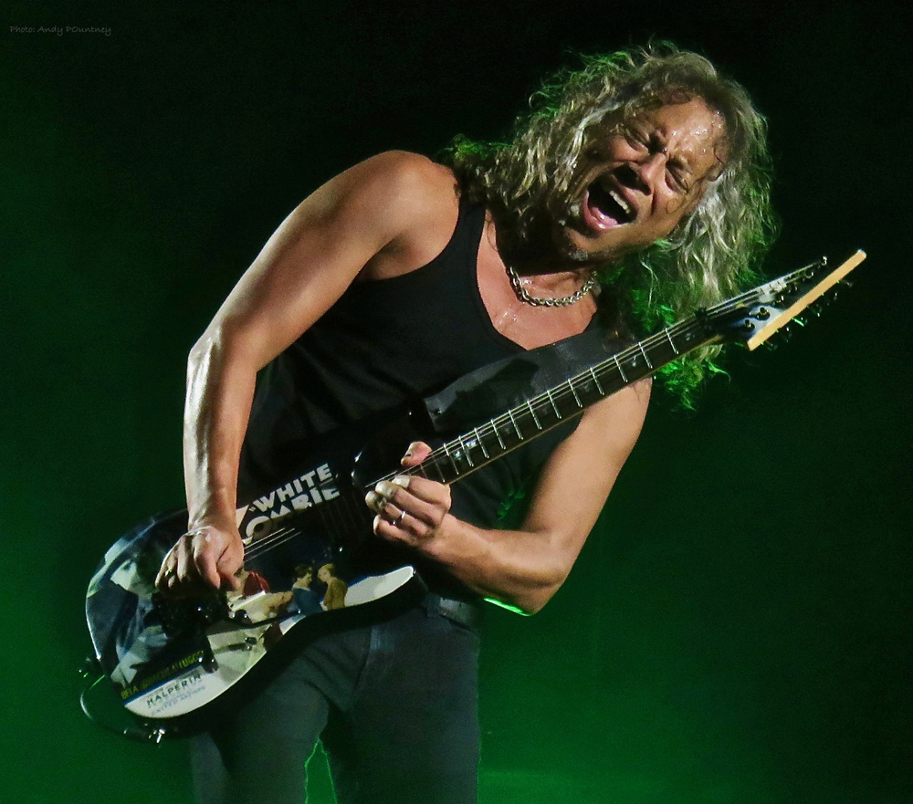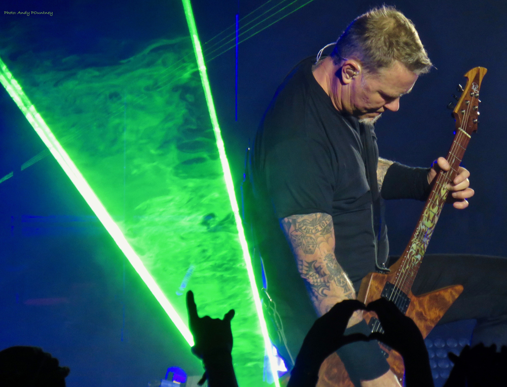 The aggression of ‘Battery’ gave way to ‘Nothing Else Matters’, which was a clever juxtaposition and worked well. The Neon light display on the stage gave way to green lasers setting the right ambience for the track as Lars passed Kirk a drumstick to use instead of a plectrum during the intro. Predictably this failed and Kirk quickly resorted to more traditional techniques! The track saw the band and crowd morph into one with the band taking on a large proportion of the vocal responsibility.
