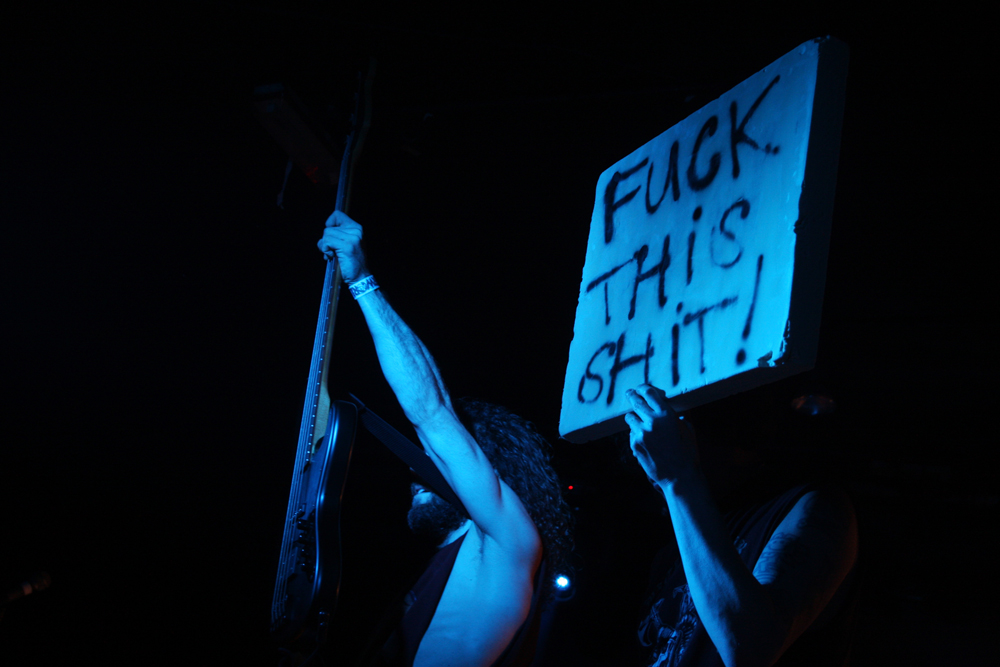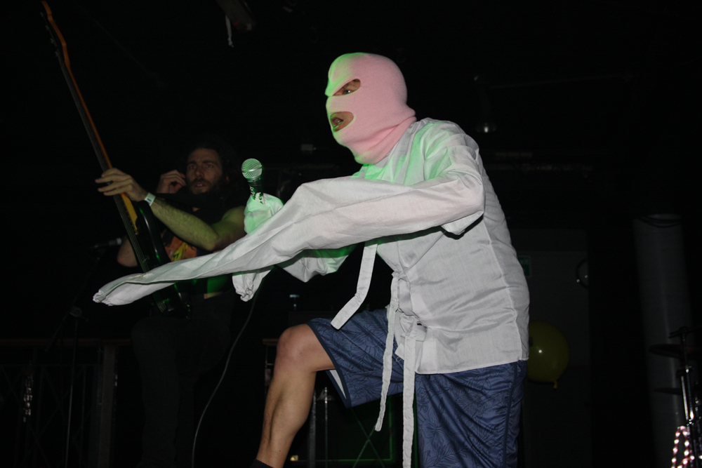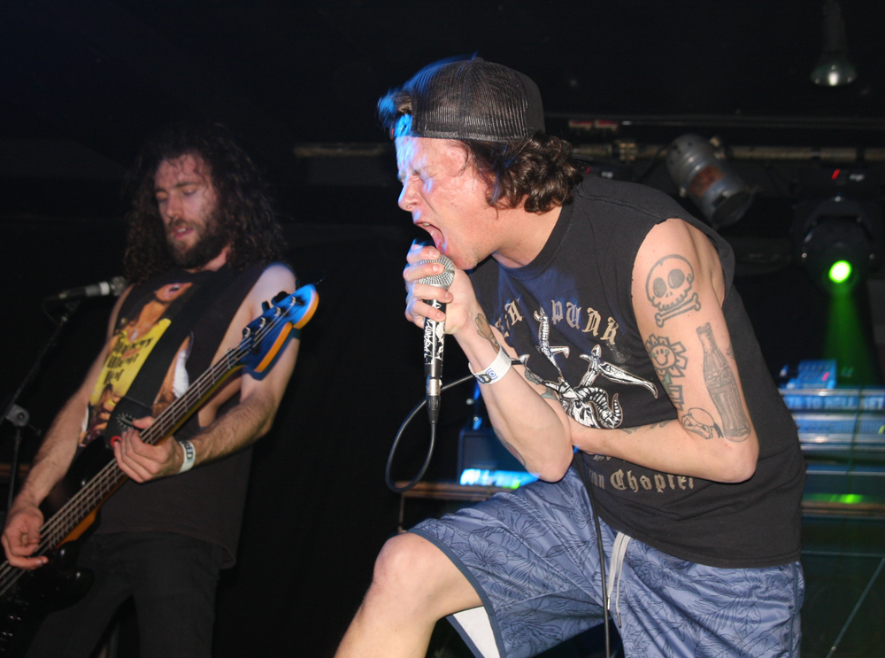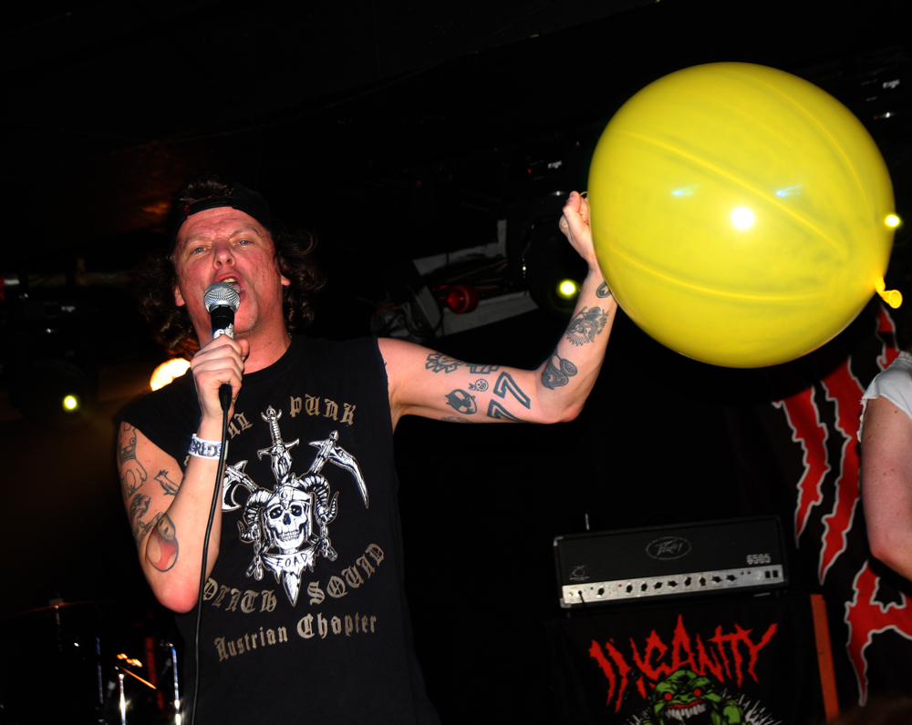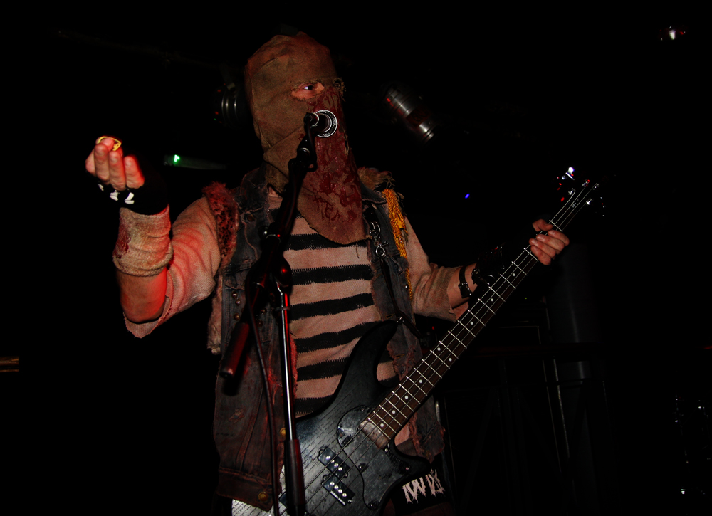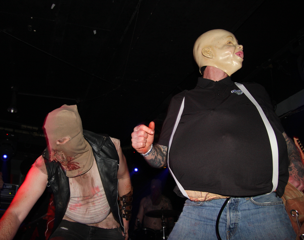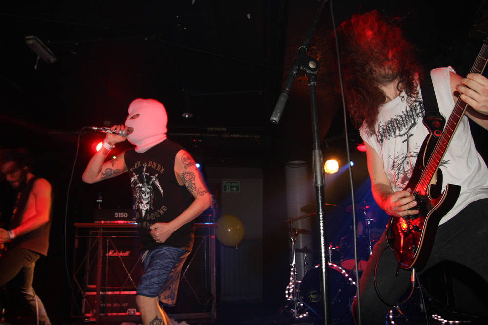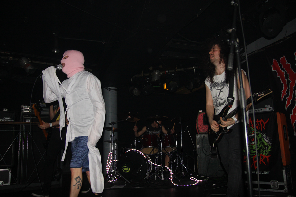 Well Insanity Alert know how to create an entrance! Lead singer of these Austrians Heavy Kevy comes on the stage wrapped in what looks like bandages, wearing a balaclava and wielding giant sparklers all to what appears to be a deranged SNES game playing through the speakers. They crank up the ‘Glorious Thrash’ and it’s well and truly party time for those wanting to mosh and the place although far from packed suitably erupts. Songs are short sharp bursts of crossover thrash with no lack of energy about them as the band tear through as many they can fit in from their two albums over the allotted time. It’s a tried and tested formula but that makes it all the more enjoyable as the old and the new wave of collides like a mangled wreck of M.D.C. and Municipal Waste. Naturally it’s not long until they get a circle pit and those not involved stand around nodding heads and tapping feet with shit eating grins on faces as the band tell us about pacts with Satan along with bizarre stories of pasta afflicted ‘Macaroni Maniac’s. Strangely there’s a touch of vocal blues before we are also told in no uncertain terms that ‘Life’s Too Short’ and everyone seems to agree we may as well go out bruising each other in the pit. There’s songs aplenty about weed and mentions of pizza too but one person not invited to the party is obviously David Guetta as the band ponder how he is still alive? They leave the ‘Metal Punx’ in a bit of a dizzy mess after showering us in bloody confetti and a cheeky Maiden enhanced call of ‘Run To The Pit’ but things are about to get even more foul and disgusting.