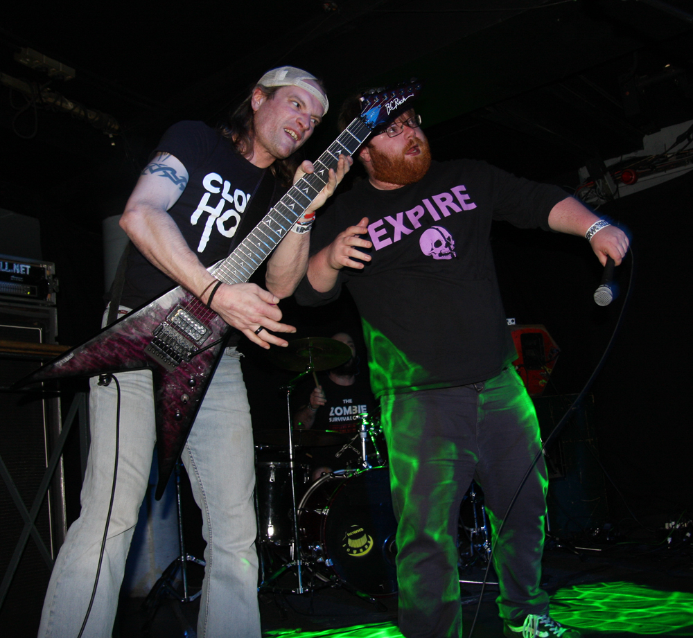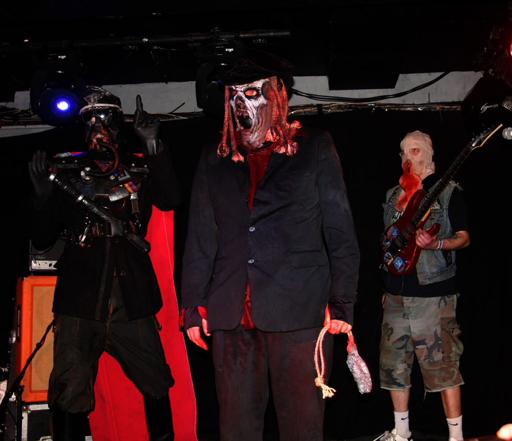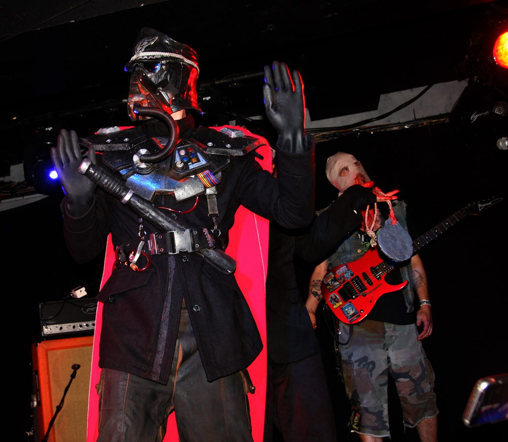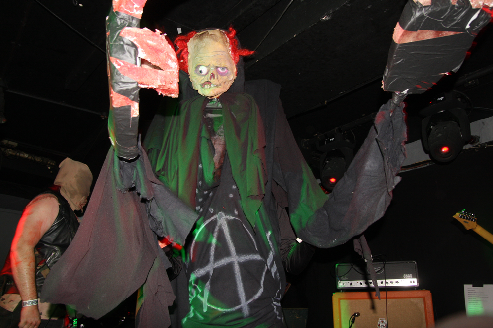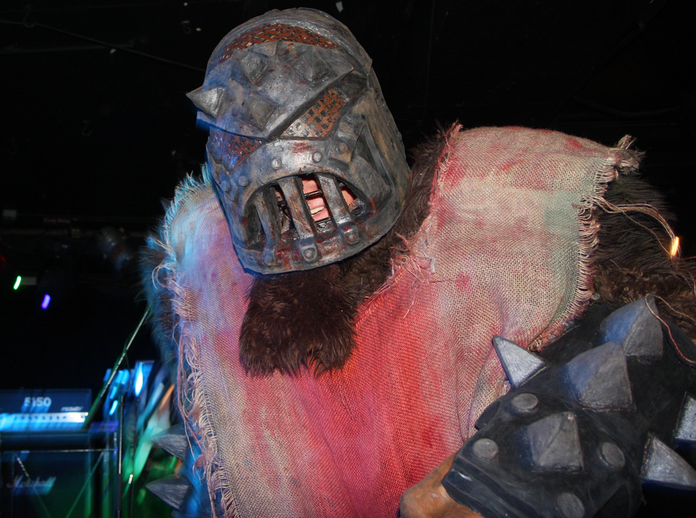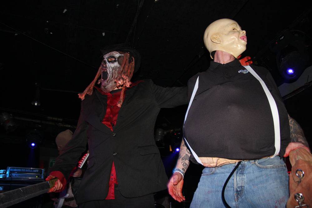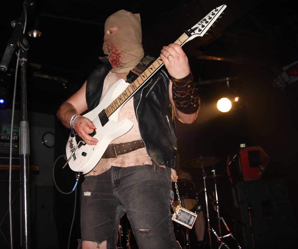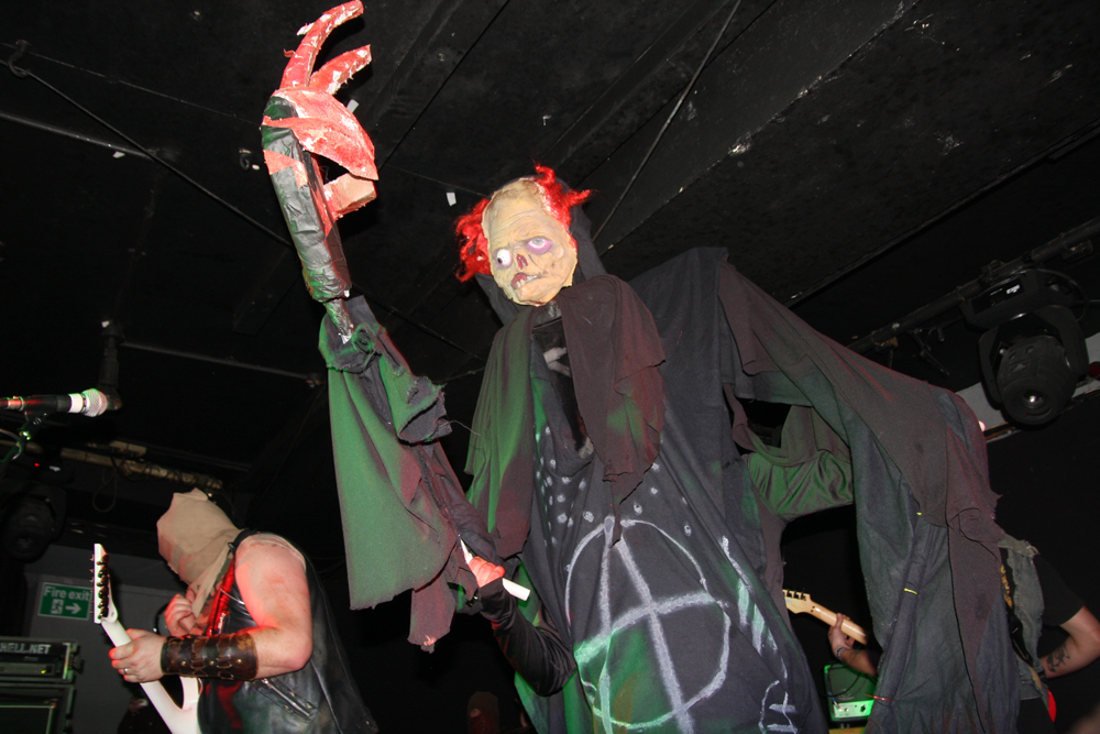 Songs like ‘Off With Their Heads’ and ‘Wall Of Death’ are just asking for trouble. There’s some sort of fascistic sci-fi overlord griming it up and firing shit out of a laser gun (thankfully not actual shit) and getting a much needed pint it is obvious that the bar staff are not aware what is going on and practically duck for cover as I go up wondering if there’s been some sort of fight and is anyone hurt? Walking corpses could be heading their way soon thirsty for other liquid and brains as the band are shredding the dead and turning things into a right old graveyard mosh. Of course it’s all done in the best possible taste. At one point a big, tall nasty thing invades the stage and so does an audience member to grapple with them pulling the costume off much to the annoyance of its wearer. Hang on that wasn’t actually staged and there is nearly a punch up, somehow the band manage to carry on playing through it all. Although the gimmicks are great fun the band can walk the talk and do so without interruption over a couple of numbers before some massive hairy beast has a turn at causing mass carnage. As the casket draws to a close another gruesome fiend limbers on with his balls hanging out carrying a gutbucket and sharing the contents with us liberally. For some reason no matter how much I tried nobody would engage in conversation with me on the way home, in fact a couple of people actually run away. Luckily I made it back without arrest and although it’s not the 1st time I have left the venue in this sort of state it was the most fun all round. If these Ghouls ever return I’ll be back and may even bring my own bucket of offal