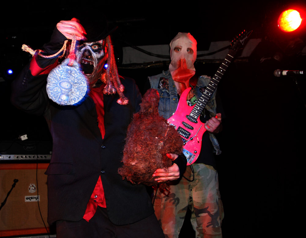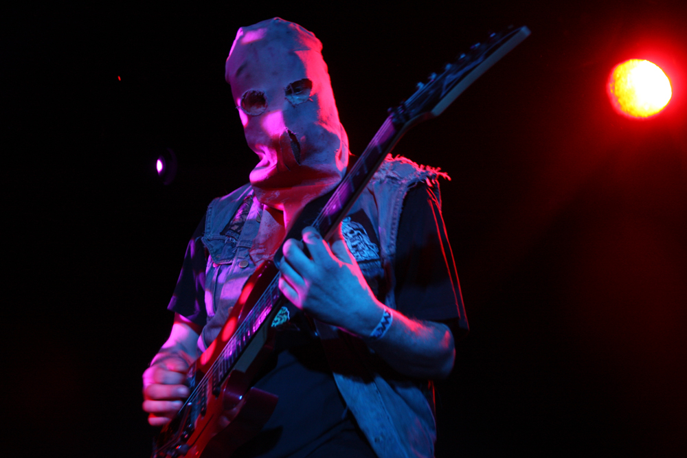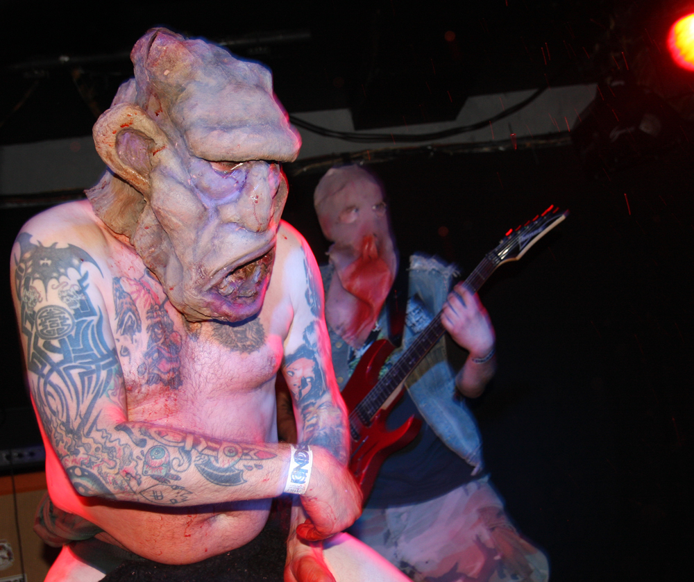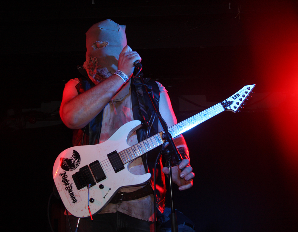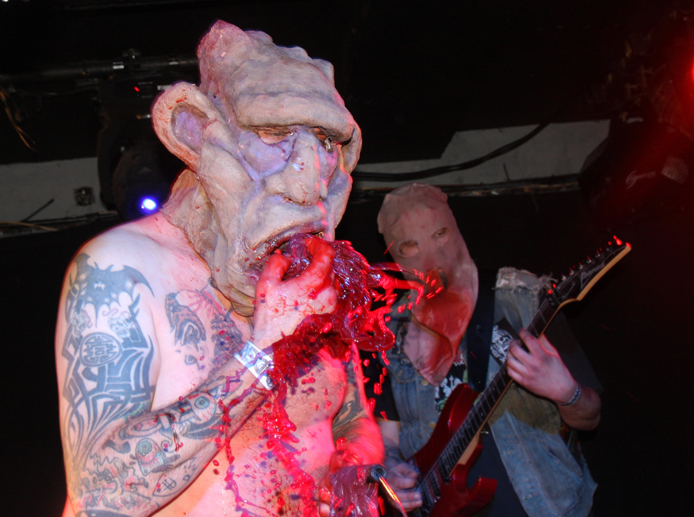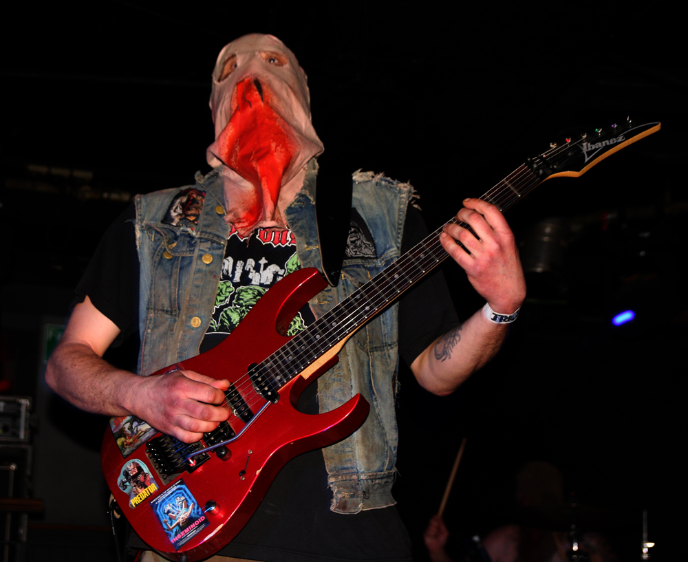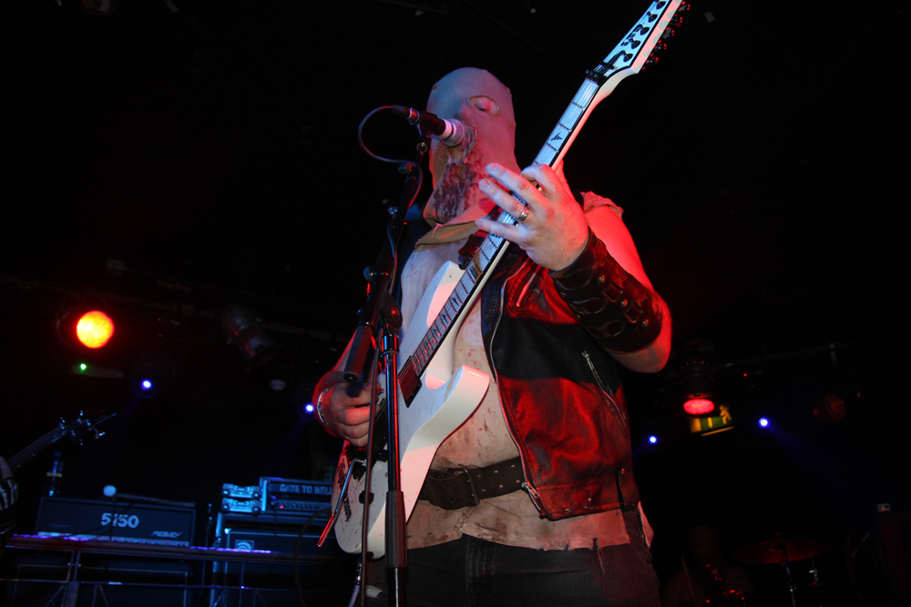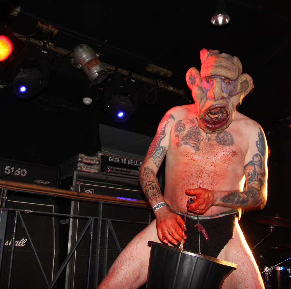 You know it’s not going to be a normal show when a big ugly skinhead gets on stage, mouths off and gets his entrails ripped out by a Rasta with a very large blade. Naturally the gore showers anyone in the vicinity of the front but as the monitors had been covered with plastic anyone caught out only had themselves to blame. I have never seen Ghoul, apparently they did play here 4 years ago and I had at least caught the now sadly (it would seem) on ice Impaled when they visited many years ago. For those not knowing the faces behind the sackcloth mask, of corpse they share some of the same members as well as those up to their nuts in the guts of Exhumed and Engorged too. The Creepysylvanian Ghoulunatics kick things off in style and get into a thick and rugged groove which we listen and bang heads to as all manner of bloody pantomime ensues on stage. As songs like Bringer Of War from new album Dungeon Bastards prove despite spectacle they can throw out a damn good tune too and quickly get people skidding on claret down the front. Meanwhile we have some sort of voodoo priest on stage waving some sort of horrible looking hairy bag around. Cutting it open we get another impromptu shower but licking my lips I do believe it was a baptism in red wine, very nice!