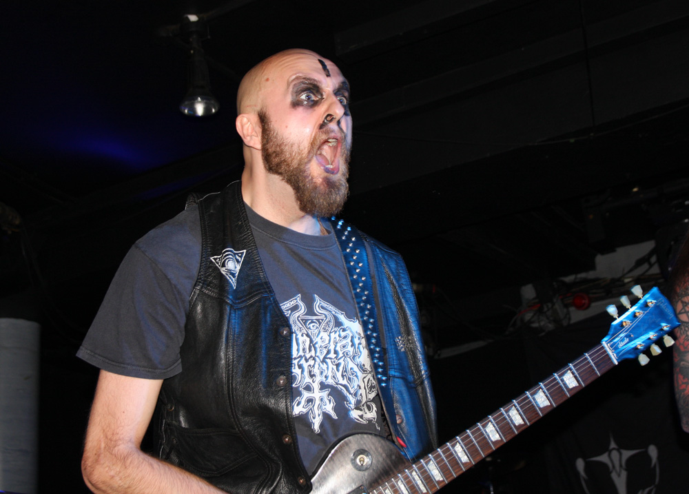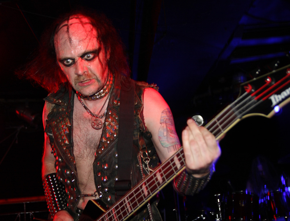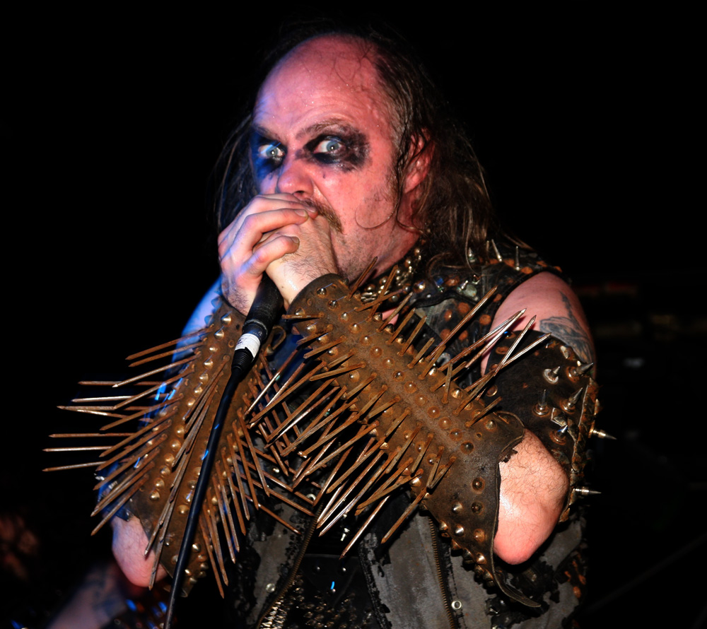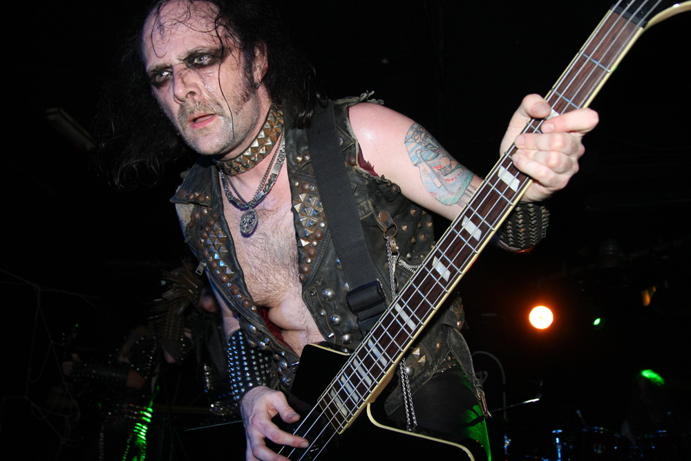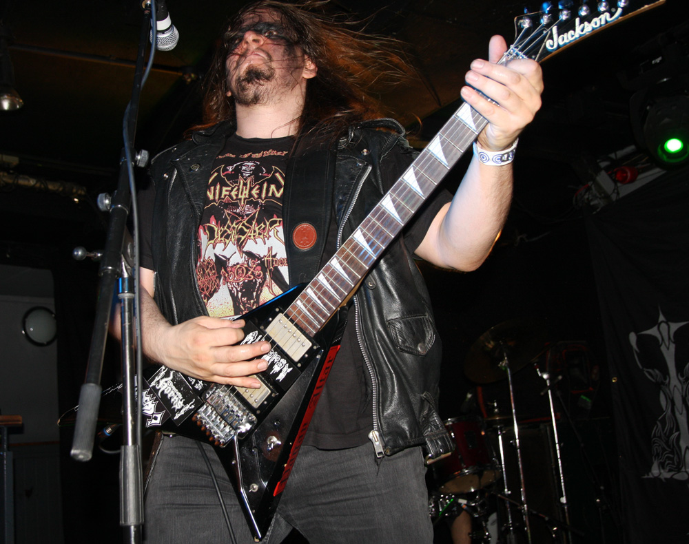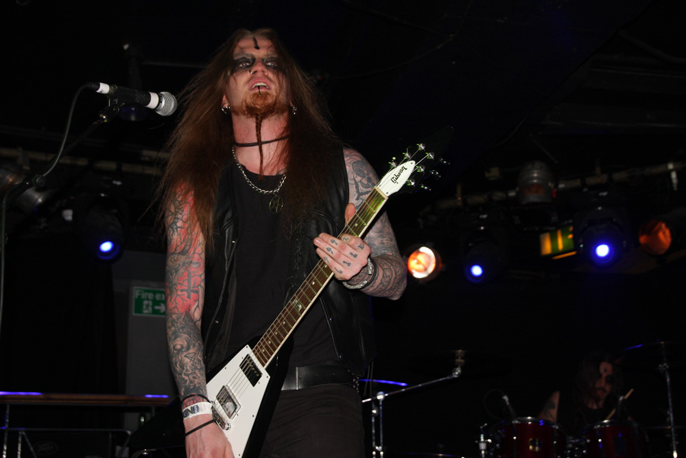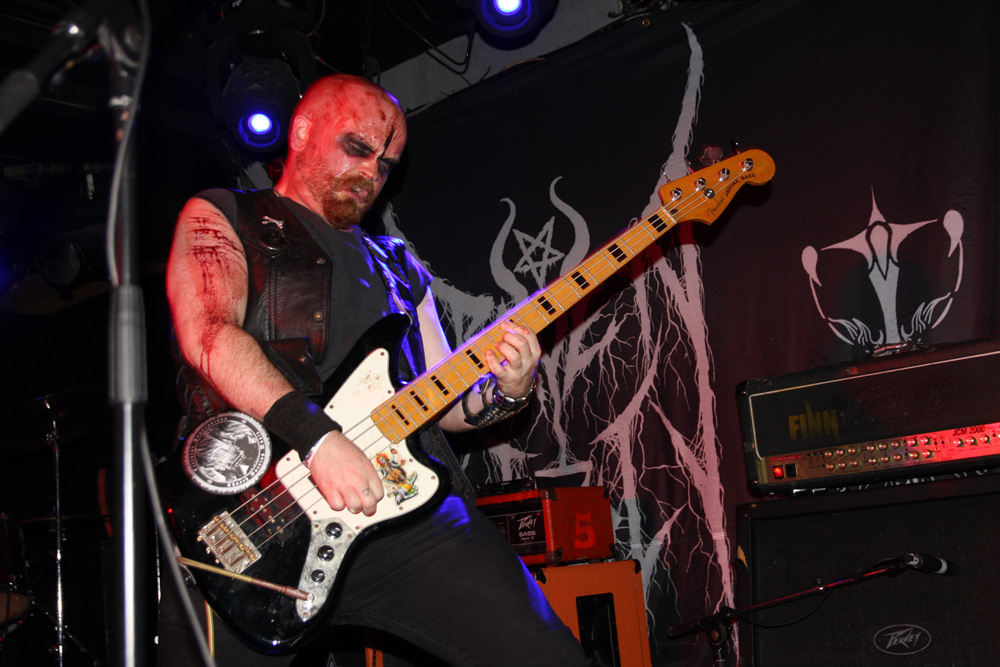 Before they ravaged us with their molten Swedish black-thrash fury though, it was time for a couple of hand-picked bands from the UK in support. Looking at past reviews it seems like it was 2014 when I last caught both these bands in action. First up are Funeral Throne and as soon as they were in front of me memories came flooding back, they are simply not the sort of band you can easily have forgotten seeing before. That’s due to their somewhat mad and exuberant stage display. The lead singer J Wilcox is normal enough and grounds things as he ferociously plays and barks out his parts but either side of him the bassist and guitarist put on a somewhat deranged display as though they have a real blood-red mist going on in their heads. Blood is very much part of it too smeared hand-prints over the set-list and covering the arms of the bassist who has obviously just cut himself just before coming on. The Wolverhampton based act featuring members of Towers Of Flesh and Haizum take us on a full-tilt ride with a black thrashing demeanour but some serious metallic licks giving them a bit of a classic metal vibe amidst the rough-hewn extremity. There’s plenty of grit about songs like ‘Through Transforming Fire’ and no shortage of barraging thunder to head-bang away to. At one point the bassist contorts himself hunched over his instrument, completely losing himself in the essence of playing as the other two turn backs on audience facing the drummer furrowing away. The supports only had a half hour set but as Funeral Throne climax with ‘Victory’ there’s a certain amount of just that in the air.
