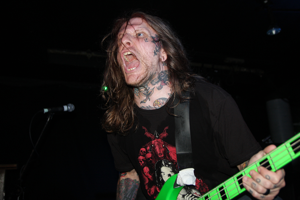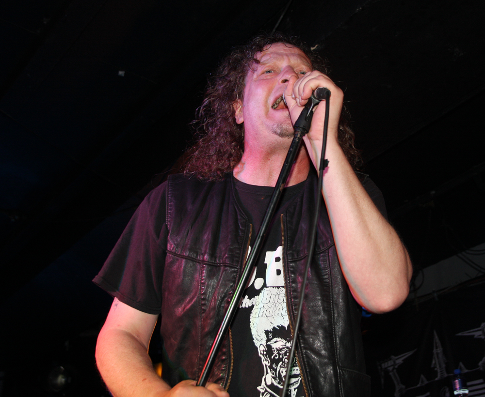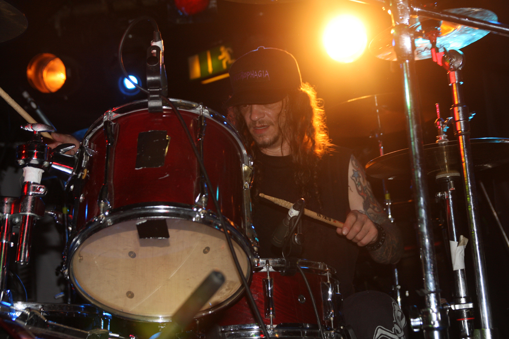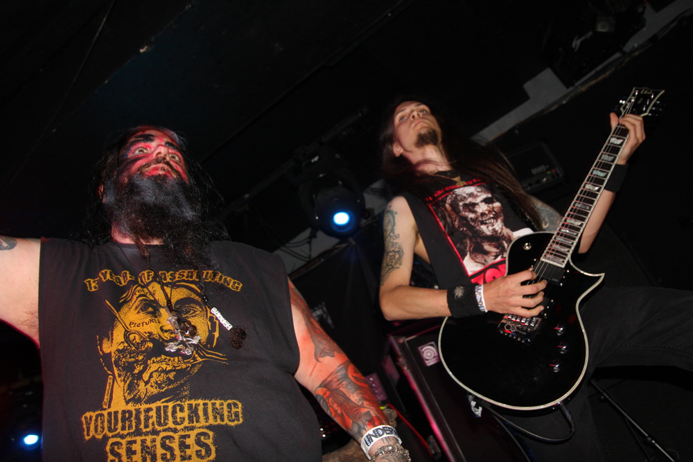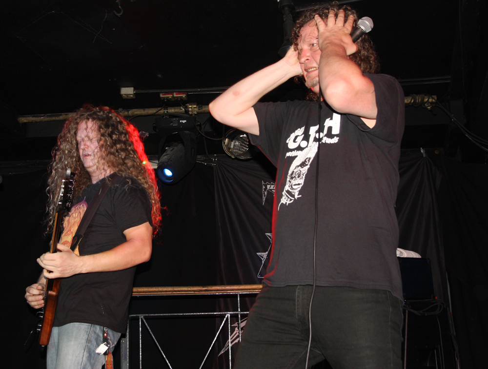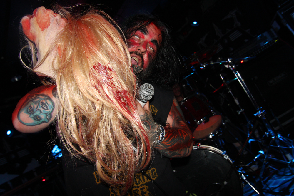 Doors are delayed as Nuclear who are meant to be on first tonight are MIA, it appears the Chilean thrashers are delayed at border control. So after much drinking time we stumble into the Underworld relieved to get out the baking heat and hug the air conditioning for grim life. It’s been a while since Necrophagia last managed to get over here, their last date scuppered. They managed to get over to Europe to play with I Am Morbid which did not hit the UK and then piggyback on these dates with Voivod. We are hungry for blood and it’s obvious they are keen to provide it as they come on to ‘Upon Frayed Lips Of Silence,’ Killjoy thrusting various body parts (not his) in the faces of those gathered at the front. Meaty goblets of gore rain down with grinding riffs, pummelling drums and sickening vokills. Dead skin is literally flayed and the audience are quick to get in the mood of this veritable blood feast. Necrophagia are no pretenders to the throne of horror and revel in it like no other group, every song is a veritable mini movie and our capital city gets its own tribute in the form of ‘London 13 Demon Street’ thankfully it is all done in fun as we have had far too many horror stories of our own to contend with lately. A head is brought out among harvested organs and rubbed lovingly by the front man, at one point it is too much for an audience member who quickly jumps on stage and gives it a rub himself before being chased off by security.