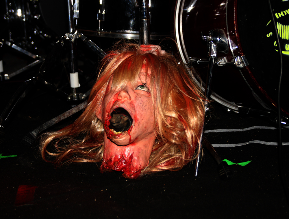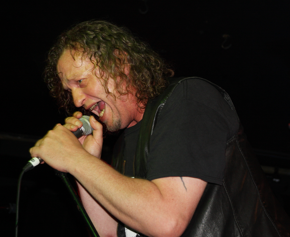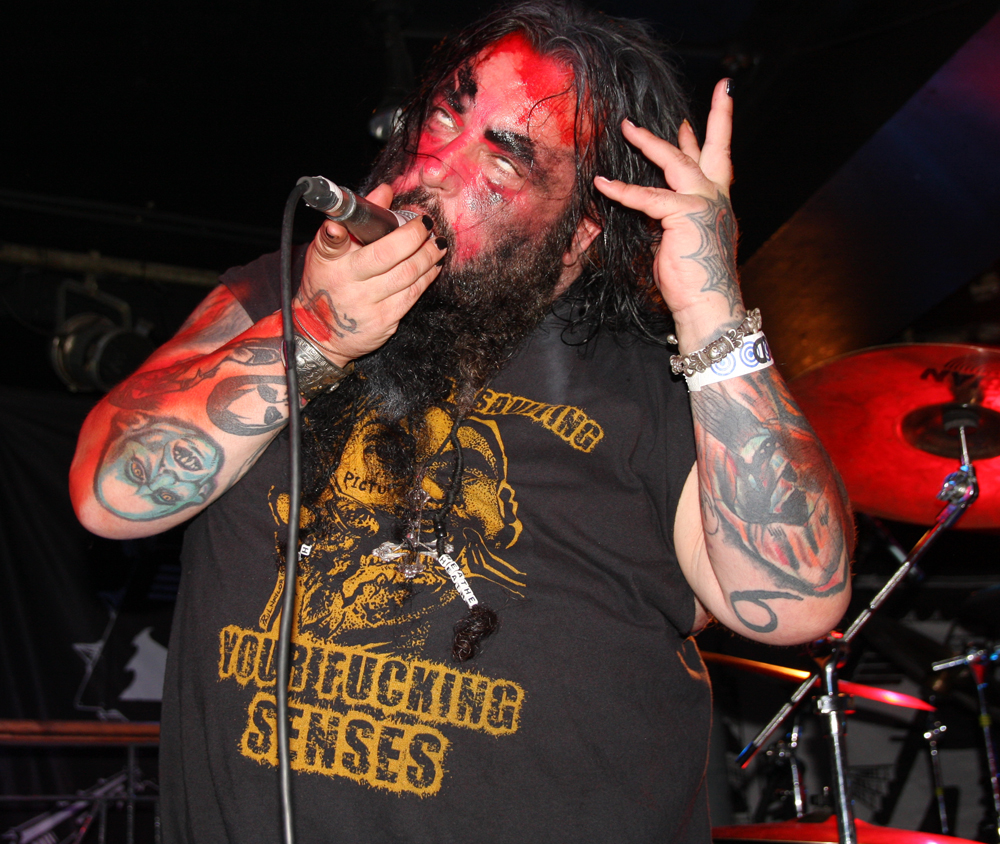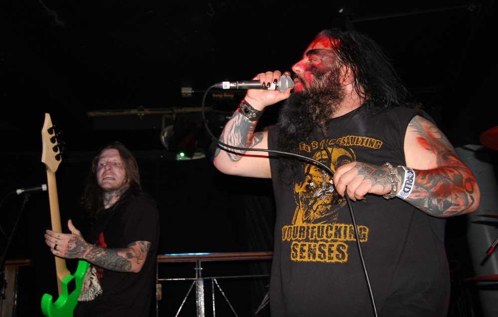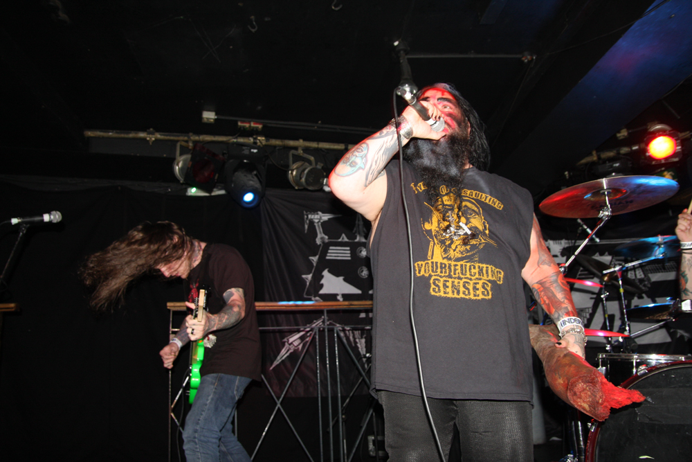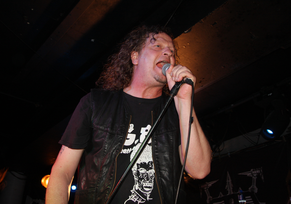 Doors are delayed as Nuclear who are meant to be on first tonight are MIA, it appears the Chilean thrashers are delayed at border control. So after much drinking time we stumble into the Underworld relieved to get out the baking heat and hug the air conditioning for grim life. It’s been a while since Necrophagia last managed to get over here, their last date scuppered. They managed to get over to Europe to play with I Am Morbid which did not hit the UK and then piggyback on these dates with Voivod. We are hungry for blood and it’s obvious they are keen to provide it as they come on to ‘Upon Frayed Lips Of Silence,’ Killjoy thrusting various body parts (not his) in the faces of those gathered at the front. Meaty goblets of gore rain down with grinding riffs, pummelling drums and sickening vokills. Dead skin is literally flayed and the audience are quick to get in the mood of this veritable blood feast. Necrophagia are no pretenders to the throne of horror and revel in it like no other group, every song is a veritable mini movie and our capital city gets its own tribute in the form of ‘London 13 Demon Street’ thankfully it is all done in fun as we have had far too many horror stories of our own to contend with lately. A head is brought out among harvested organs and rubbed lovingly by the front man, at one point it is too much for an audience member who quickly jumps on stage and gives it a rub himself before being chased off by security.