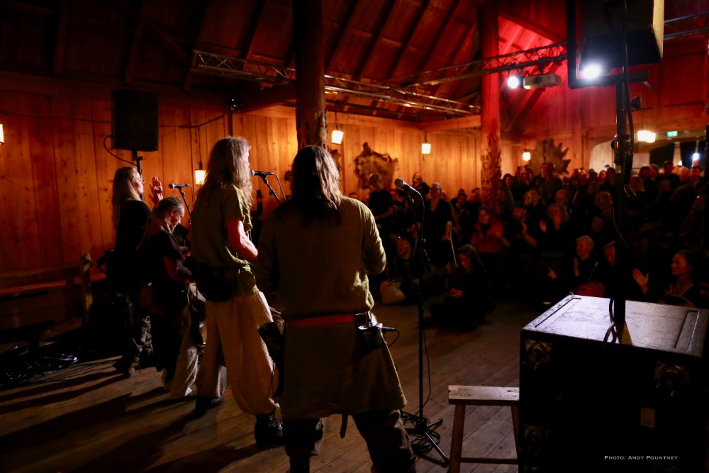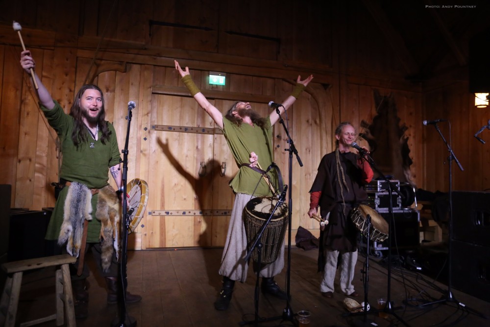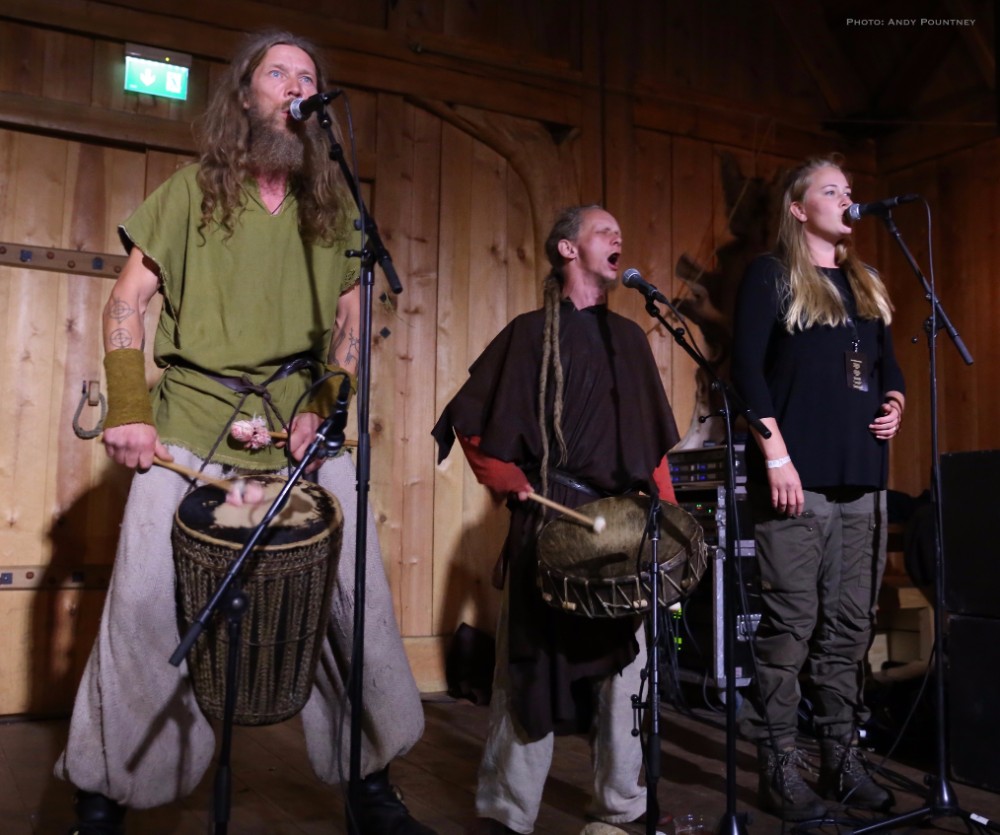 I decided that if I wanted to see Folket Bortafor Nordavinden in the Gildehallen I’d best get in there early which proved to be wise decision. As a three piece the main guy made the audience cheer as though they’re the best band in the world at least three times before playing anything. With the band having played numerous times already during the festival it was explained that they rarely know what will happen as they started with vocals only. Percussion was added and Ingrid, from Songleikr, joined them on stage and was magnificent. She had the audience completely in the palm of her hand, clapping when she asked as the song was improvised and intensified. Her voice was compelling as she swung her hair about animatedly, not head banging as such bringing the song to a close with much cheering. That was supposed to be the end of the 20 minute set but they stayed to do something else as the main guy started jumping about and he got the crowd to chant Freja which was surreal. Some guy stood on a table at the back, some woman who was on crutches suddenly ditched them then it suddenly ended and we all buggered off.