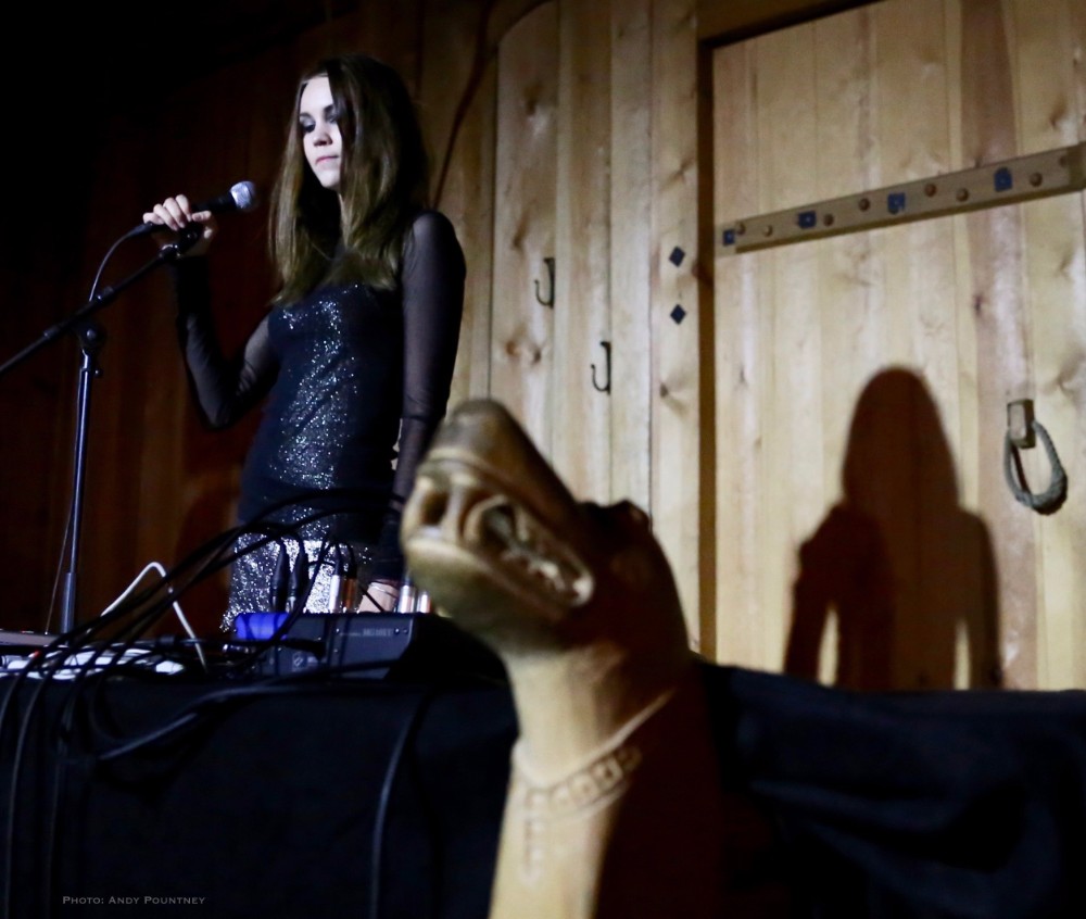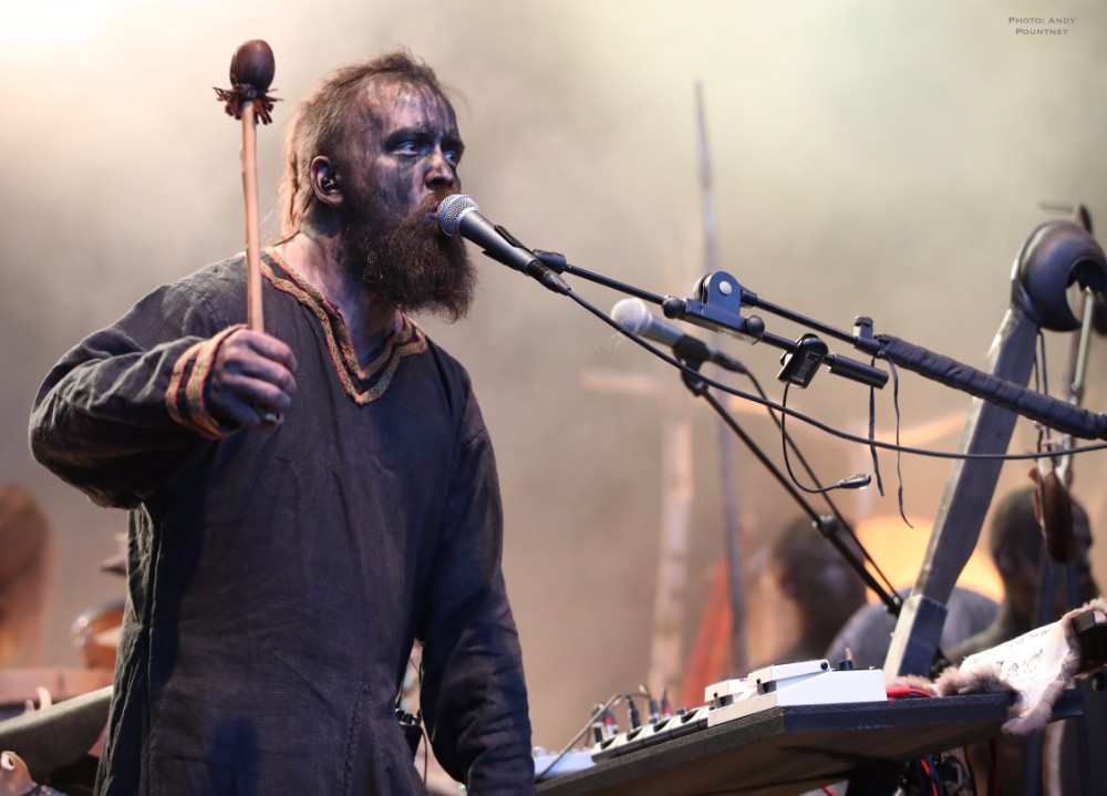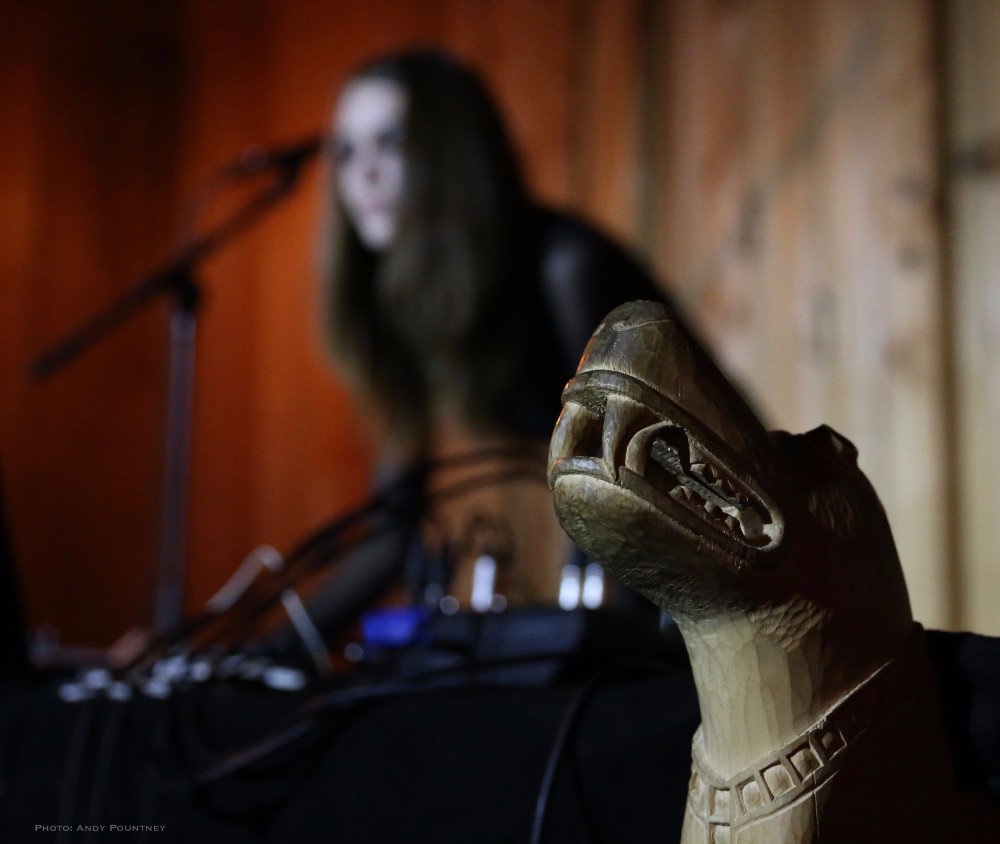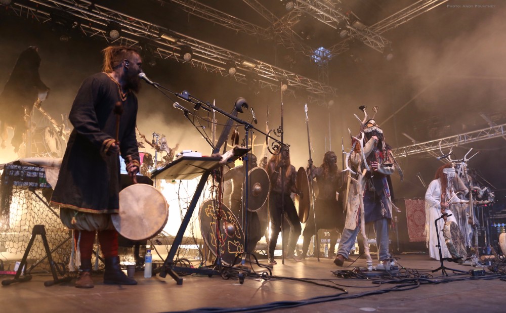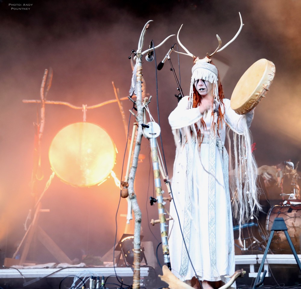 Heilung were a whole new proposition to me, and reading the information in the program it told me that the ‘sounds of Northern European iron age and Viking period soundscapes are created from samples of reconstructed swords, shields, ancient frame drums, bronze rings and human bones’. Watching the stage set up unfold I was curious and a little bemused as to what this would entail as the stage became ever more complex and intricate which you will see in the photos more than I can describe in words here. Added to that is the number of personnel that initially consisted of five people dressed in various intricately decorated and very different costumes. The set started with the five members standing in a circle holding hands with smoke being wafted towards the crowd, and as the circle broke a horn sounded and a vocal chant started that triggered some percussion by one of the other members who returned to the rear of the stage. As the performance was underway lots of people started to arrive in the audience also dressed up for the occasion as more instrumentation was added to the unfolding mix which was gathering momentum when suddenly one of the stage members howled like a wolf that was immediately imitated by the audience in waves. There was an obvious clash of cultures going on here much like acts such as Wardruna as the stage became invaded by people sporting spears and shields. The lady wearing white antlers had an exceptional voice though whether it was effect laden I am not sure as her tones were echoic but well suited to the tribal like intent of the music. The spear wielders were coated in mud or paint and came forward as the music’s ritualistic and percussive texture was hypnotic and if I closed my eyes and ignored the visual spectacle I quite enjoyed it. The spear wielders came forward to another platform so the audience could see them better and they did look very cool and intimidating as the music had took on an industrial edge due to the percussion and at one point there was an almost trance like beat that was very effective as I decided to head into Gildehallen to catch Lamia Vox to make sure I got in based on previous experiences with that venue.
