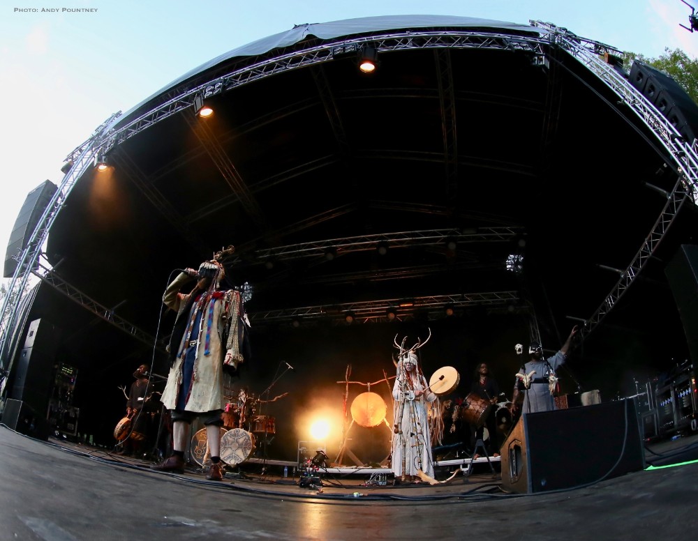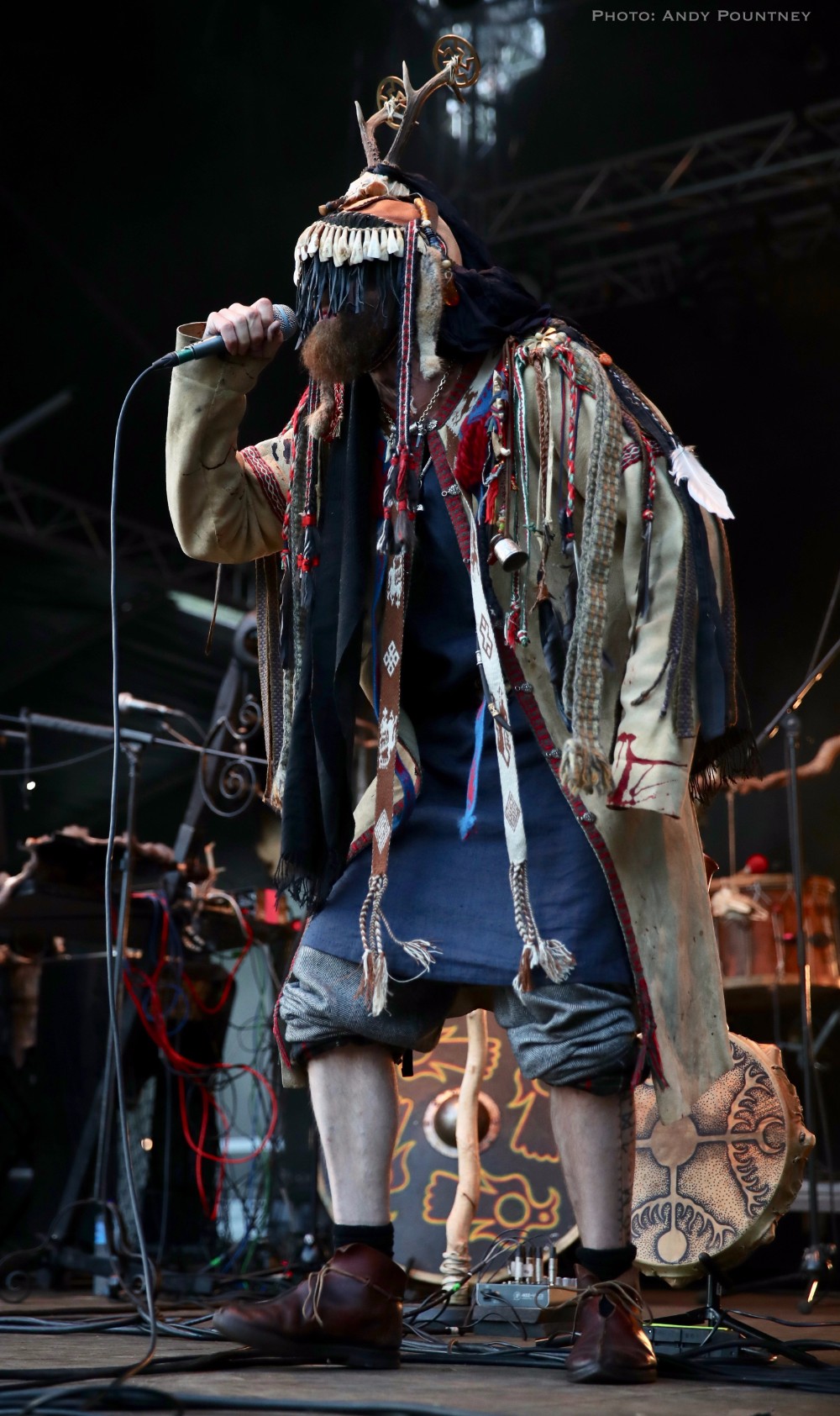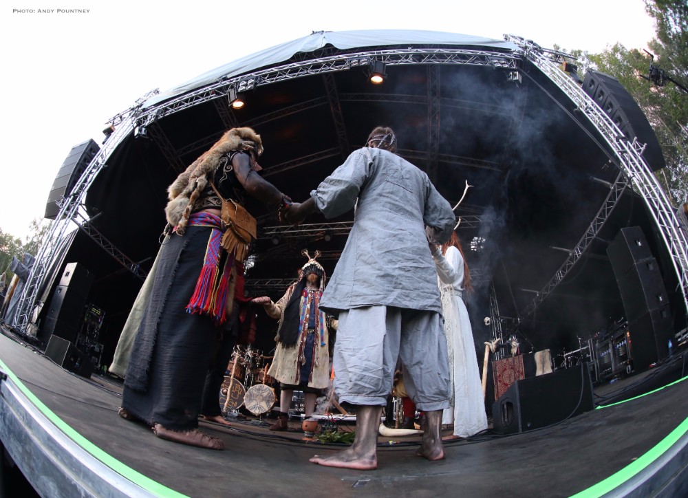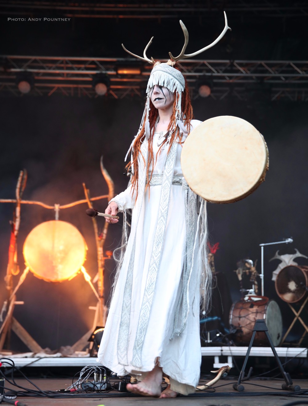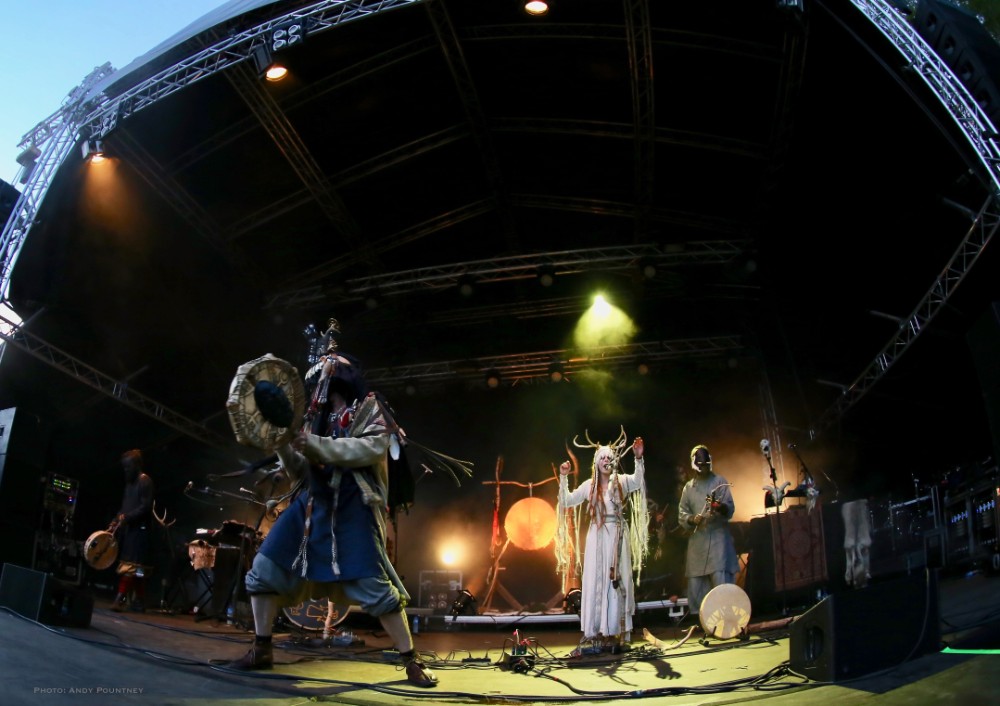 Heilung were a whole new proposition to me, and reading the information in the program it told me that the ‘sounds of Northern European iron age and Viking period soundscapes are created from samples of reconstructed swords, shields, ancient frame drums, bronze rings and human bones’. Watching the stage set up unfold I was curious and a little bemused as to what this would entail as the stage became ever more complex and intricate which you will see in the photos more than I can describe in words here. Added to that is the number of personnel that initially consisted of five people dressed in various intricately decorated and very different costumes. The set started with the five members standing in a circle holding hands with smoke being wafted towards the crowd, and as the circle broke a horn sounded and a vocal chant started that triggered some percussion by one of the other members who returned to the rear of the stage. As the performance was underway lots of people started to arrive in the audience also dressed up for the occasion as more instrumentation was added to the unfolding mix which was gathering momentum when suddenly one of the stage members howled like a wolf that was immediately imitated by the audience in waves. There was an obvious clash of cultures going on here much like acts such as Wardruna as the stage became invaded by people sporting spears and shields. The lady wearing white antlers had an exceptional voice though whether it was effect laden I am not sure as her tones were echoic but well suited to the tribal like intent of the music. The spear wielders were coated in mud or paint and came forward as the music’s ritualistic and percussive texture was hypnotic and if I closed my eyes and ignored the visual spectacle I quite enjoyed it. The spear wielders came forward to another platform so the audience could see them better and they did look very cool and intimidating as the music had took on an industrial edge due to the percussion and at one point there was an almost trance like beat that was very effective as I decided to head into Gildehallen to catch Lamia Vox to make sure I got in based on previous experiences with that venue.