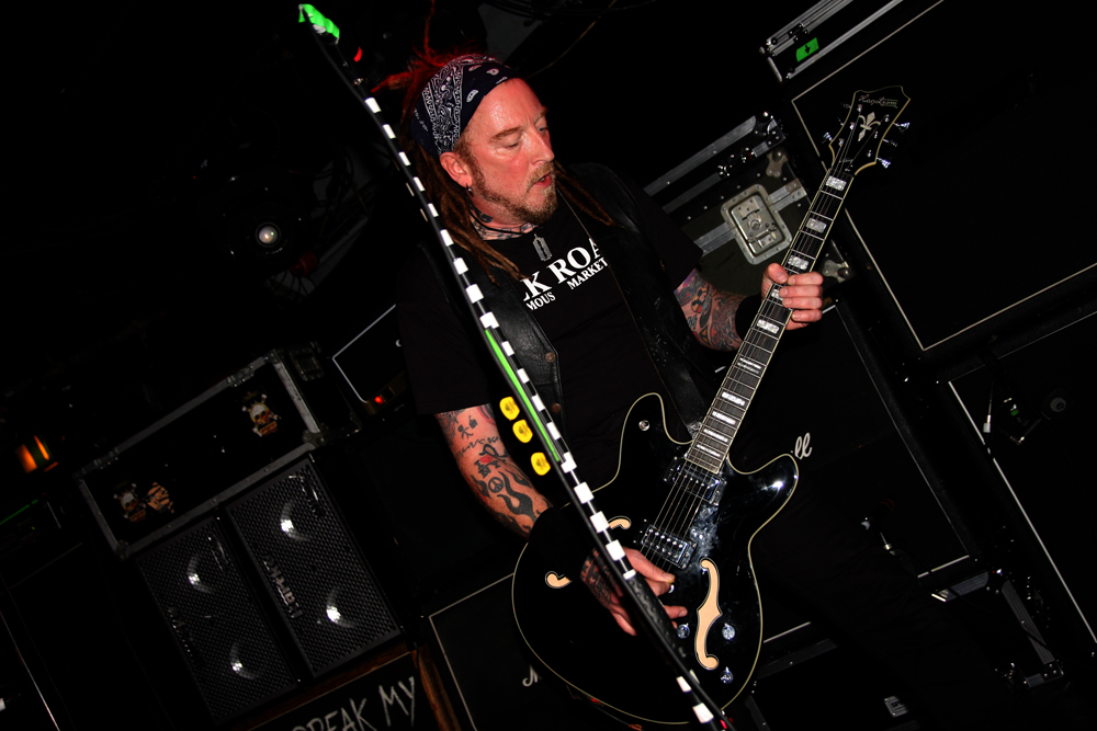 Still far emptier than a gig like this deserves to be. I guess the hyper-volatile musical nature of Mutation is not for all but the hardiest but there’s a fair few Wildhearts T-Shirts being sported and I expect this to mess with more than a few minds. The question is, like it was with the previous band, how the hell to replicate the sonic cluster-fuck of material from the albums onto the stage? Well the simple answer is that basically they don’t.  None of the album guests are present such as the aforementioned Mark E, Jon Poole (Cardiacs) Shane Embury (Napalm Death) and that’s kind of to be expected. Stripped down to a trio Ginger is joined by Denzel on drums (with kit pushed right to front of stage) and Scott Lee Andrews on bass. There’s a rack of guitars to choose from and a wall of monitors. I expected them to replicate the heavy electronic miasma via backing tracks but that really wasn’t the modus operandi either although some very annoying between song squalls sounding like an out of control fighter plane were utilised. Its fast and furious once they launch into first number ‘Authenticity’ but if that is what you are looking for in the way of it replicated from the album you are not going to find it here. This is more a case of thrashing the songs out, admittedly within an inch of their lives but the processing and production work found on the albums simply are not at all apparent in the live format. For me it just doesn’t work. The intensity just cannot be replicated here and it sounds messy as hell. In a way it is much more punk rock and DIY in ethos here, which a lot of the time would be great but the songs are shells of themselves. Ginger shouts and yells and works his well-documented demons out through numbers like ‘Friday Night Drugs’ but you feel like the dealer has kind of mixed what you were expecting with some particularly nasty shit.