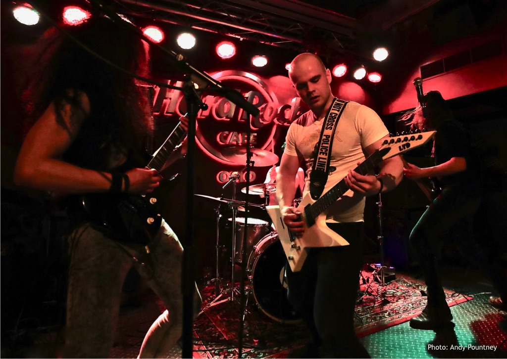 After 45 minutes, the band closed their set having given a good account of themselves and they could certainly have a bright future if they continue to build on this strong foundation. Label mates Tantara followed shortly after with their slightly more aggressive thrash offering. Having been around since late 2009, they brought a more experienced edge to the stage as they opened with ‘Punish the Punisher and ‘Sum of Forces’, the title track of the yet to be released album. As the set progressed I found myself comparing them with early Exodus, and perhaps nods towards Evile or Onslaught. Midway through the set, older track ‘Mass Murder’ was pulled out of the bag and went down well, although it was surreal watching a thrash band in Hard Rock Cafe, overlooked by memorabilia from bands such as U2, The Rolling Stone and The Who.