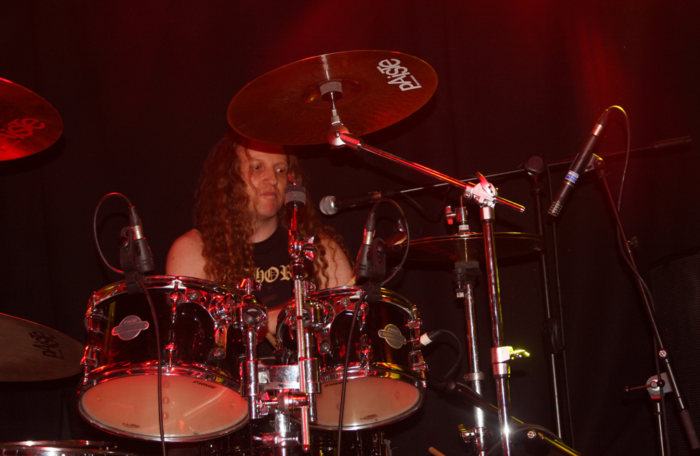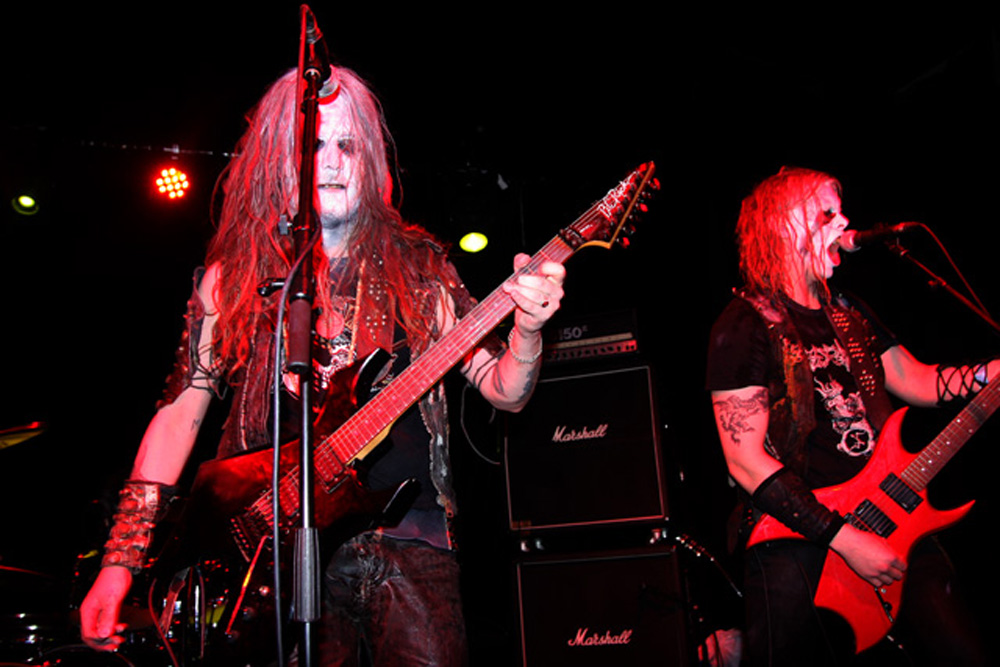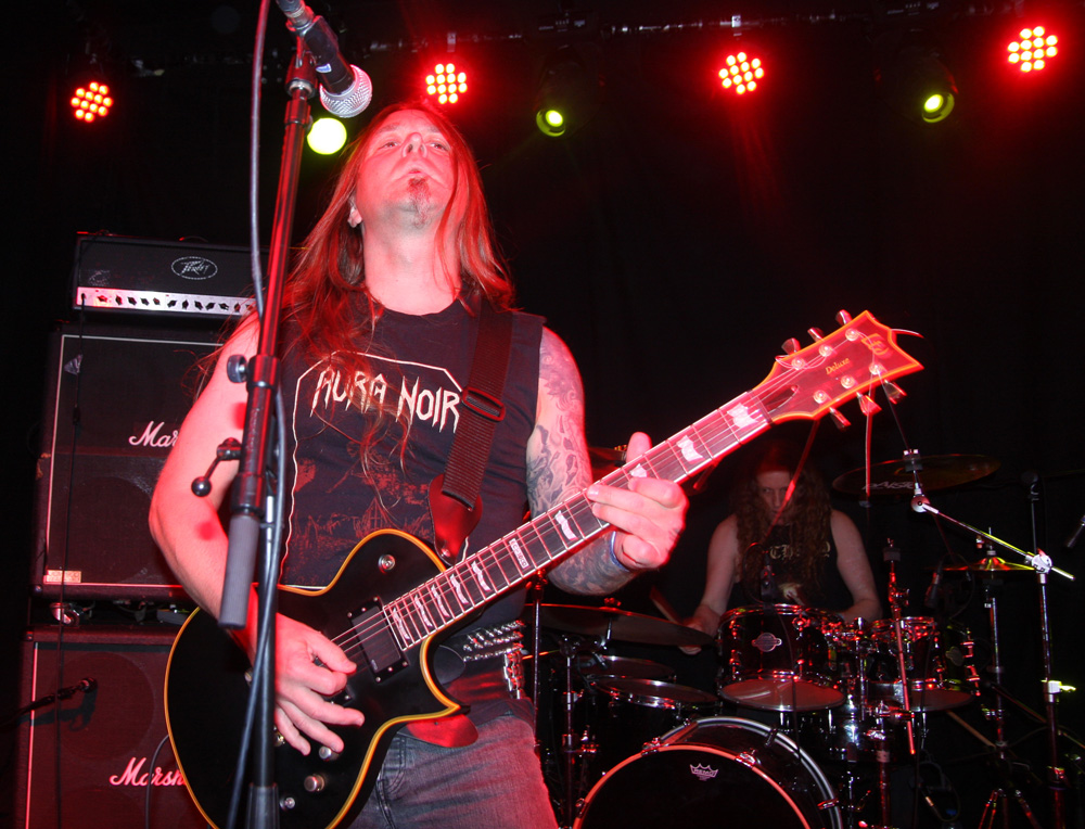 Tough act to follow but no problems for Aura Noir, hardened road dogs with 25 years of history behind them, the Sons of Hades are ready for action. Despite this falling between Desert and Incineration Festivals the turn out is good and with the alcohol having been consumed to combat the heat it is a pretty vocal one too as Aggressor, Apollyon and Blasphemer are welcomed on board. It’s good to see Aggressor slightly more mobile than I last caught them, he has his revolving chair to perch on but seems able to stand, play and growl out for a few minutes at a time too. The material takes on a stripped down feel with the black, metallic punk charge getting people throwing themselves around at the front.