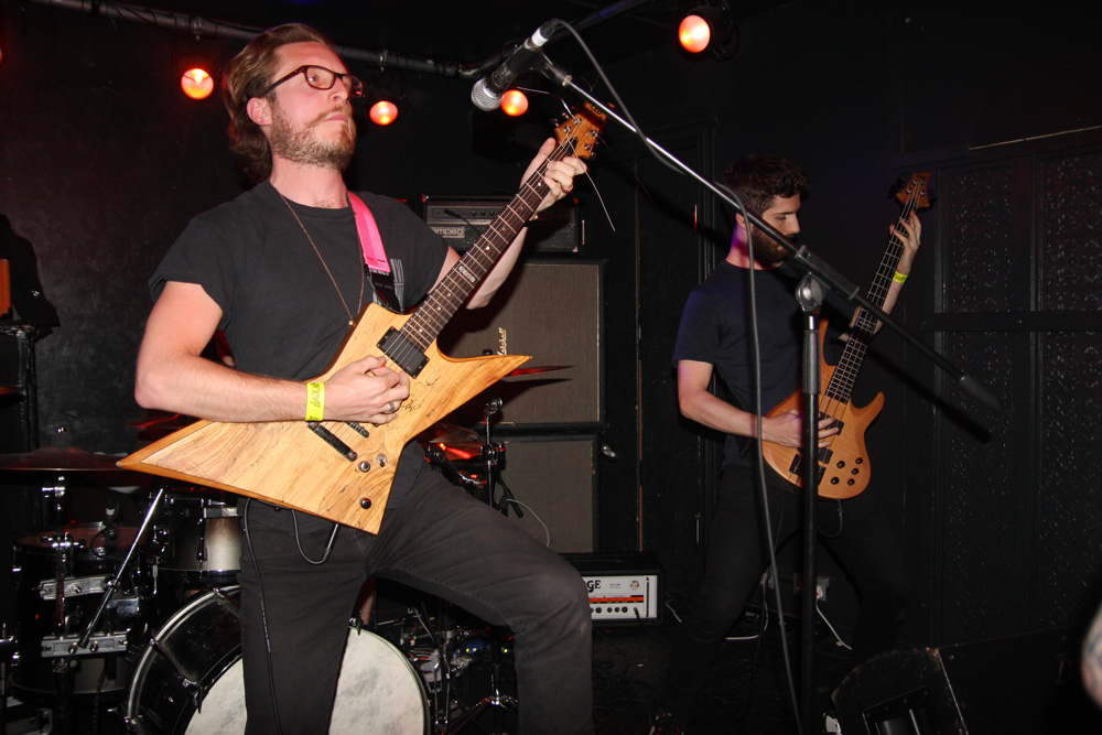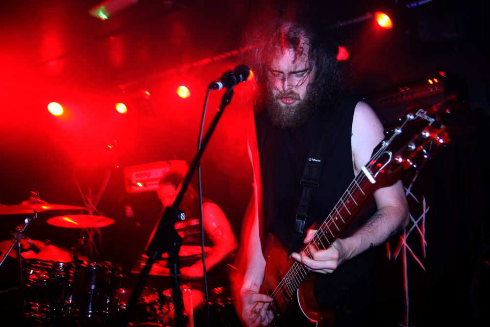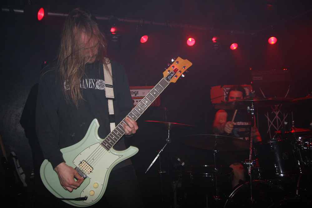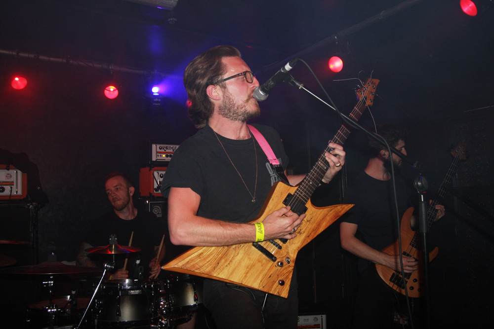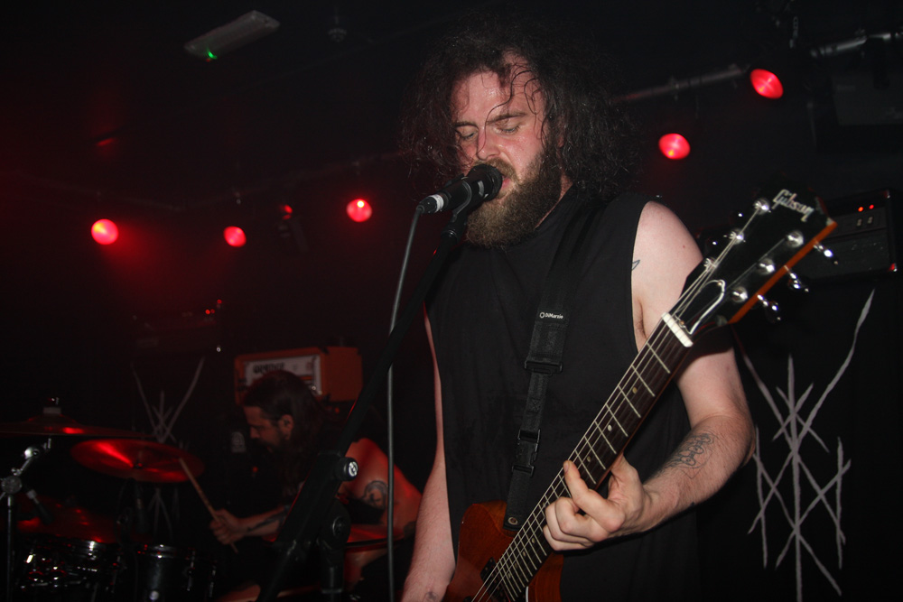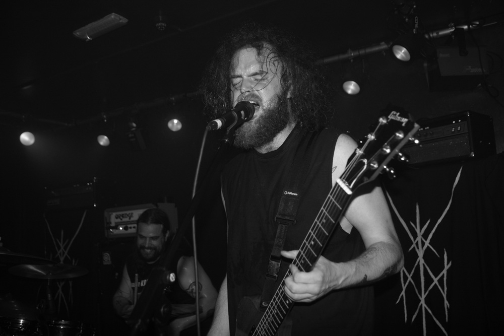 You could tell this was going to be a busy gig, just before the doors opened the queue snaked down the stairs, across the downstairs bar area and practically out the door. Luckily we all just about managed to fit in as Colchester mob Jøtnarr took their place on the small stage in the venue. I have seen the band before and tried to remember the experience as the power trio began to shake and quake the joint with some boisterous and rugged furrowing. Now certain places describe them as being of the blackened crust variety but seriously they seem a mixture of far much more, like a mongrel dog (and that’s not meant to be derogatory) with shades of just about all breeds running through it. One thing is for sure they are pretty energetic. I got more than a shade of sickly sludge about them and as they gave it hell for leather they jammed garage style and let it all hang out which the audience seemed to appreciate as they had heads banging in appreciation at the front. As things progressed there are elements of noise rock and even some bellowing near hardcore vocals and frenzied riffs to match. Songs are not overstated and are short sharp and abrasive. Apparently it is vocalist Chris Moore’s birthday and he urged us to get some merch as a present before they flew into another Unsane attack on their instruments. There are some acoustic parts, add a bit of ‘post’ to their genre armoury, which gave a bit of breathing space amidst the frenzy and plenty of groove before they finished leaving everyone a little dizzy.