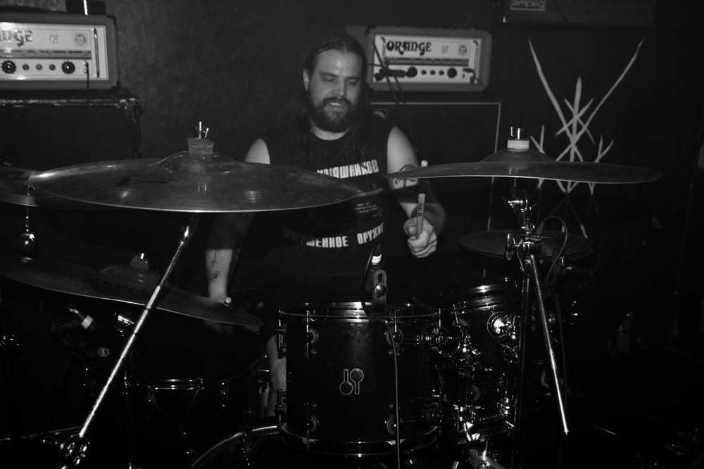 Levy simply mutters, almost to himself between numbers, perhaps it is some sort of ritual to prepare himself and there are now some catcalls from drunker members of the audience, “shut the fuck up” is his prompt reply, interaction is not part of the show it is all about delivering might and glory which they do in style. I had waited for that kick drum on the third album title track and was not disappointed as it felt like it kicked me in the ribs like a horse. Speaking of powerhouse drummer Wim, when he gets the chance to take a pause I notice he is twitching full of nervous energy and frankly looking sick as a dog, at one point dribbling a stream of spit. He doesn’t miss a beat though and is utterly rabid as he batters away. The allotted time for finishing approaches and we are all shattered but invigorated, the vocalist looks at the drummer, they nod and an agreement seems made, curfew forgotten they fly into a finale and give every last bit of energy that they have. This was the last of the UK dates and London got an absolute shit-kicking as I have heard did the other places on the tour that they made their mark on. Falling onto a train with stacks of Rolling Bones fans on I could only commiserate; most will probably never witness an intimate show like this but perhaps that is for the best.