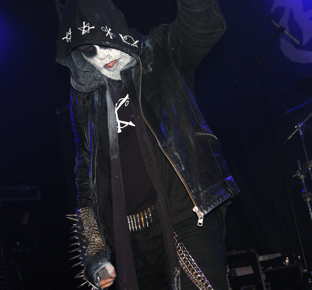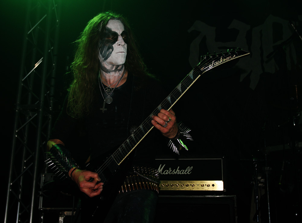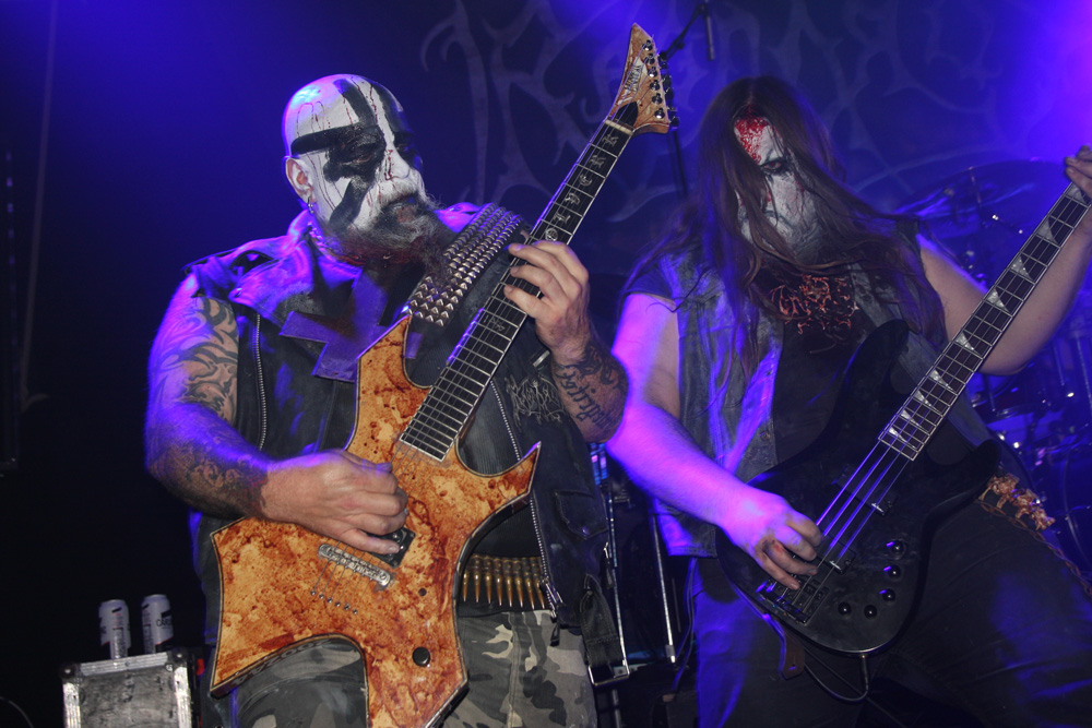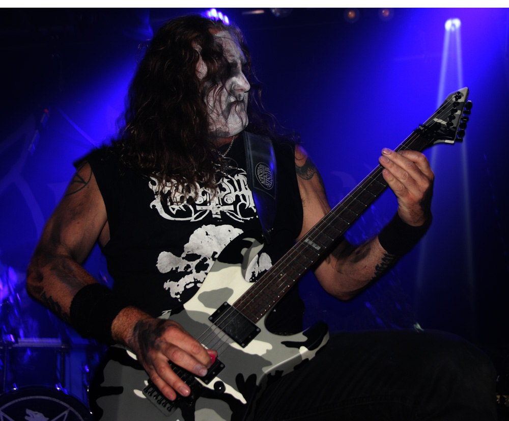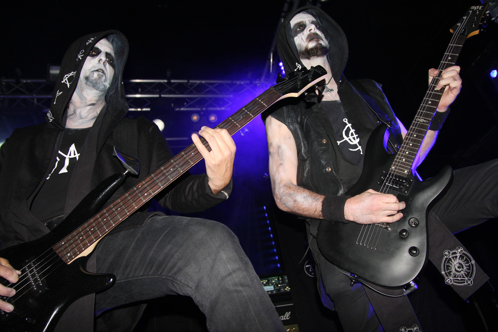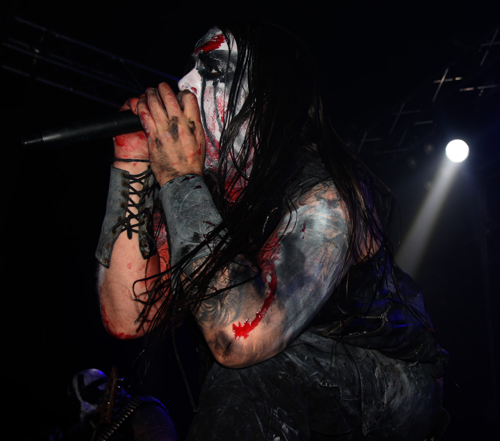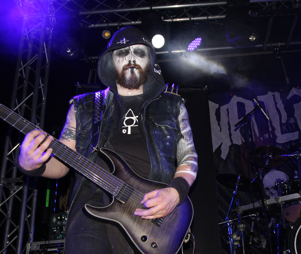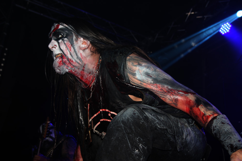 First up are French band Azziard and I was down early for them having really enjoyed their last couple of albums. I am guessing they are an unknown quantity to many and it is quite empty still when they throw down their bloody, spike-fisted gauntlet with Psyché from latest album Metempsychose. It was suitable therapy and the band looked great in their paint and cold blue lighting. One thing that I had expected was confirmed straight away and that is that vocalist A.S.A. is every bit as a deranged and nutty frontman as he gives the impression of on disc. The harsh barks and galloping tumult of Unus Mundus has heads banging, time to discuss Jungian theories can come later over a civilised pint (who am I kidding). The speed and percussive blasts fit in perfectly on tonight’s bill and the drummer is a veritable machine handling his armoury in a style that’s enough to leave any troops wandering into range accidently, more than a little shell-shocked. It’s not all about blowing us to bits though, besides the fierce grimness there are some slithering, skeletal guitar oozes to slow things down a little and bring a more sinister atmosphere. Of course they ramp things up and unleash hell before the end and even if was just for half an hour I was very pleased and somewhat surprised to see Azziard befoul our soil. They probably gained some new allies tonight too.