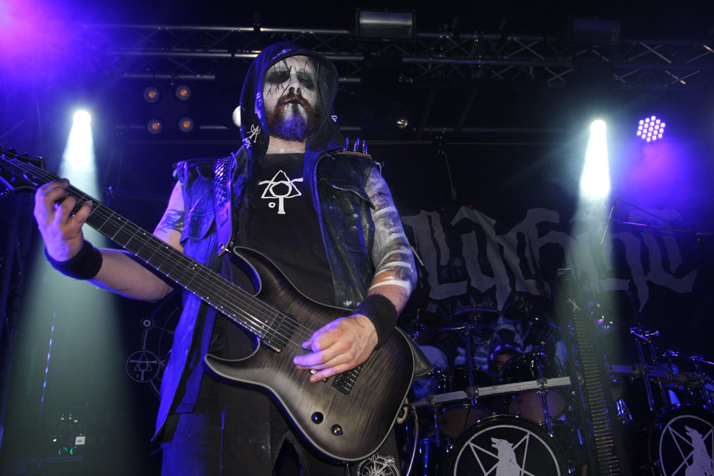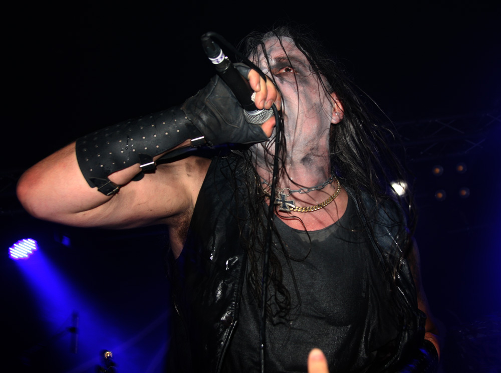 Next it’s a German-Swiss co-axis in the form of Unlight whose stage lighting changes from blue to a murky seaweed green. Paths with this group have crossed over the years but I can’t remember them ever playing live here and again think the band are not that familiar with many tonight. Paradoxically their mission statement is to create and annihilate and they set about doing so in a formidable way. The sound is a lot more natural and uncluttered without being densely built up and this more organic feel gives the instruments individual definition along with the feral rasps of vocalist Blaspherion. Melody is very important here and the weeping guitar lines really come to the fore and have a real hook laden panache about them that is impossible not to be slightly mesmerised by. There’s a real classic feel that is somewhat reminiscent of bands like Lord Belial and Dissection and by the second number the thorny riffs and hellish vocals really begin to pierce and penetrate. For some reason the vocalist decides to suddenly hit the floor and lie there on his back playing guitar. Somewhat odd but if it works for him it works for us and it seems to bolster the audience too. The room is becoming fuller, people are getting suitably fuelled up and Unlight are rewarded by a small pit towards the end of their performance. I really enjoyed them and shall certainly investigate further.