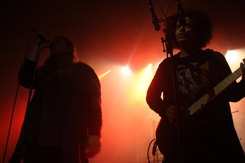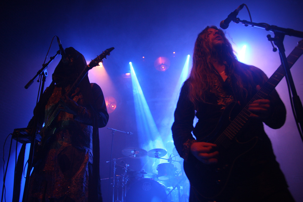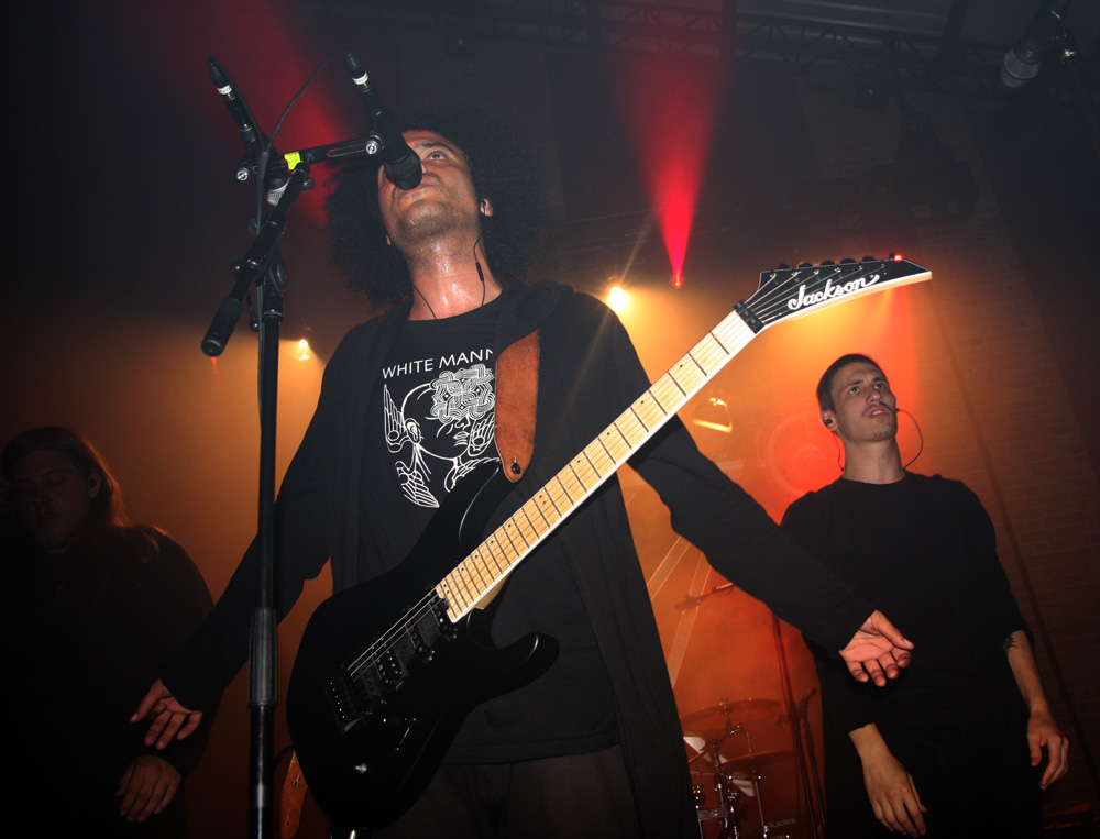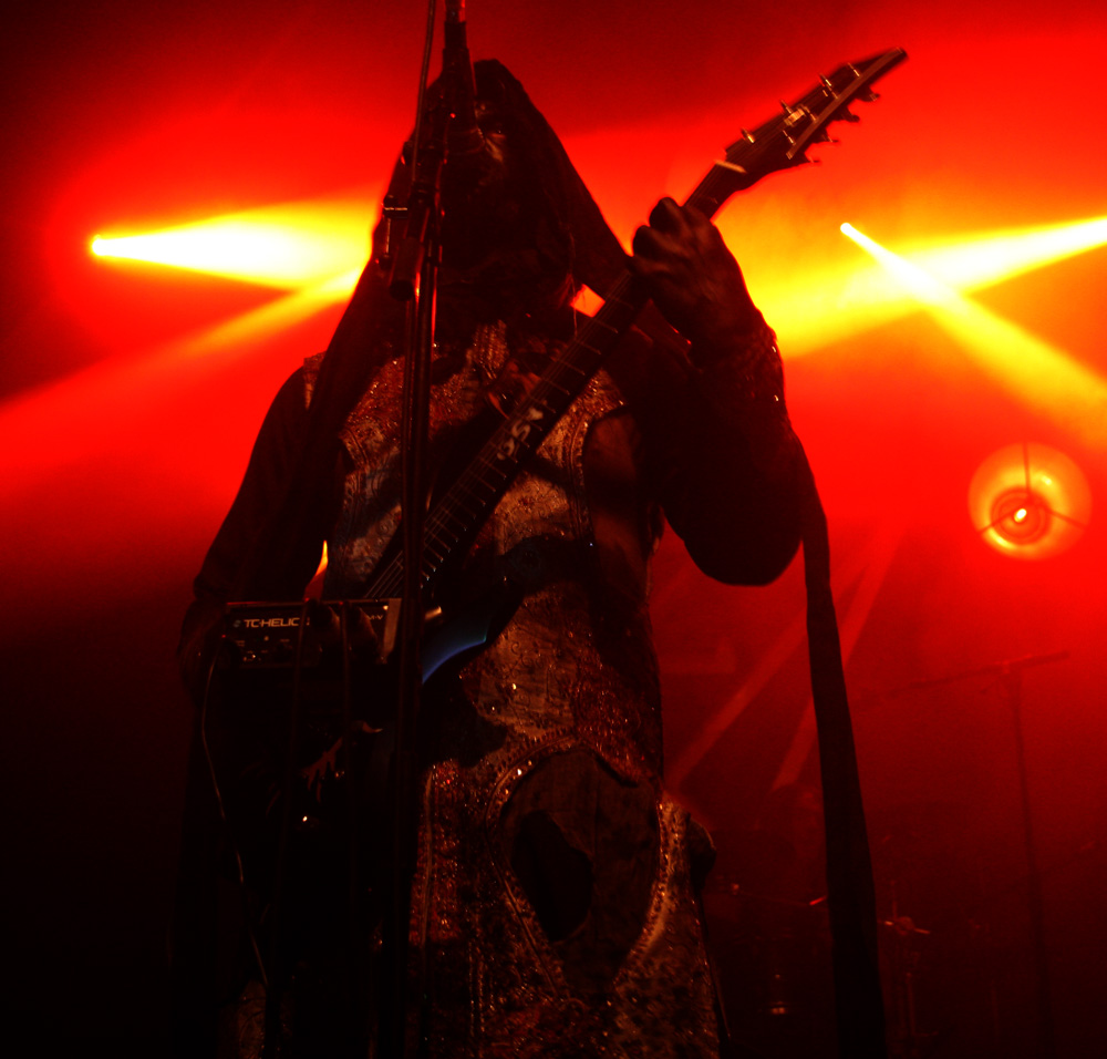 Zeal And Ardor have kept things very real and have not brought a trendy young bunch of bucks playing avant-garage or anything like that with them but have Swiss countrymen Schammasch in tow. We approve of this wholeheartedly and it is the second encounter with the spiritual blacksters this year after seeing them support Batushka. It is no surprise that dry ice is swirling about the stage when they stride on and turn backs on us ready to unleash their sonic might. Blood red and cold icy blue light fill the spaces as they turn and bring a huge sense of gravity allowing us to instantly realise that the PA here has plenty of beef about it. Swaggering, adroit and clinical they are a force to be reckoned with as they plummet us into a heaving, chasmic void. Main vocalist C.S.R is a cloaked demon from the outer limits with his gruff commands but the music is at times graceful and full of grandeur. I’m wondering if some here have even encountered music like this before, looking around I suspect not all have and this is a real baptism in ‘Golden Light’ for them. The band seem to capture and mesmerise the audience though as songs flow and entrance. Naturally billowing out dark passages, miasmic instrumentation swirls like ectoplasm through the ether. Moving back in the venue the sound is near perfect the drums hitting the brick work and the sharp treble tones of the guitars glistening. We are finally greeted and urged to close eyes and receive of transformation before being swept into last song ‘Metanoia.’ With plenty of clean and near hymnal vocals we indeed reach the musical enlightenment the band had invited us into. With 3 guitars and bass all strumming up a storm it’s an impressive conclusion. Schammasch are a band who constantly manage to beguile and do very odd things to the senses; tonight the light poured out of them!
