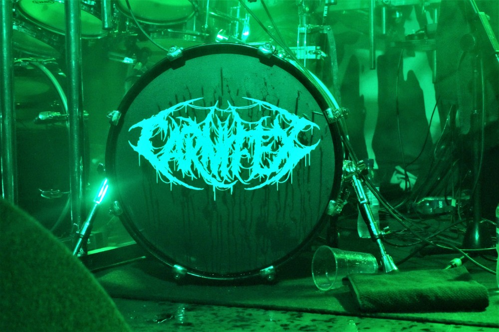 Phew, after the obliterating set by Toxic Holocaust some liquid refreshment was in order before deathcore thugs Carnifex were due on. I had seen the band about two weeks previous at the Stonehenge Festival in Holland where they were one of heaviest and most intense bands of the fest, and I was expecting the same here. As their start time approached red light bathed the stage and the band took position as the intro played and they bulldozed into “Drowned Me In Blood” which the vocalist Scott Lewis bellowed unceremoniously at the gathered mass in front of him. The pit had already started during the intro as the bands backing effects were well balanced within the mix and the song’s gnarly riffing poured a thickened barrage amidst a drumming cannonade onto the crowd. I profess to not liking a clicky drum sound and here it was in full force unfortunately but didn’t detract from the outright thuggery of their music which continued with “Slow Death” as a synchro headbang ensued from the band due to the massive breakdown riff. Some chat from Scott telling us that we need to make this building shake as he got the crowd to jump for “Hatred And Slaughter” as every command he made the audience obeyed. A relentless onslaught teemed from the musicians with each taking their focus with lead breaks flooding in on “Black Candles Burning”. A brief pause to catch breath before the despairing blackened wrath of “Dark Heart Ceremony” was aired complete with its sound of gun cocking. Whether the crowd liked deathcore or not the undeniable power and dynamism that discharged from the band was cataclysmic as was the unflinching stamina of the pit as the band ended with the mammoth “Lie To My Face” prior to which the singer thanked the crowd and said it was an old song. The track was battering with a huge breakdown as the crowd sang the title like they did at the festival in unison and I am sure that some indifferent fans at the start of their set were converted to Carnifex fans and laid clear that deathcore is a musical force to be reckoned with.