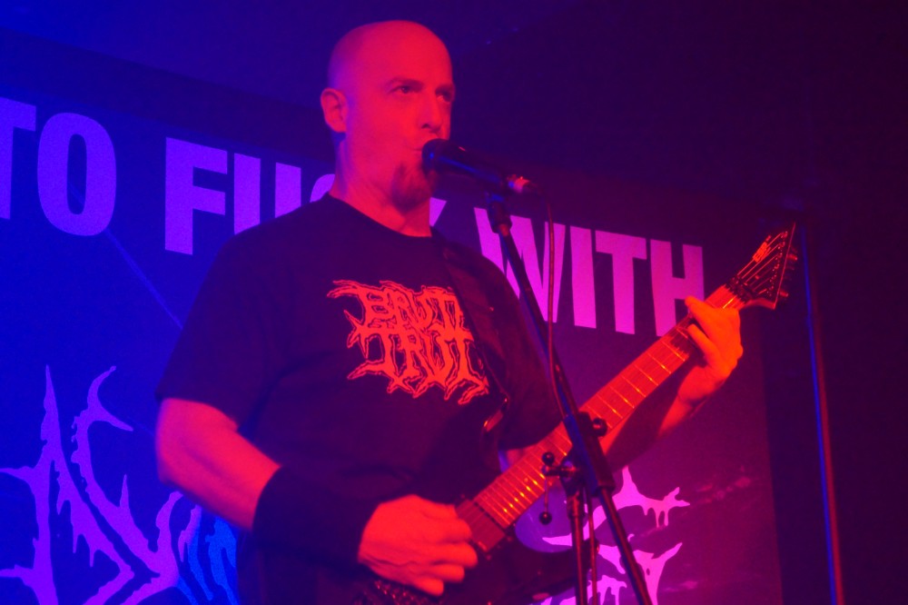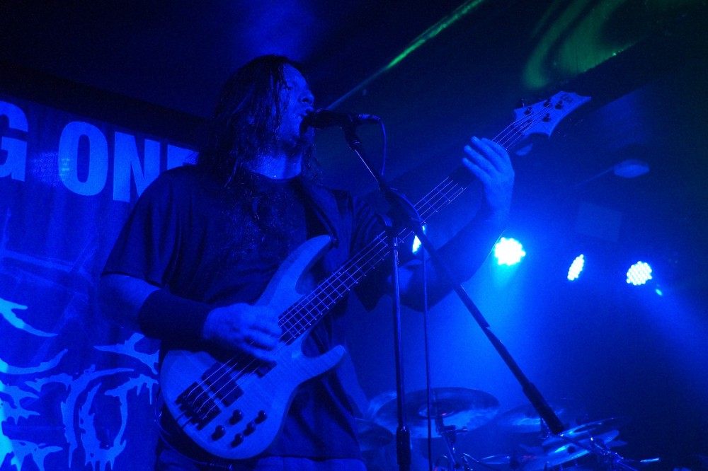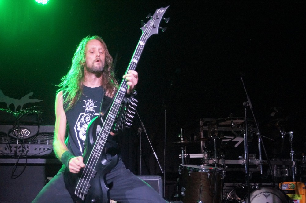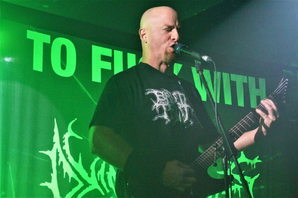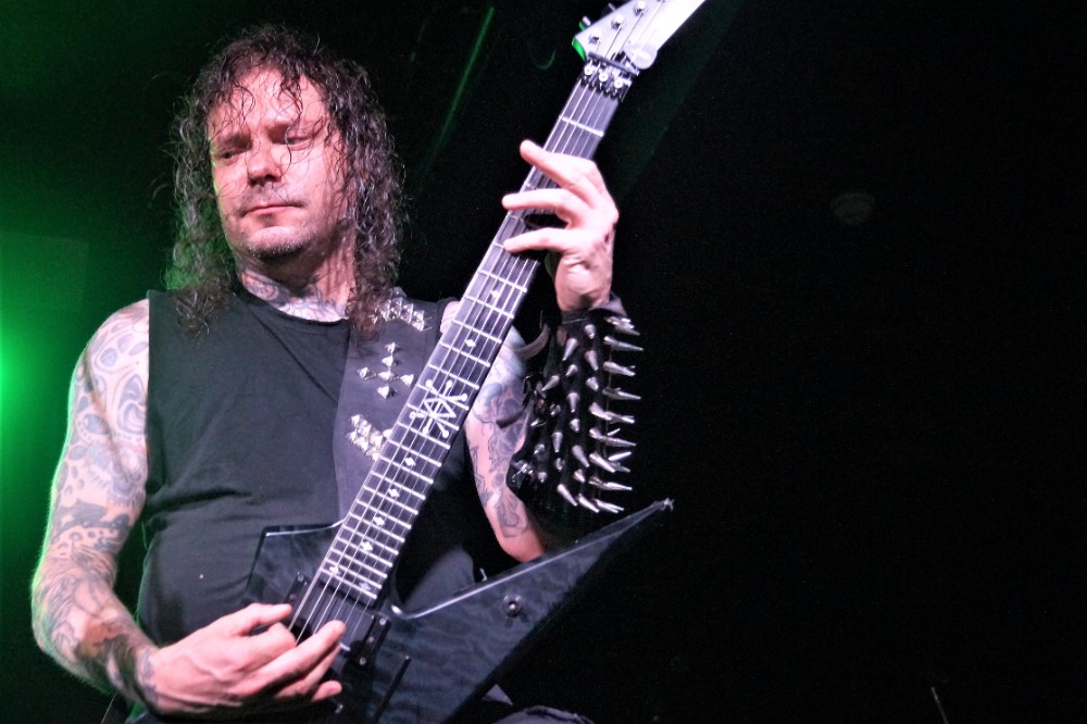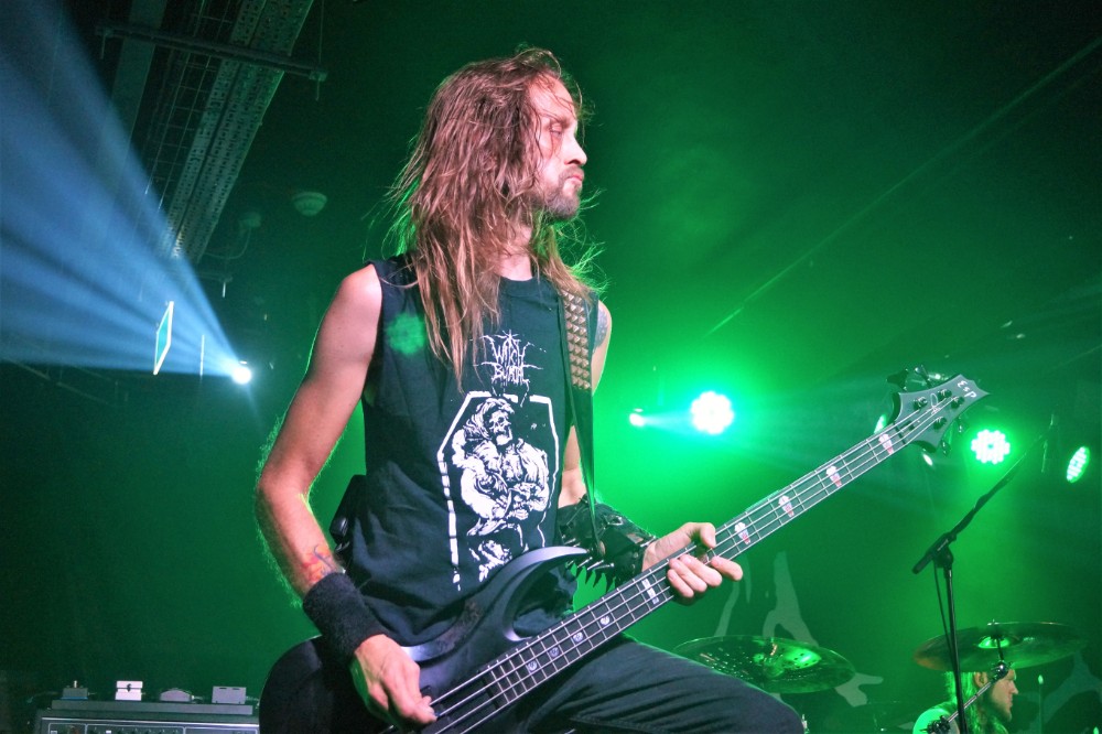 With the set in full flow one thing that really did grate on my nerves and seems to have popped up at gigs recently is people shouting ‘woo’ between songs constantly, it’s irritating or maybe I’m just getting old. Still with pauses kept to an absolute minimum the band went into “Seething With Disdain” a track that was a highlight for me with brilliant tempo shifts that had allowed the crowd to exercise those already well-oiled neck muscles to breaking point as the monstrous riffs carpet bombed the crowd. Another personal favourite followed, “Praise The Lord (Opium Of The Masses)” and continued the strafing assault of riffs and Trey’s unflinching ability to batter the audience was perfect and left only the sonic butchery doublet of “Your Treachery Will Die With You” and “Kill Your Mother, Rape Your Dog” both of which had shirts devoted to them you could buy on the night. The former was announced by John as “fuck shit up” as if the place needed that as the ceaseless energy of the crowd gorged on the copious blast beats and deluging riffs of the guitarists. John playfully asked us to guess the last song which they did of course and the last 60 seconds of the set was utter bedlam. As the band exited we were left with the dulcet tones of Kool And The Gang’s “Celebration” which the crowd sang and danced to, again surreal indeed.