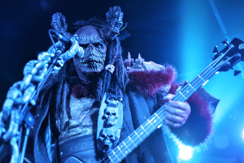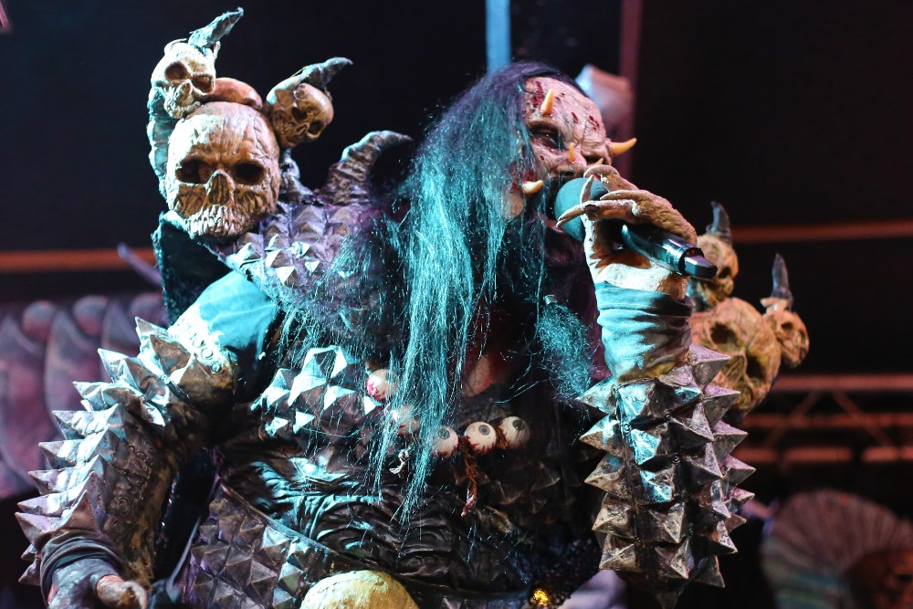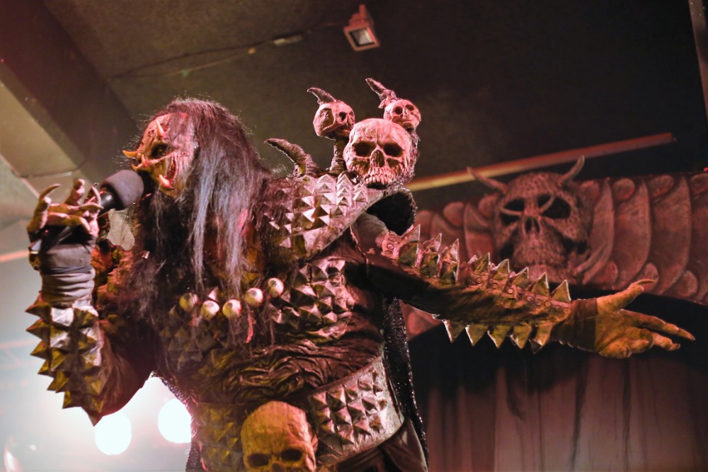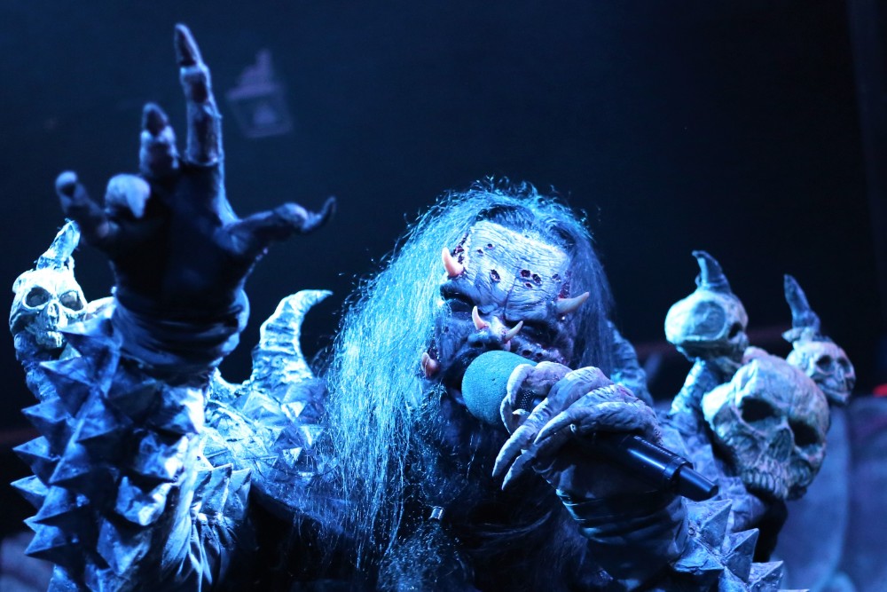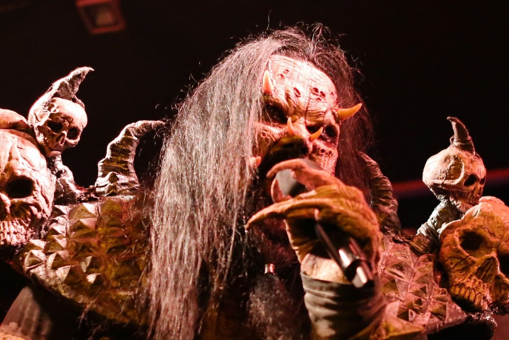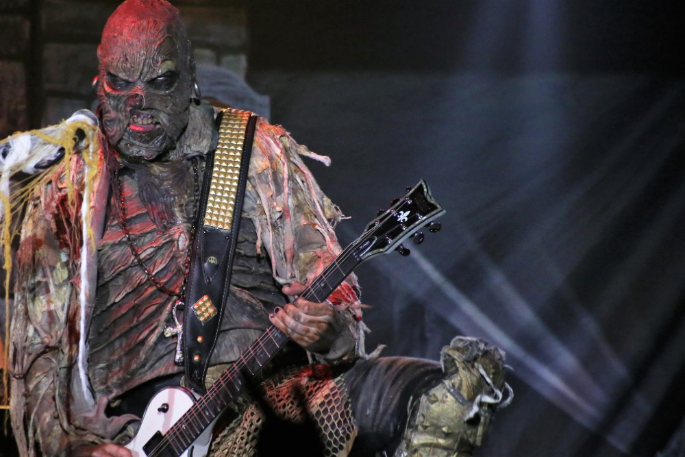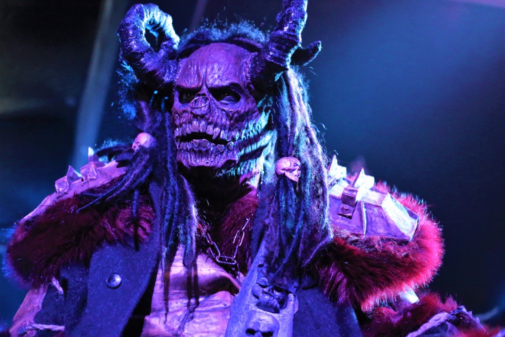 The stage was turned round so that it now mimicked a haunted mansion, adorned with skulls, flickering candles and chains. There were even framed portraits on the wall depicting family members from bygone eras. The band then emerged one by one after the ACDC classic ‘God Of Thunder’ acted as their intro, each member received a rapturous cheer, yet the biggest cheer is predictably left for Mr Lordi himself, as he strode out from behind a curtained passageway centre stage. They then dove straight into the title track from their new conception ‘Sexorcism’. The crowd had visually swelled now and the cheer after cheer demonstrated that they were only there for one thing, the Finnish monster overlords, the Demi Gods of the horror hard rock world if you please. They continued to decorate the set list with ‘Would You Love A Monster Man’ and a particularly energetic ‘Missing Miss Charlene’.