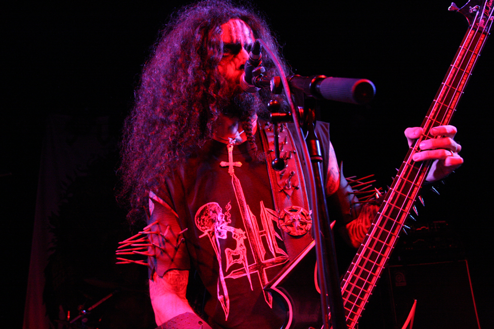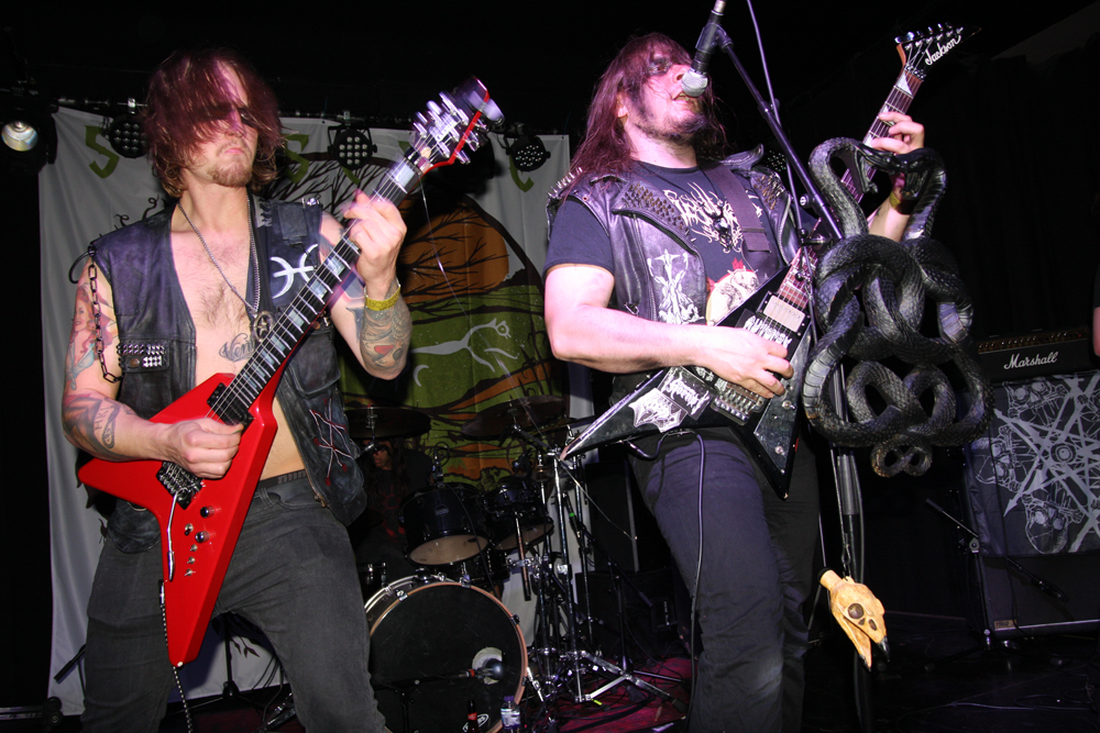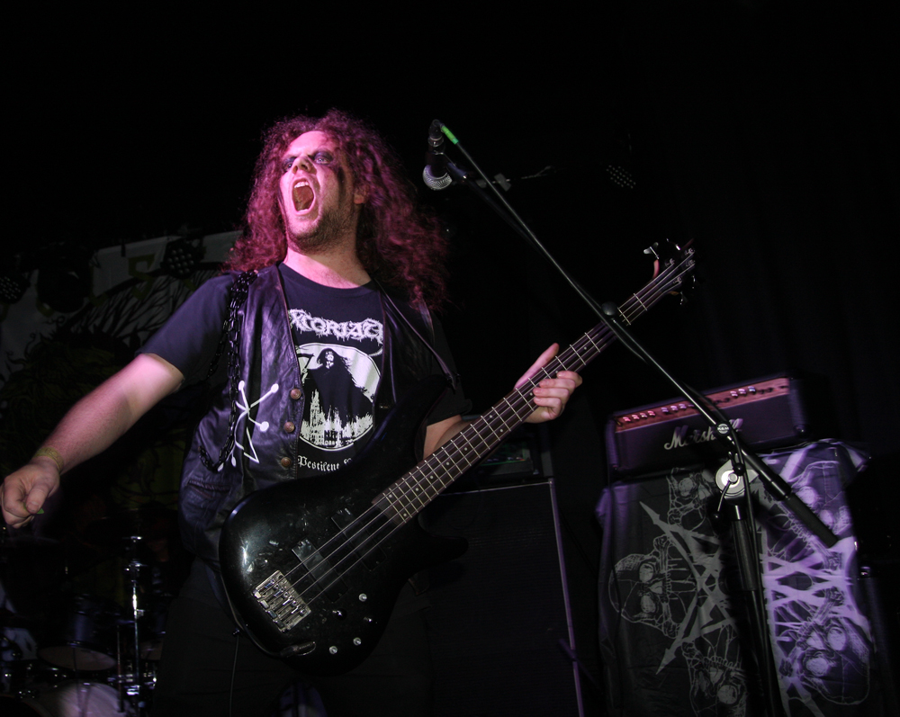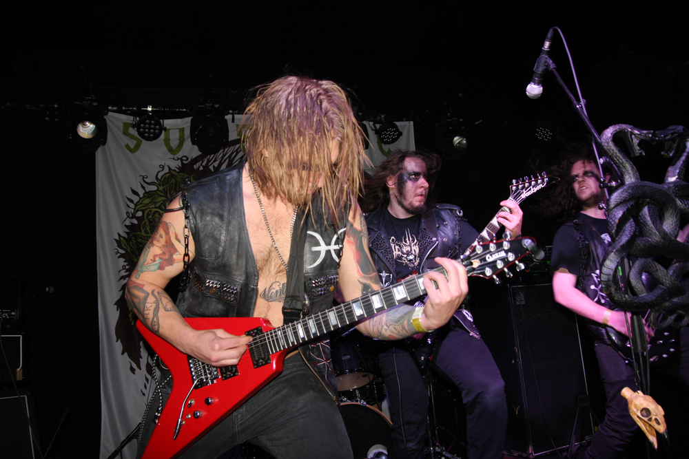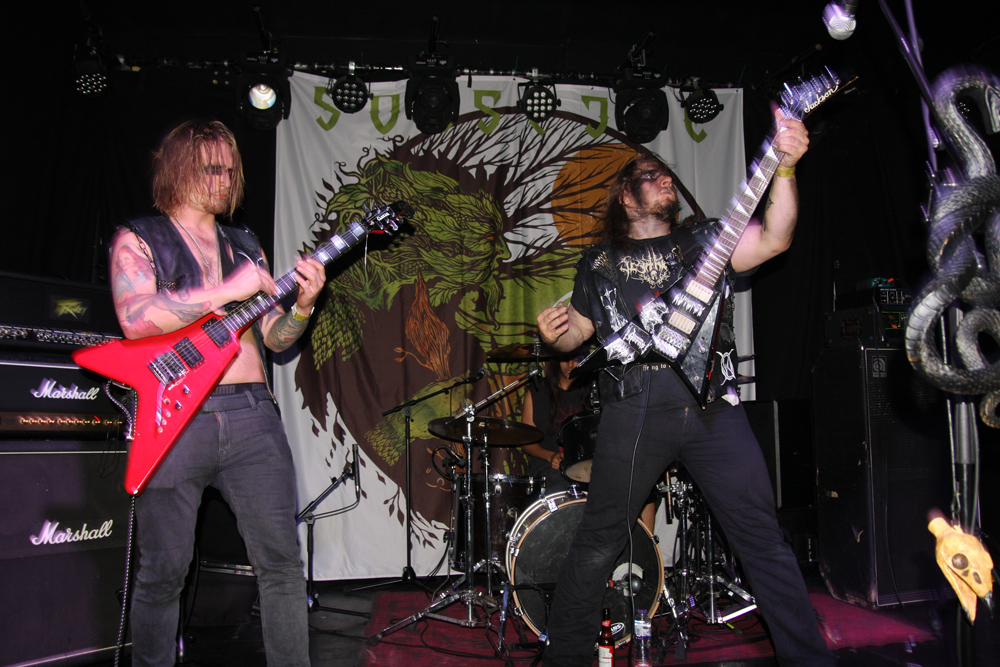 We are Lured to Ethereal Altars by Craven Idol and there is instantly a massive leap in quality as they take off blackly thrashing like maniacs. This lot can play and do so with plenty of posturing as guitars duel and vokills harangue. Attacking from every angle the stage is a blur of motion and the audience are quick to bang heads and thrust fists in appreciation. This is vitriolic and conquering might and its impossible not to be swept along in the fervour of songs such as ‘A Ripping Strike’ There’s loads of axe histrionics before the song gallops away cleaving for hell and this is just what we need, an invigorating pick up stoking the fire in the very belly of the beast. There’s even a touch of crusty punk spewed out by the thick bass grooves. Only problem is that with just 30 minutes the set is over in a flash but Craven Idol left a bloody mark upon us all.