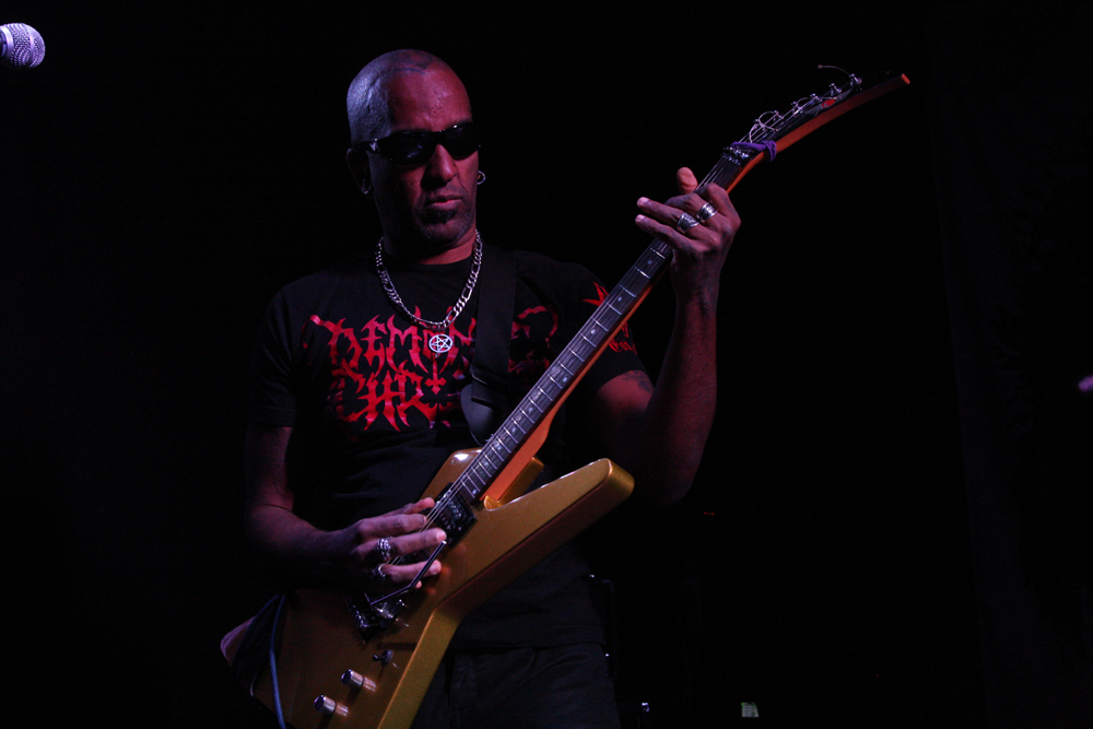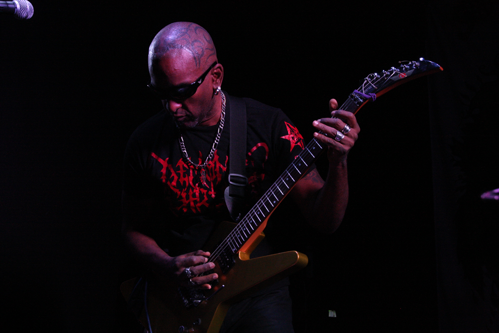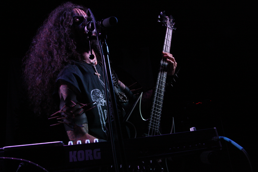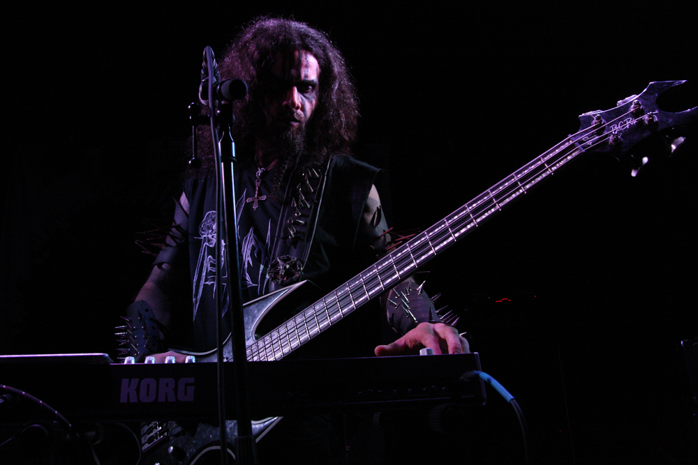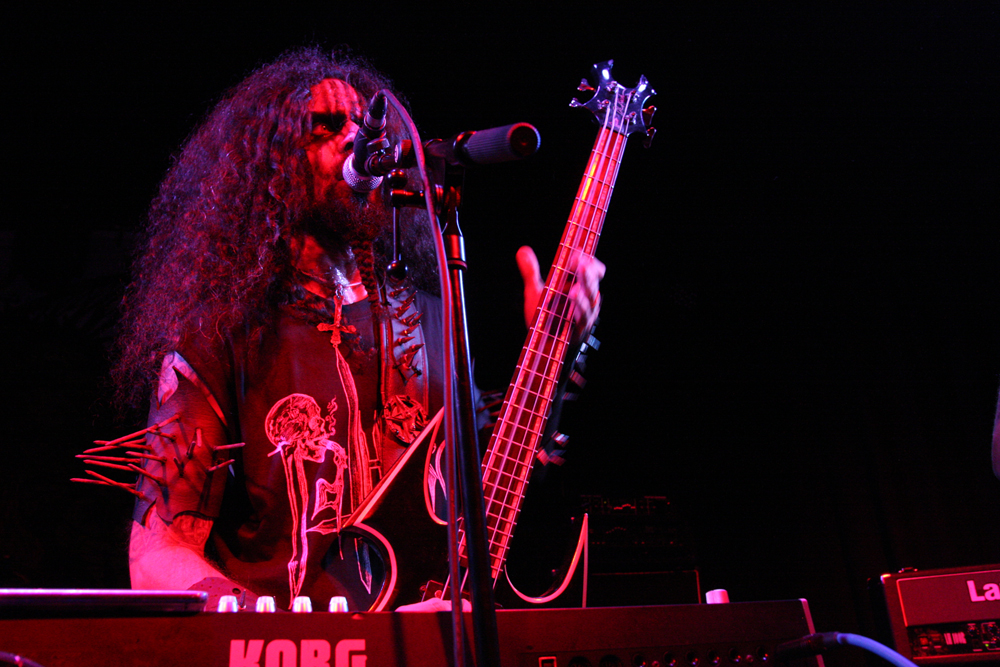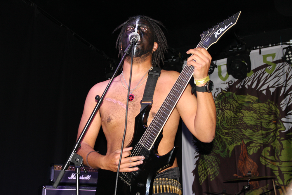 We are Lured to Ethereal Altars by Craven Idol and there is instantly a massive leap in quality as they take off blackly thrashing like maniacs. This lot can play and do so with plenty of posturing as guitars duel and vokills harangue. Attacking from every angle the stage is a blur of motion and the audience are quick to bang heads and thrust fists in appreciation. This is vitriolic and conquering might and its impossible not to be swept along in the fervour of songs such as ‘A Ripping Strike’ There’s loads of axe histrionics before the song gallops away cleaving for hell and this is just what we need, an invigorating pick up stoking the fire in the very belly of the beast. There’s even a touch of crusty punk spewed out by the thick bass grooves. Only problem is that with just 30 minutes the set is over in a flash but Craven Idol left a bloody mark upon us all.