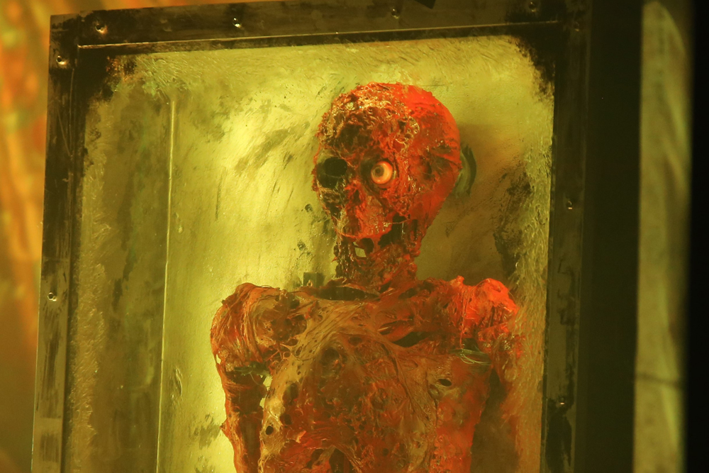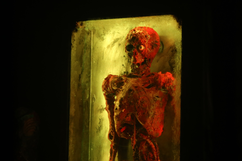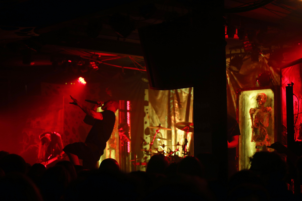 The stage was then set for the main event, the brutal Belgian death metal outfit of Aborted, and they truly hit the stage running. The energy being displayed tonight was nothing short of extreme and convicted. De Caluwe prowled and stalked the stage which was flanked by 2 coffin glass caskets housing skeletal exhibits, which were adorned by dripping flesh and rotting organs. With the stage diving maniacs well and truly warmed up, they soon climbed the wall from the pit and started throwing themselves into the circling and rioting pit below. The band utilised their set time to good effect, and opened us up to a diverse mix of tracks from a wide selection of their back catalogue. The whole venue was maniacal and there wasn’t a spare inch of floor space which wasn’t occupied by a black clad figure in one form or another.