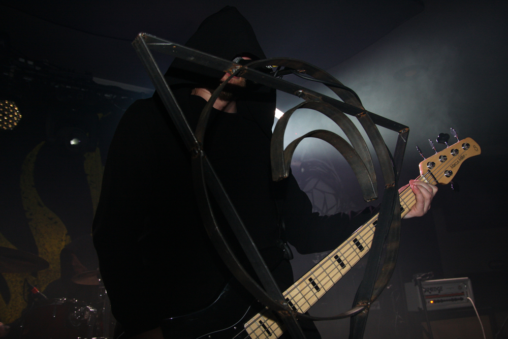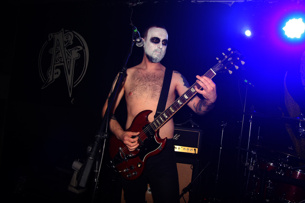 Au Dessus have come all the way from Vilnius and make an impressive entrance hooded up, backs turned and bathed in cold blue light. There’s a foggy shroud on the stage and suddenly a drum is bashed and they explode in a tumult of lethal incendiary power. This almost floors us at the front as they turn round to confront us silhouetted with vocalist / bassist Mantas behind an impressive arcane looking microphone stand. It’s hefty, dense and hellish, the cymbals are heavily relied on with the drummer making a sharp clattering sound akin to a bull in a china shop. The precision is faultless, this is a very well-oiled machine as the layered up shred intensifies, blackness at its very heart. Song titles are simply Roman numerals and seem somewhat superfluous. I had only given their debut album ‘End Of Chapter’ a cursory listen before passing it on for review and should have definitely given it a bit more attention; luckily it went down well. Nambucca may not be the biggest venue out there but the band filled up the stage and put on an incredible strobe-heavy light show, perfectly co-ordinated with the devastation their music created. I’m sure I wasn’t the only person flung into an acid-flashback at the front. Having been here for shows like Lifelover and Portal I seem to have picked particularly impressive displays at the venue and this was another to add to the list. The crowd seemed swept up by the intensity of it all too, flattened by the music which broke occasionally for brief glistening interludes, making them all the more effective. I got some fleeting post black vibes but this was definitely a lot heavier live than I remembered on album. Suddenly the band hit a groove with some unexpected bluesy riffs, when silence was restored it felt like a void had been left in its wake.