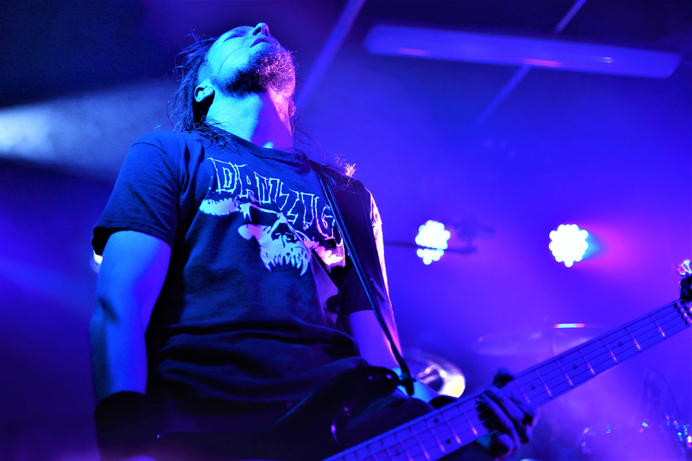 It’s clear from the offset that Baest, whose name literally translates to Beast in the bands native tongue, are in Manchester tonight to accomplish just one thing, and that is to destroy everything within the grasp. The band has only been alive since their inception in 2015, but boy have they made a name for themselves, and this reputation isn’t going to be tarnished tonight. Olsen on the vocals is commanding the modest crowd, and he is orchestrating the proceedings with guttural growls and competent gruff choruses. He is sporting a classic ‘slowly we rot’ shirt so it’s clear where the bands influences come from.  Revsbech and Karlsson provide the intricate fretwork tonight with Abildsten putting in a massive shift on the drums, which are unavoidably tucked away up a corner of the stage. The hammering and pulsating from the kit is mesmerising and Abildsten is providing a substantial backbone for the Baest tunes to build around. The crowd has slowly swelled throughout the set and there is a decent size ensemble to cheer the closing chords of another proficient outing for these ever growing Danes. There have even been a few video cameras cutting through the crowd during the set, so who knows what may come of that, I guess we just need to keep our eyes peeled.