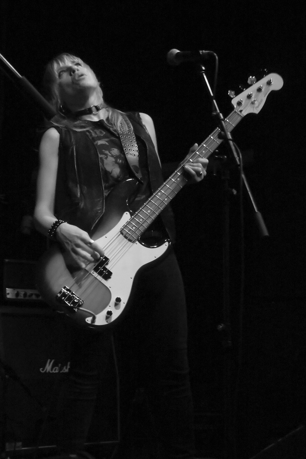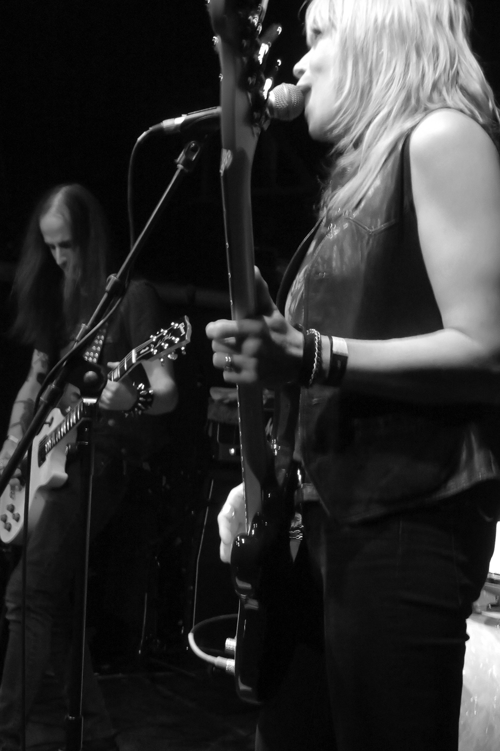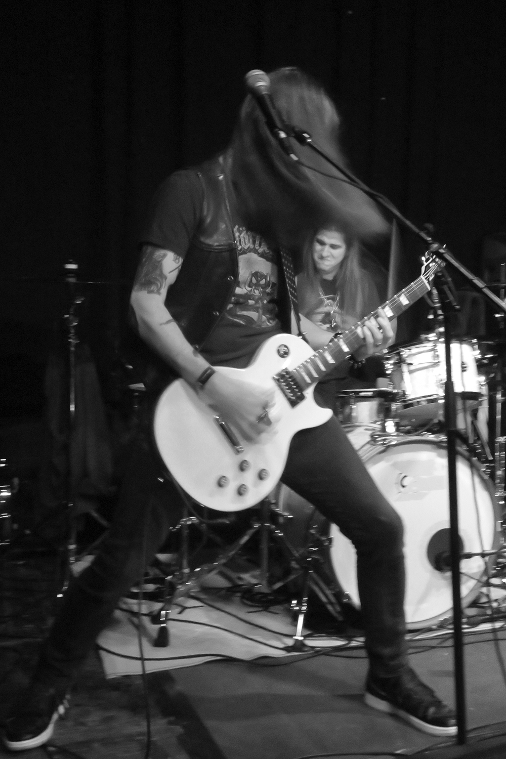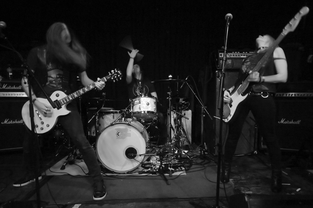 By nine o’clock in the evening, a nice crowd had gathered, and Sanhedrin opened with a song from their new album The Poisoner. Meditation, mid-tempo and melodic, was met with appreciative enthusiasm by the audience. Heads started bobbing and bodies were moving to the music. What was already a good start got even better with the next song, Demoness, speeding things up and bringing a whiff of Motörhead. The mood got better and better with every passing moment, aided by the fact that the band played with gusto and heart, obviously enjoying themselves. When Riding On The Dawn came on, the crowd was already sufficiently infected by the positive energy to lose inhibition. Three gentlemen to my right in the first row enthusiastically sang along with raised beer cups, and a guy to my left was playing air guitar for his own personal enjoyment. What probably was the highlight of the show was followed by a short classical interlude (Mozart?) and by Ashes to Ashes, a slower number, turning the atmosphere a bit contemplative. Then my personal favourite regarding lyrics and subject was on, No Religion, giving the audience yet another chance to see the band at its best: Erica Stoltz is a great frontwoman, with a strong facial expression who lives her songs, Jeremy Soville an outstanding guitarist, and Nathan Honor an honest and skilled drummer. The band’s final song for the night was Die Trying.
