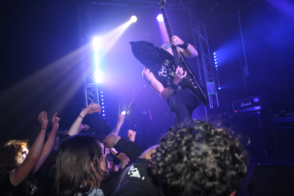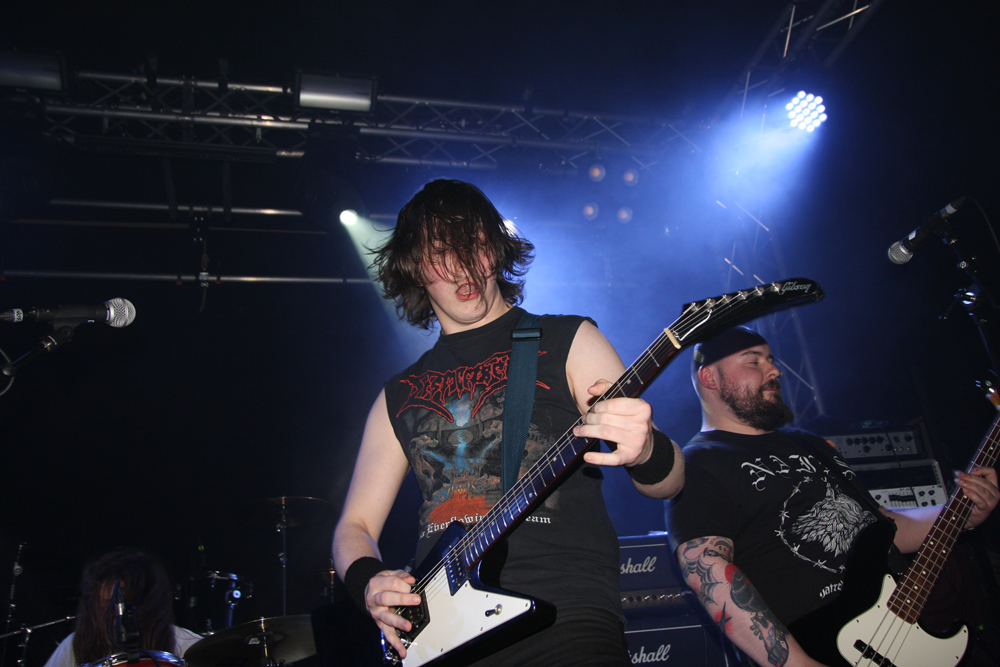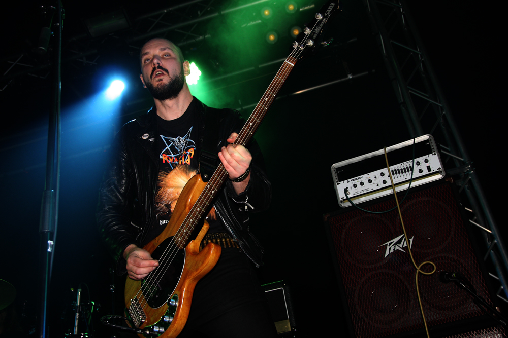 Possibly so too are Aggressive Perfector, who you no doubt immediately noted take their name from a Slayer classic. Led by General Holocausto they also share drummer with Heavy Sentence so he had hardly had time for much of a breather before firing up the kit once more. Satan’s Heavy Metal is the name of their game and they cast horns to the diabolic one with a thrashy and somewhat punk laden tumult; there’s also a bit of a crossover vibe about things that harks back to the glory days of bands such as D.R.I. Bathed in slimy green which gave them a suitably toxic low their infernal raids went down well, drummer Intimidator giving the battering ram a particularly hefty workout. They wanted a circle pit but were denied, the audience maybe saving themselves till later or more content to stand wrecking necks and downing beer. This was nothing new but I doubt anyone was expecting wheel reinventions tonight and the band were enthusiastic, hitting a groove and getting us moving along with it.
