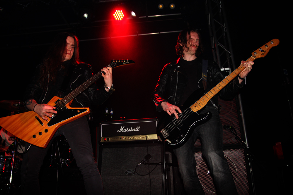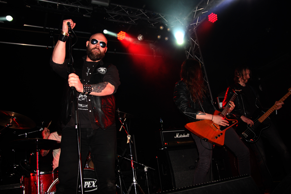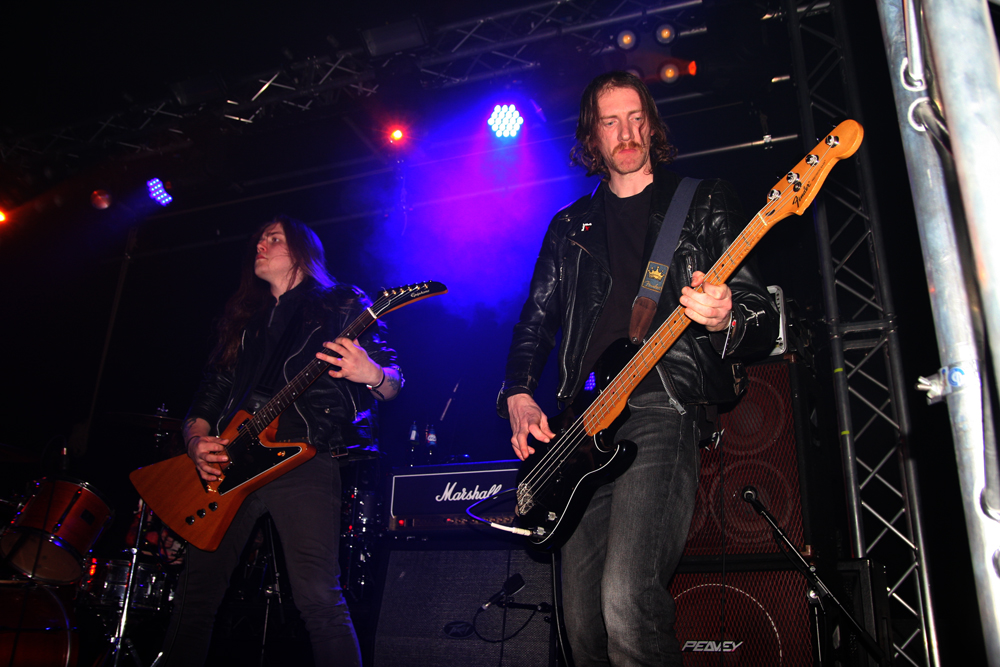 First it is the turn of 3 supports and they are all UK based. The first couple are from Manchester and although only at the demo, EP stage recording wise their music is very much rooted in the speed metal stakes of yesteryear. Heavy Sentence fire out the traps to the rapidly filling up venue, full of galloping bravado and mean chops. Are they evil, yes they probably are, their frontman cool as fuck sporting shades and coarsely growling his way through songs like opener ‘Protector’ with whisky soaked breath. ‘Age Of Fire’ is the sort of title that yells “classic” at you and sure enough it is rooted in traditional NWOBHM sound as it at first slows down the tempo before upping the game and exploding into hefty head-banging motion. Those down the front are more than keen to do just that, jigging around and blowing off the end of week cobwebs. The melodicism is strong and gets blood pressure and fists raised and pumped and it was obvious this was going to be a night for raising hell and drinking the bar dry in the process. None of the supports have time to outstay welcome just getting a half hour set which in the case of Heavy Sentence flew by, over far too quickly. This was an invigorating display and I am guessing by now they are with some of the songs being unreleased so far, soon to drop a debut album.
