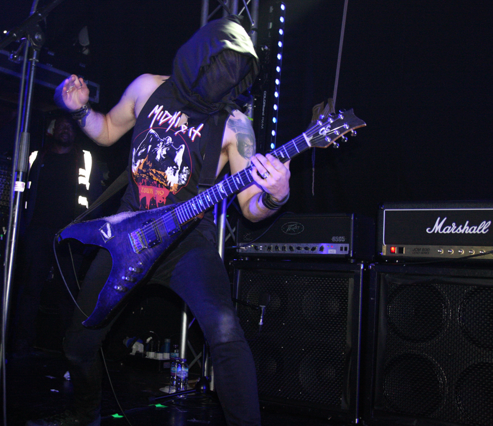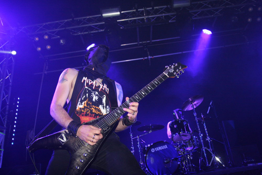 Well you simply can’t stop steel or indeed Black Rock n’ Roll and having already filled the quota of slotting song titles into the review it is time for Midnight. There’s no shortage of songs to get us all fired up either, the Cleveland based lot under the sole guise of shredder Athenar have a huge plethora of releases and he too has been in many other outfits before going for world domination in this one. He is joined on stage by a guitarist and drummer of course, possibly SS and Commander Vanik but as the men are naturally masked who can be 100% certain on that. One thing is for sure the Guitarist is a blur of energy and prone to dart around the stage and eve make the odd star shaped jump while slinging his axe and despite the room on the stage the trio make pretty damn good use of it. It’s evil by both name and nature and great to bang head to and simply flow on the fast flurrying energy of these Satanic royalists in full flow. Although it has been a while since last seeing them the songs and album tracks are instantly recognisable and as comfortable to get into as a prowling leather clad killer embarking on the first rape of the night. Where Athenor gets his ideas from is subject to confirmation possibly all the foulest things you can imagine and a good dose of serial killer study along with 70’s grindhouse roughies. Things are not always politically correct for sure but the boys and girls paying worship here care not one jot about such things.