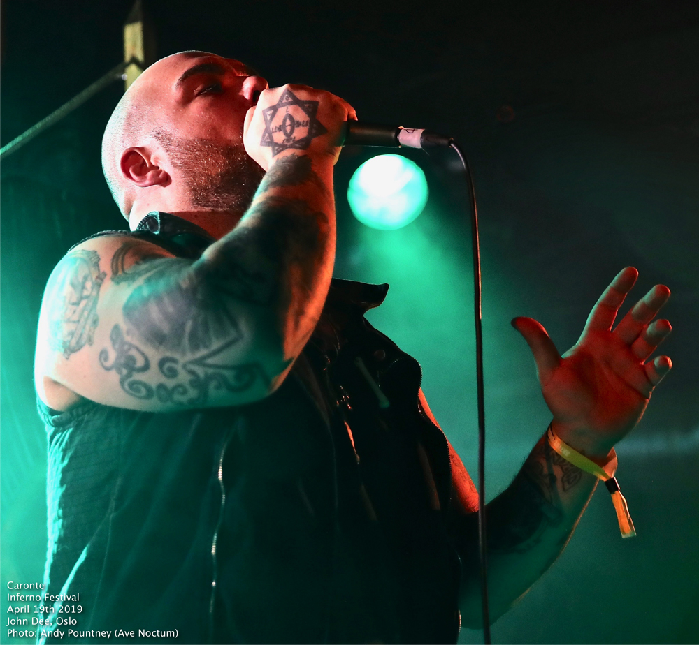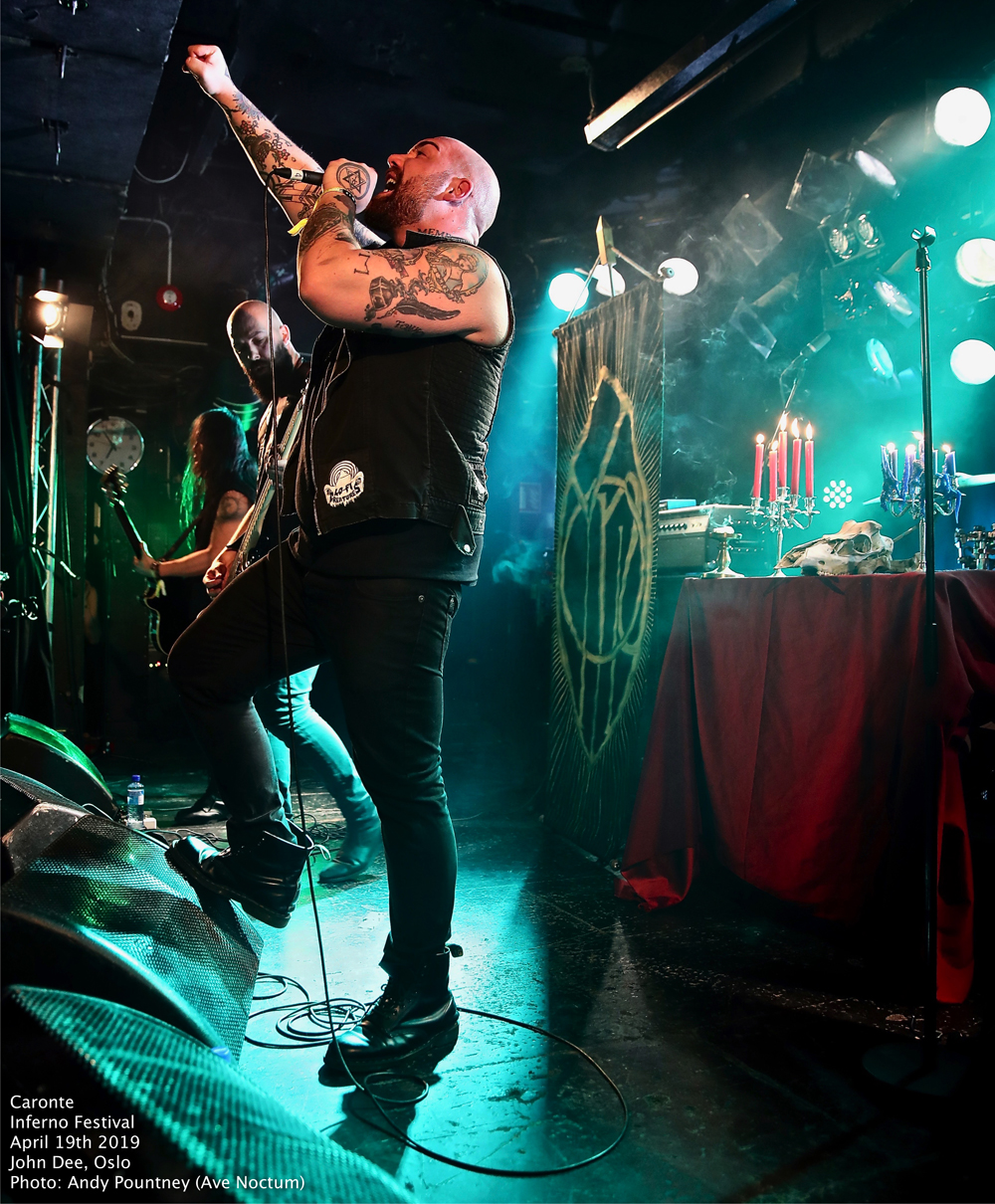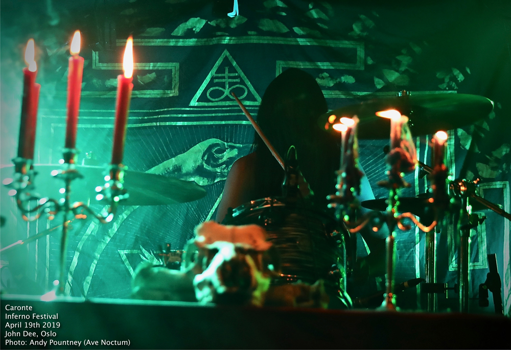 Upon arriving in John Dee again, the curtain was across the stage (which seems to be the norm in Norway), but through a gap at the side it was possible to see Caronte’s vocalist Dorian performing a ritual in front of their altar. Once the curtains went back this carried on briefly and he returned to this on several occasions during their magick ritual. The packed crowd were entranced by the dense shamanic doom and despite the room becoming unbearably hot, the crowd persevered to the end.