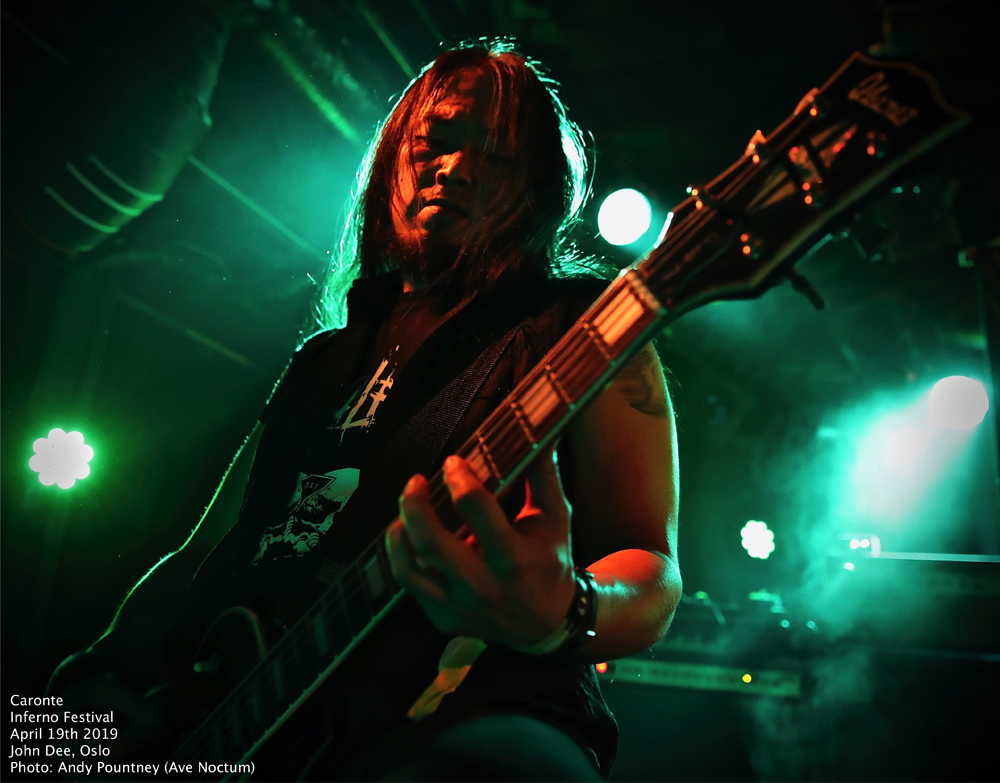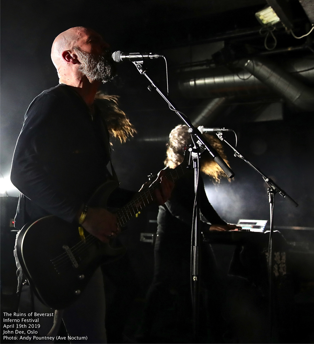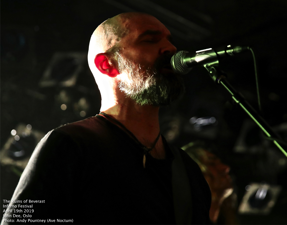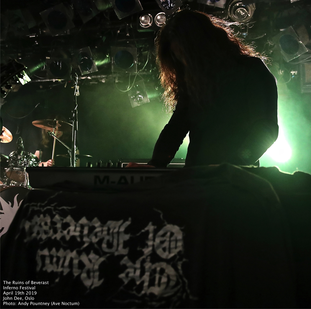 Upon arriving in John Dee again, the curtain was across the stage (which seems to be the norm in Norway), but through a gap at the side it was possible to see Caronte’s vocalist Dorian performing a ritual in front of their altar. Once the curtains went back this carried on briefly and he returned to this on several occasions during their magick ritual. The packed crowd were entranced by the dense shamanic doom and despite the room becoming unbearably hot, the crowd persevered to the end.