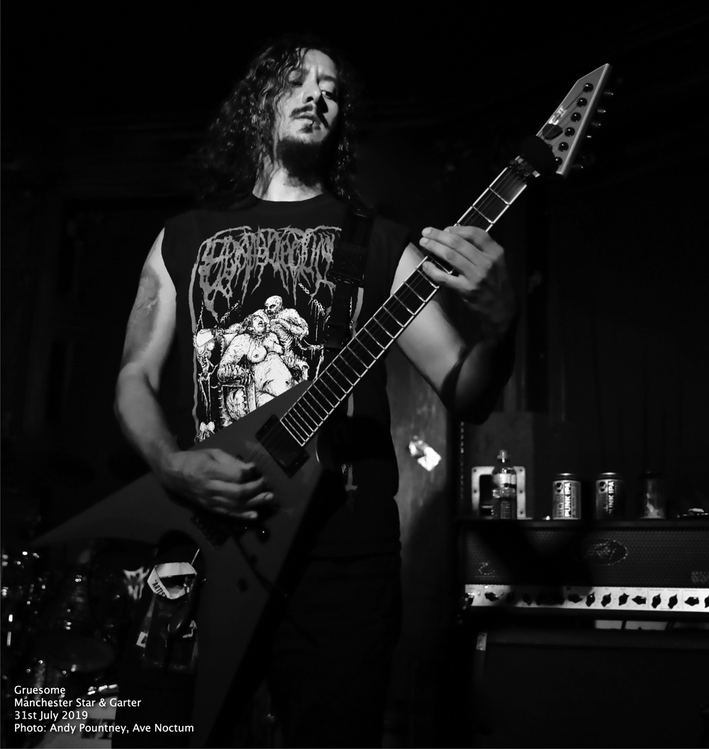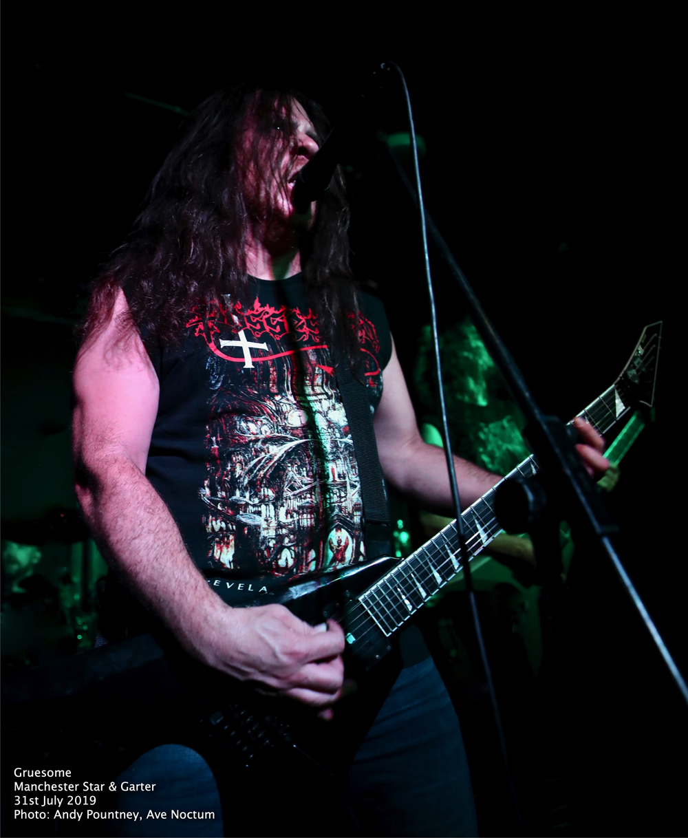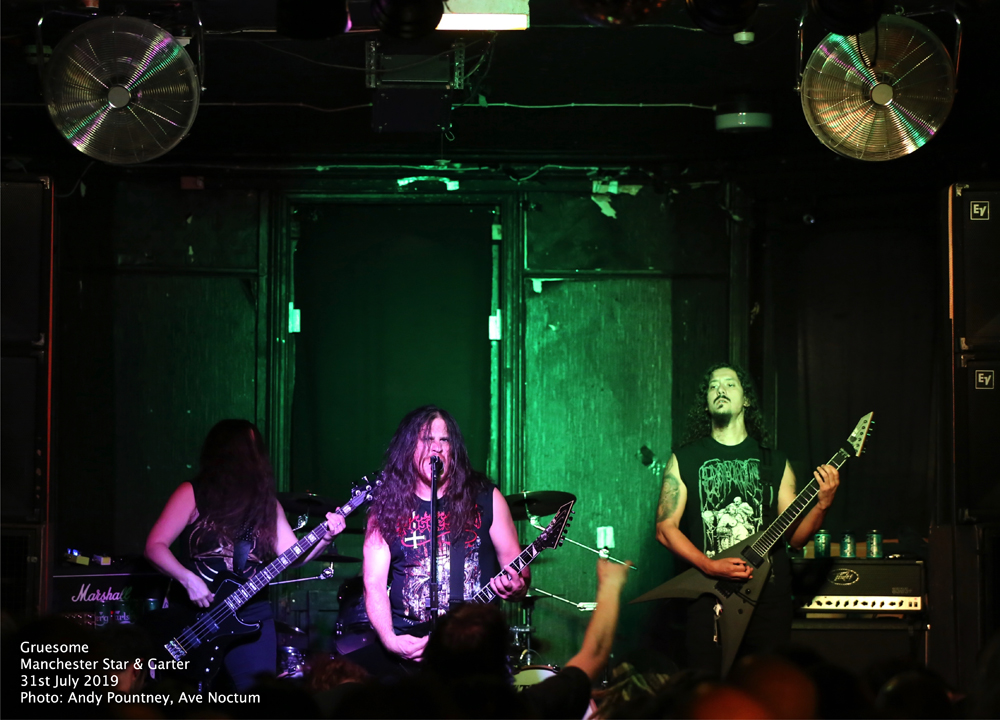As far as I know this was the first time Gruesome had played the UK, though this was my fourth time having seen them previously in Holland twice and the Czech Republic, as they made a point of stating that this was the first time they’d played in Manchester. Despite all the supports receiving hearty appreciation from the crowd it was clear that the gathered sweating masses were here to see Gruesome as the venue filled up and people sorted themselves out to see the stage which is very difficult as it’s not a high one. Me, I stood on a wooden shelf on the right side so I could actually see what was going on as the band launched into “Inhumane” as the lack of a pit was rectified as soon as I had noted there wasn’t one. Thankfully the venue had turned off the room lights something they didn’t do whilst the supports were on for some reason. As the pit threw itself around expending energy and splashing sweat about they careered into “A Waste Of Life” where the step up in quality and power was exponential. Typically there was plenty of guitar posturing from the band members as a pause for the obligatory disclaimer stating that, and to paraphrase, we are a Death tribute band, after giving thanks for us turning up. Anyone who likes Death should love this band whether they’re a tribute act or not as whilst they write their own songs in the vein of Chuck and the boys from years ago the sonic pulverising Gruesome blanketed the crowd with was utterly their own.