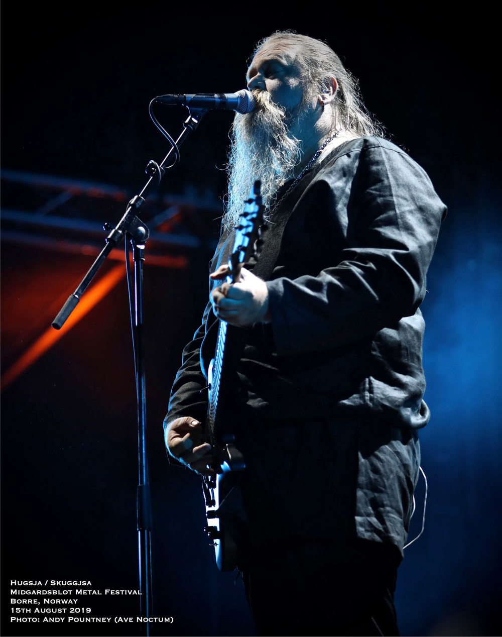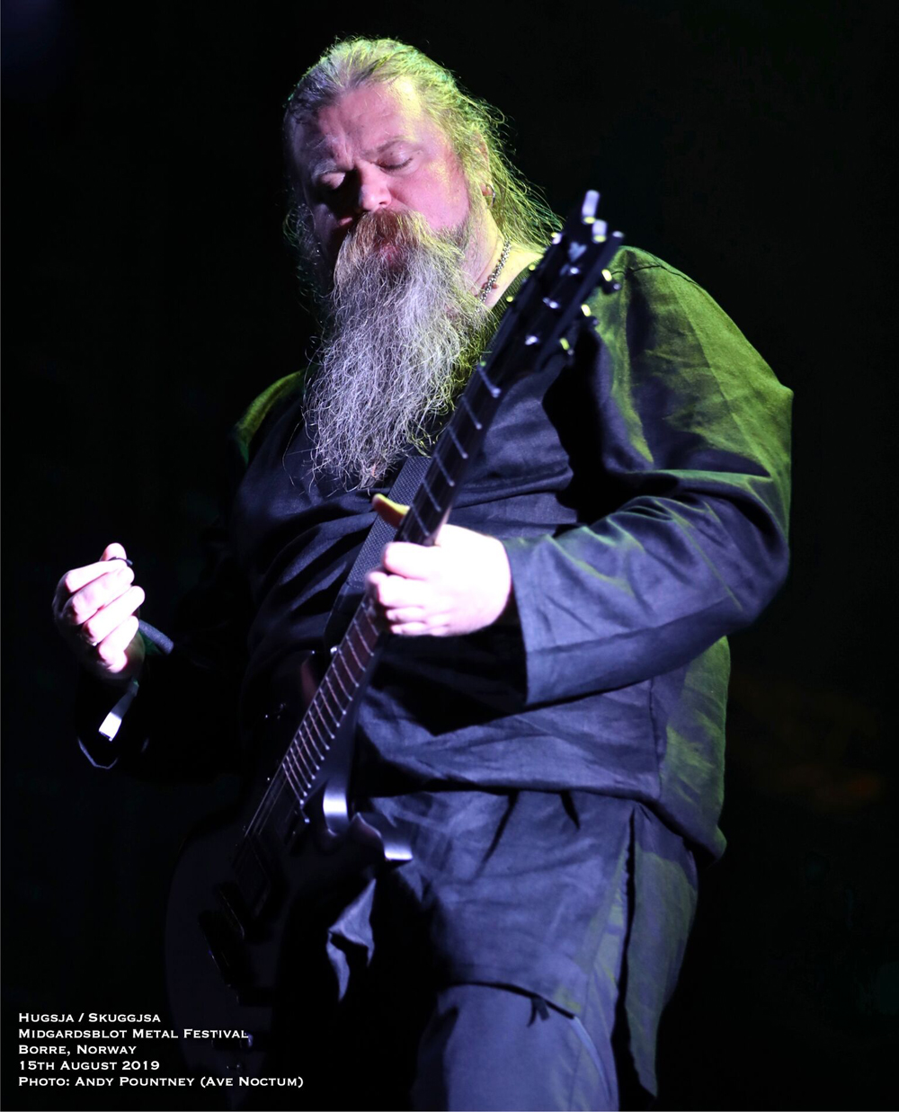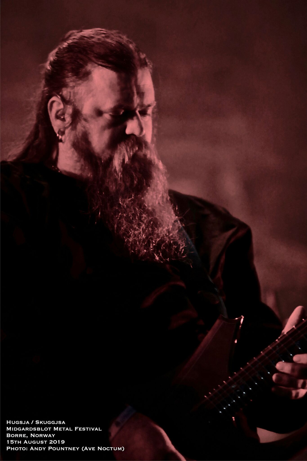 I’ve got to admit that the headliner of Ivar Bjørnson and Einar Selvik who performed material from their Hugsja and Skuggjsa releases but also chucked in an Enslaved song and some Wardruna material too, I was a tad sceptical as to what to expect. However from the moment they started there was a mesmeric quality that you just could not take your eyes off for a second as the beautiful, ambient and acoustic opening saturated in red light started their set. Indeed for about half of their set they utilised only monochrome lighting in each song and rarely varied the hue or brightness. What that did was make you focus on the band as the emotive vocal tones seeped with passion and texture where the dynamics of every song fluctuated majestically. The use of various instruments from string to wind by Einar Selvik was coupled to his sublime vocal display where each note was gracefully honoured by the respectful crowd. As the light phased into a green shade and the forest behind and to the sides was lit in turquoise the ambience was exhilarating as a horn sounded whilst blanketed in white light for “Skuggsjá”.