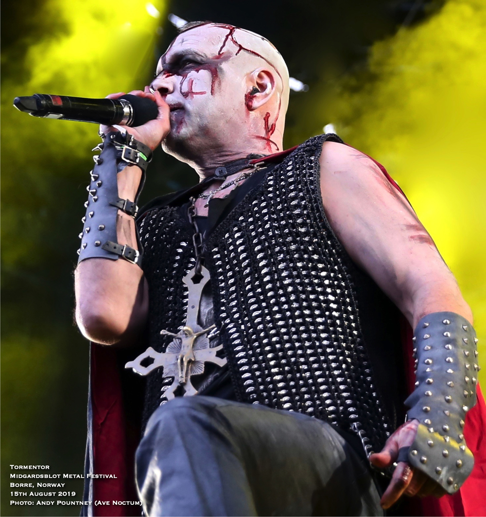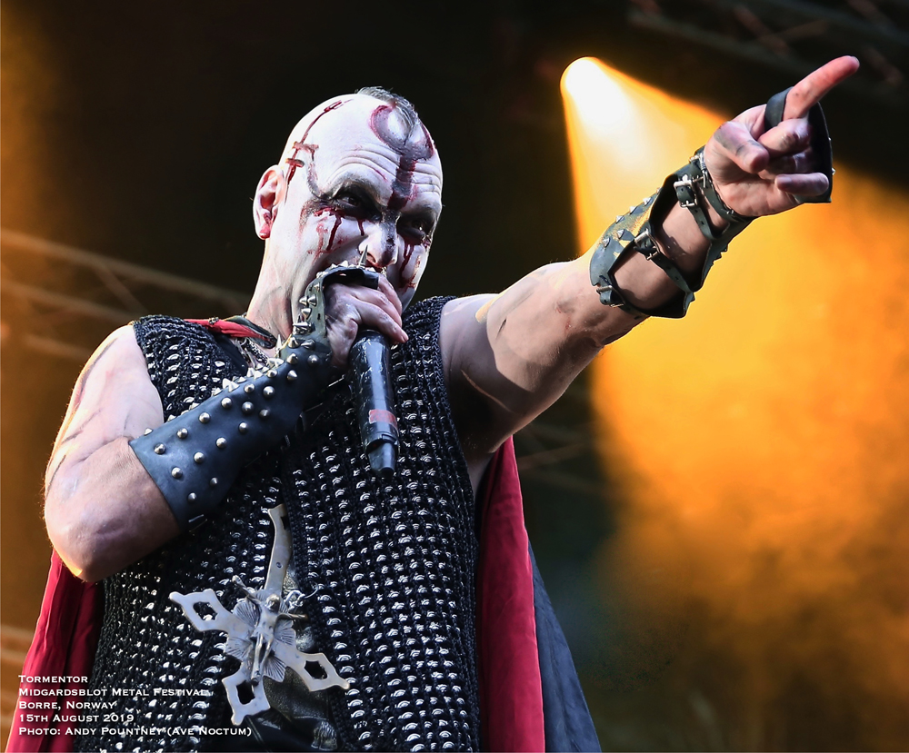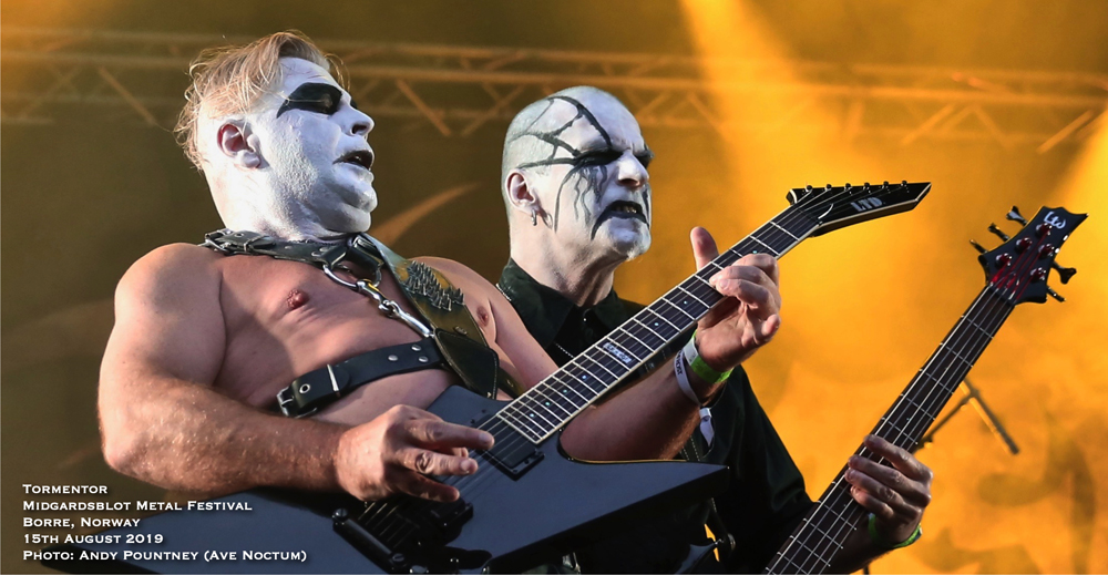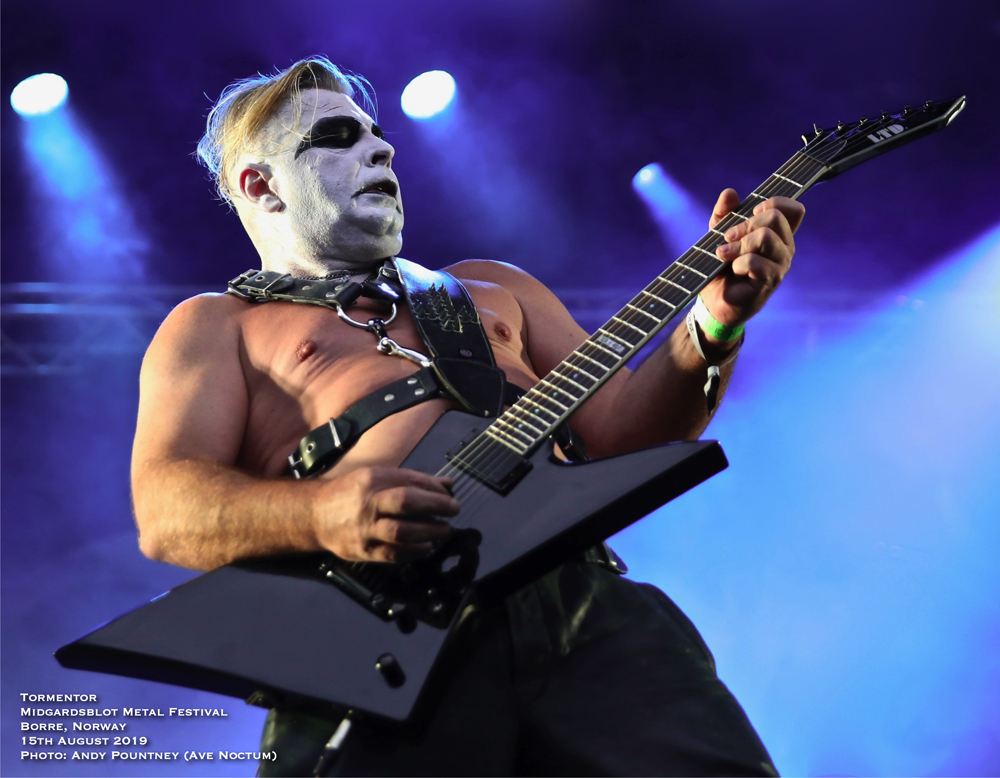 After sauntering around the site and getting a feel for things I had missed the opening Blot Ceremony plus Gaahls Wyrd due to travel arrangements, so partook in the first beer which was expensive at about £8.50 per 400ml cup, yes only 400ml and that was the cheapest on offer, there were many others over £10 a pop. However it didn’t stop me drinking I just took a bit longer as my shooter pointed out that the outdoor second stage that was present in 2018 was no longer and had reverted to a marquee style within a bar as the crowd sat or stood outside to watch. I wasn’t sure how that would work until later, so more on that to come. With only a few bands to see that night a quick look around the Valhalla stage (main stage) area showed that little had changed since 2017 except that the main stage height was much higher which meant photographers had to practically face upwards like a cliff face to get shots. The Gildehallen Stage (second stage) had changed orientation, this time being along the longer side of the hall, though it was the same as last year according to my shooter, as the stage seemed to take up more space than the audience could stand around to watch in. With that in mind a mental note of getting in there early was going to be key for bands playing that stage and turned out to be correct. Some newer sculpting works were present plus a huge ornately carved wooden cart was present in one doorway, I was hoping I might get pushed back home in it at end of the night, and as time marched forward for Hungarian black metallers Tormentor it was time take position at the Valhalla Stage.