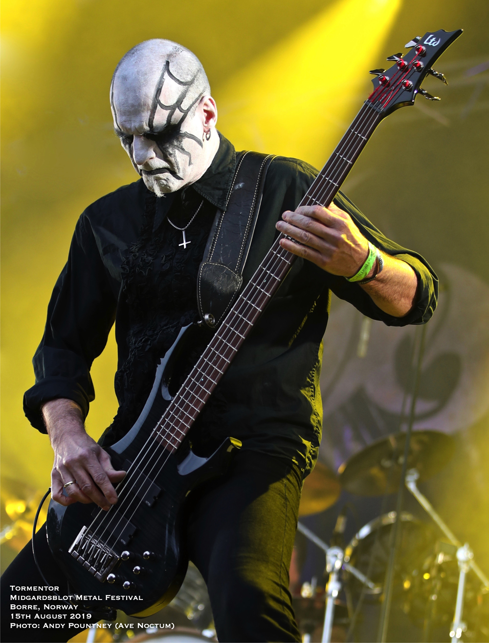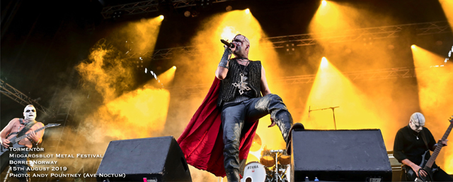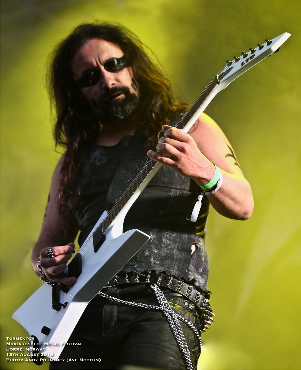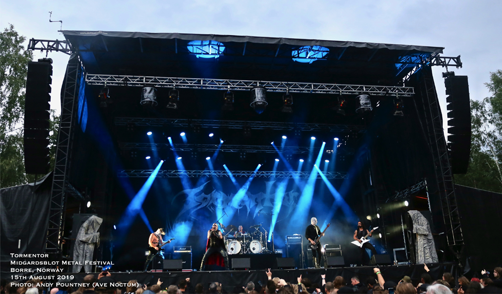 After sauntering around the site and getting a feel for things I had missed the opening Blot Ceremony plus Gaahls Wyrd due to travel arrangements, so partook in the first beer which was expensive at about £8.50 per 400ml cup, yes only 400ml and that was the cheapest on offer, there were many others over £10 a pop. However it didn’t stop me drinking I just took a bit longer as my shooter pointed out that the outdoor second stage that was present in 2018 was no longer and had reverted to a marquee style within a bar as the crowd sat or stood outside to watch. I wasn’t sure how that would work until later, so more on that to come. With only a few bands to see that night a quick look around the Valhalla stage (main stage) area showed that little had changed since 2017 except that the main stage height was much higher which meant photographers had to practically face upwards like a cliff face to get shots. The Gildehallen Stage (second stage) had changed orientation, this time being along the longer side of the hall, though it was the same as last year according to my shooter, as the stage seemed to take up more space than the audience could stand around to watch in. With that in mind a mental note of getting in there early was going to be key for bands playing that stage and turned out to be correct. Some newer sculpting works were present plus a huge ornately carved wooden cart was present in one doorway, I was hoping I might get pushed back home in it at end of the night, and as time marched forward for Hungarian black metallers Tormentor it was time take position at the Valhalla Stage.