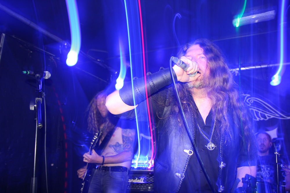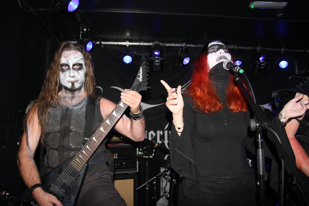 Looking at the somewhat over the top costumes displayed by Welsh band Agrona I was not so sure that was strictly going to be the case here. New to me, I had noted that they had gone down well recently at Warhorns Festival but had yet to prove themselves to me. The symphonic intro strains came as no surprise to me and I am quickly put on edge by the swaggering roars of vocalist Taranis, the barked out delivery and chest-beating bravado all a bit theatrical. By comparison, the beauty to the beast that is Adara has a great voice when used. Her Daryl Hannah make up circa next-months Blade Runner is about to be history rather than futurist but her voice certainly struck with a witchy tempestuousness. I think I would have preferred this more without the male Behemoth like barks though and the clattering sound from the rest of the band was not particularly gelling either. There’s far too much in the way of stuff off stage propping it all up, there’s certainly enough people playing but where are the keyboards for instance? True the stage isn’t that big but.. It’s difficult to take it too seriously watching it in front of me although there is a lethal harshness displayed on a couple of tracks I have now listened to online it just didn’t come across well here tonight.
