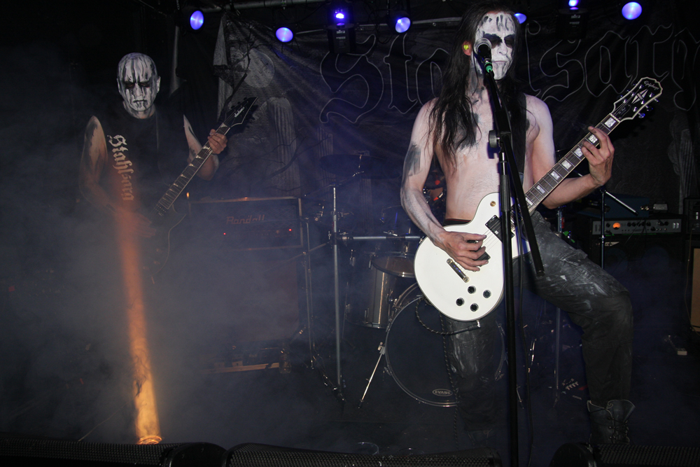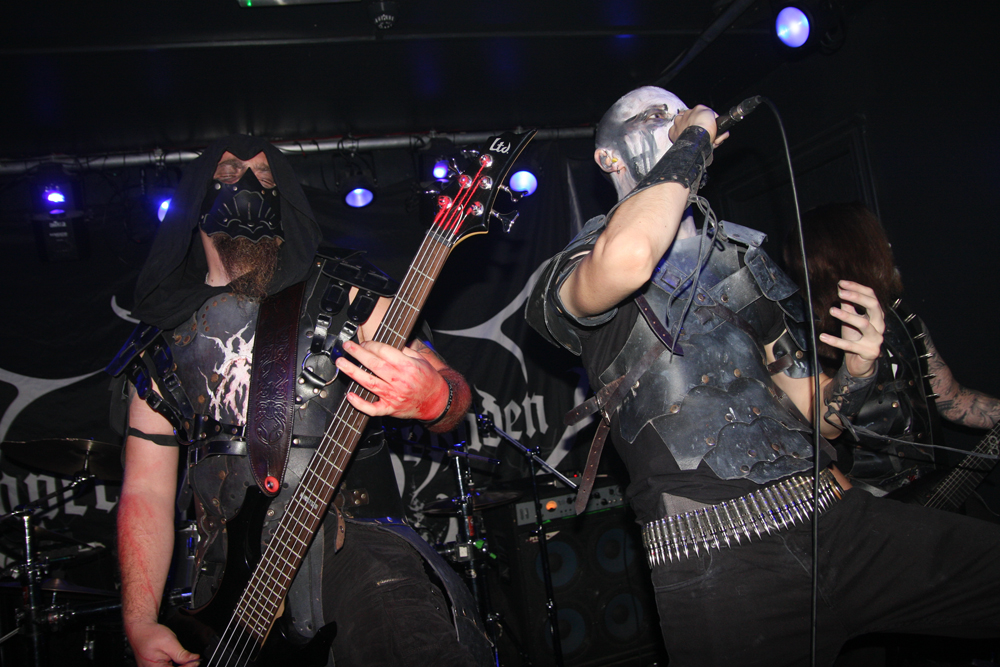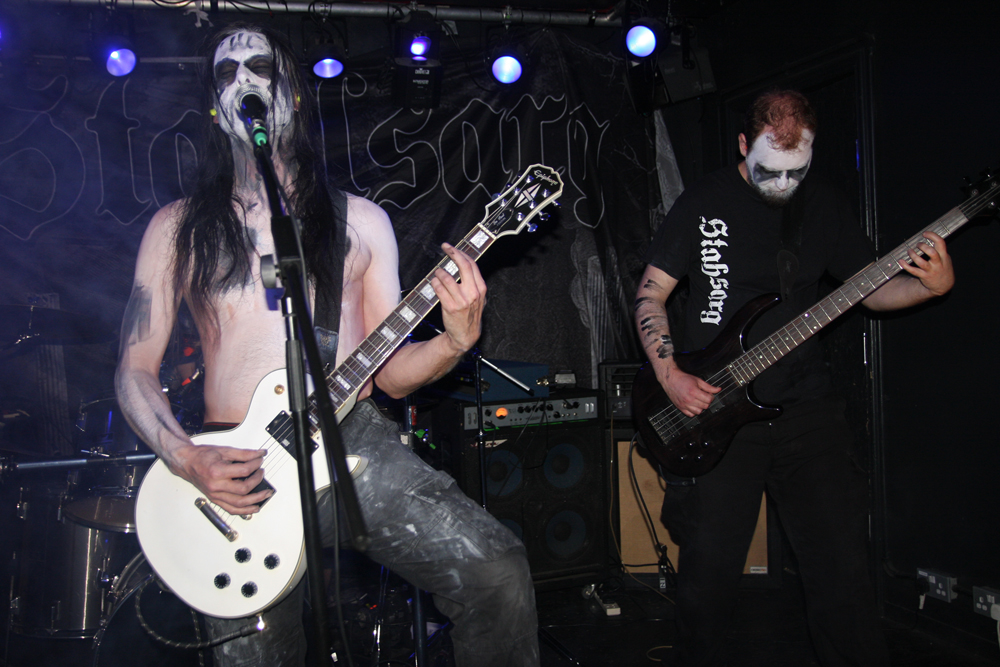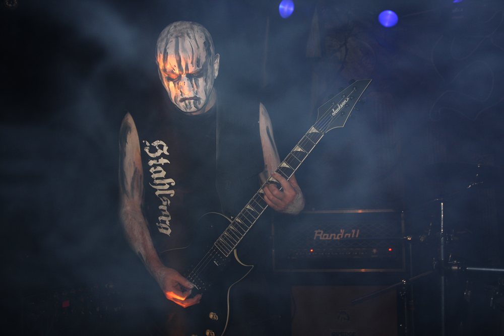 First off Stahlsarg from Suffolk are no strangers and take to the stage with a full on brackish sound and a near punk etched backbone swaggering into the first song ‘Das Fallbeil,’ grimacing at those spread before them and looking hostile and war-man-like. With Destruction and Krieg lit up with spotlights either side of the stage and front weapon Eissturm corpse-painted and ghastly, dry ice spreads like gas and spills off the stage into the room creating a suitable atmosphere in the trenches. Violence and feral hostility are one part of the display but there is also plenty of parts here that simmer things down and allow the musicianship to sparkle. ‘Blonde Poison’ is a nasty enough tale in itself recounting a treacherous true-life event from WWII of a Jewish collaborator betraying her brethren to the Nazis. Full of spite and bitterness as well as a lethal groove it’s a lengthy and involving number with plenty going on in it and it gets those down the front banging away. Vocals are really on point craggy as the Frostbite Division paint their grim, forged in black odes of futility and destruction. Finishing with old favourite Damocles XIII it’s obvious why they have been popular guests at various underground European festivals and Stahlsarg are definitely flying the flag for proper grown-up UK BM.