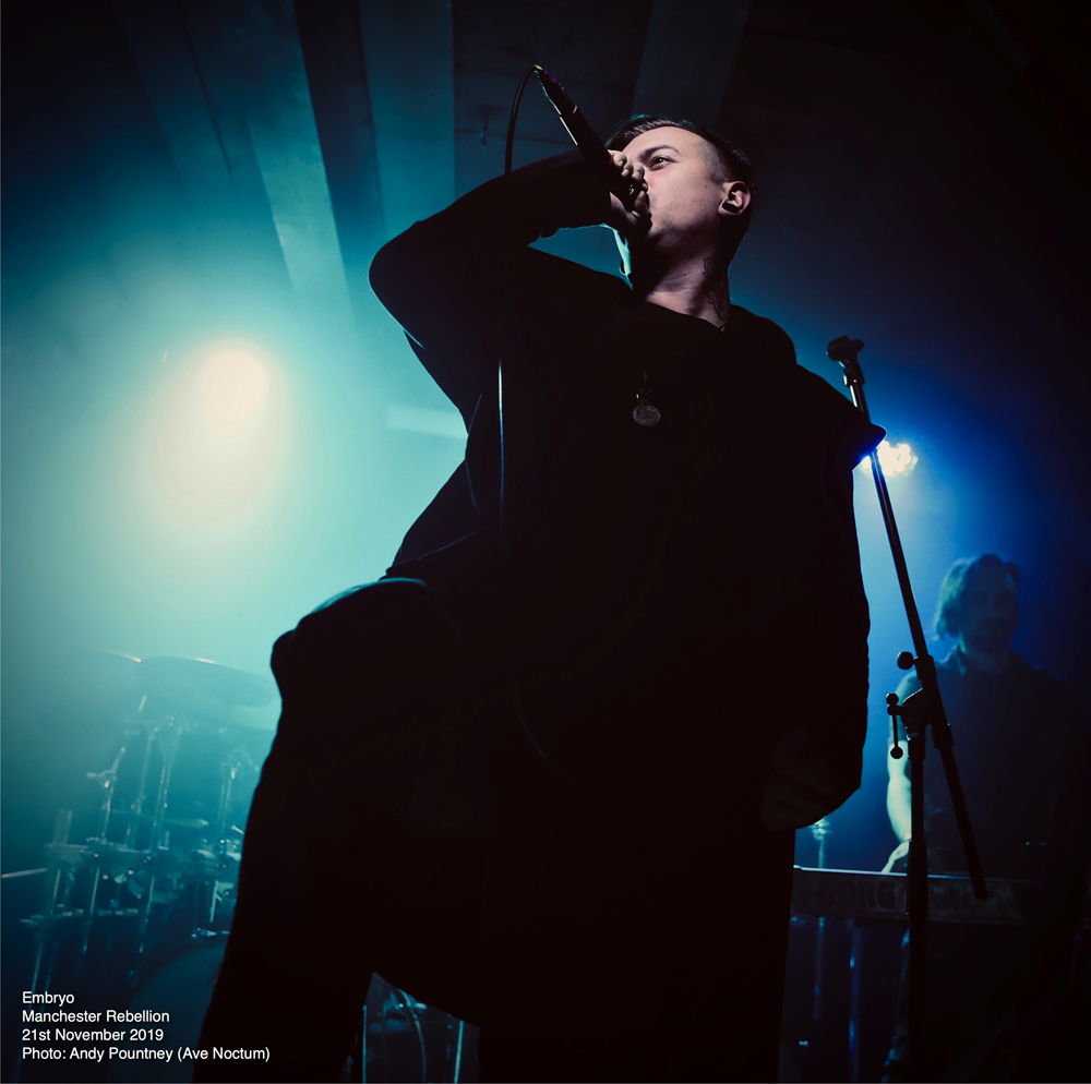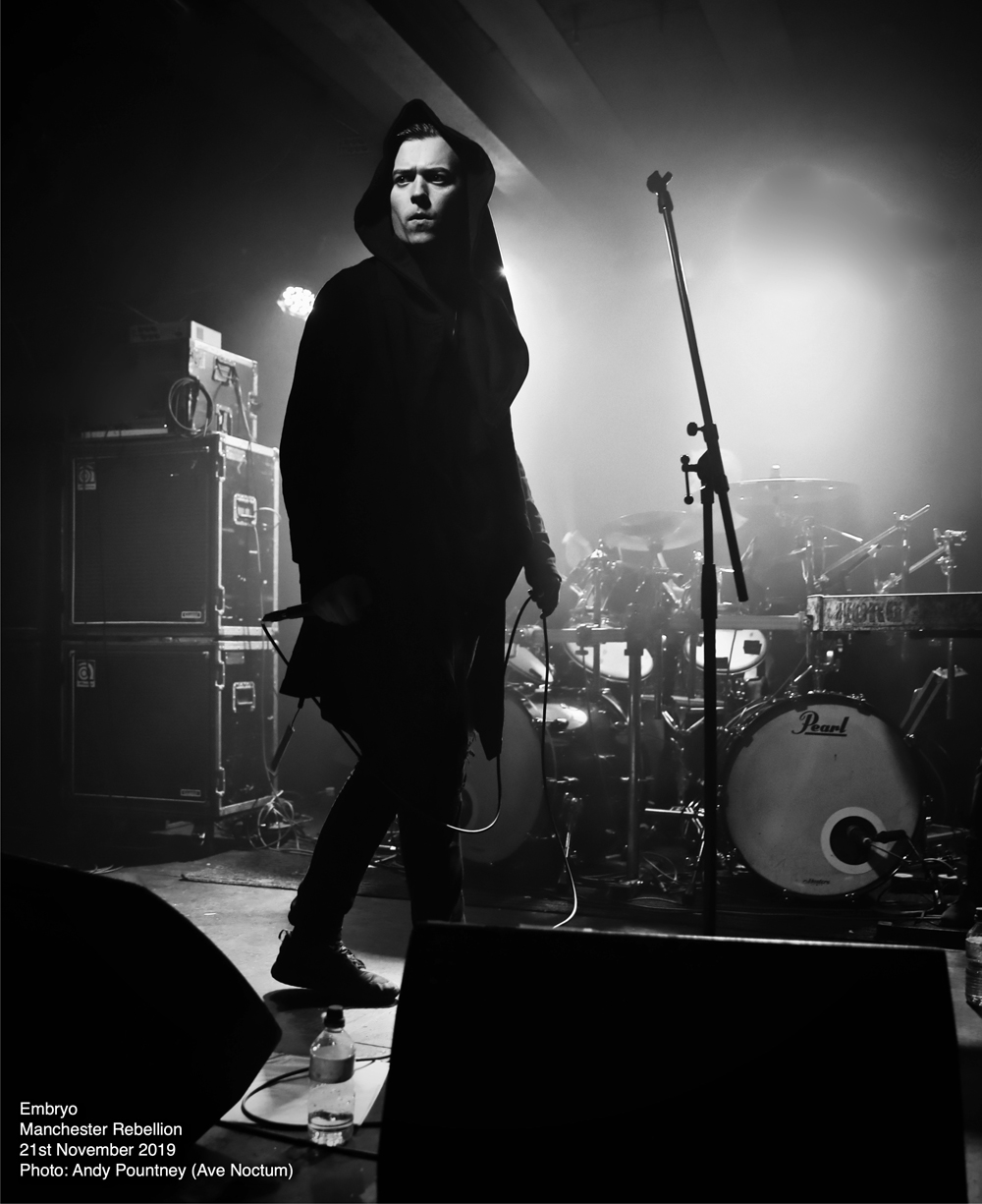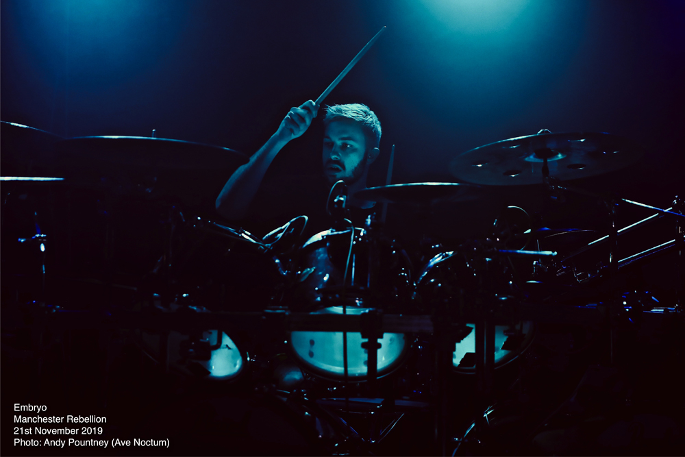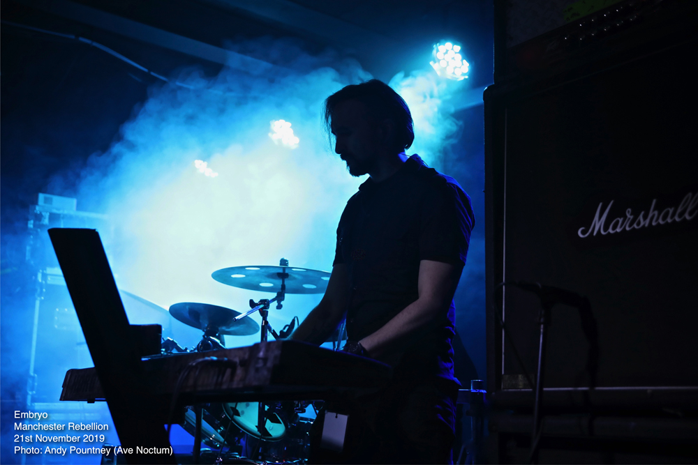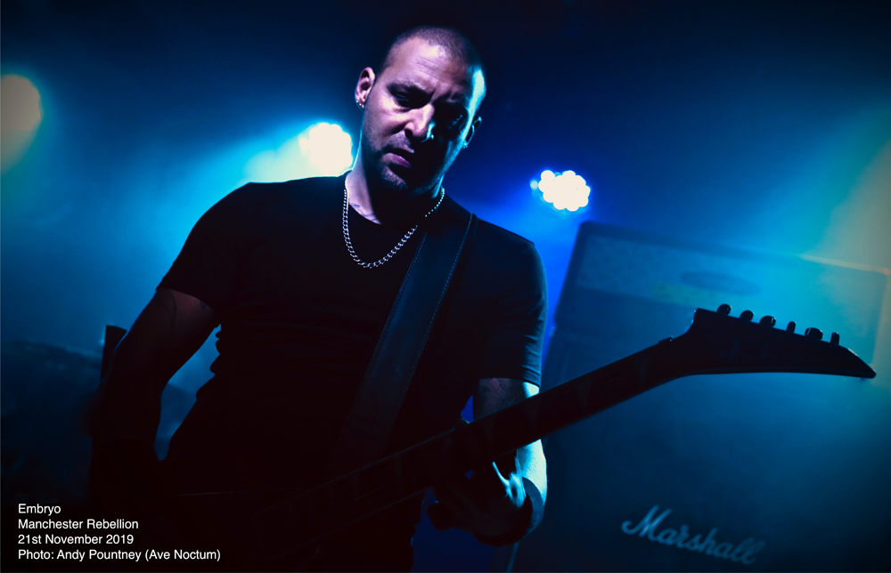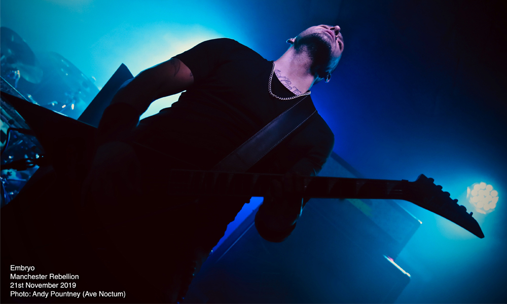 Looking at this four artist line up one becomes instantly aware of how diverse the whole evening was going to be and indeed that is exactly what we got as the bands went from symphonic death metal to old school death metal, but sandwiched between was brutal death metal and black metal. With such an array of acts it is always possible that a revolving door of fans watch the style they want but tonight most people in attendance watched every band put on great performances that began with Italian symphonic death metallers Embryo. I saw Embryo back in 2015 at the Czech Metal Fest and was extremely impressed with their show to the point where I bought some of their merch, including a mug, at a very inexpensive price. How their brand of death metal would be received by a UK audience was questionable given the brutality of the line-up overall, as they hit the stage whilst an intro, “Solitaria 1519”, was playing then launched into “Leonardo” that follows it on their recent “A Step Beyond Divinity” release.