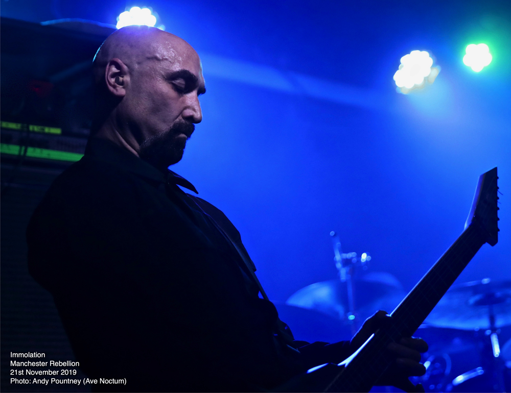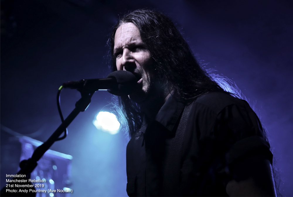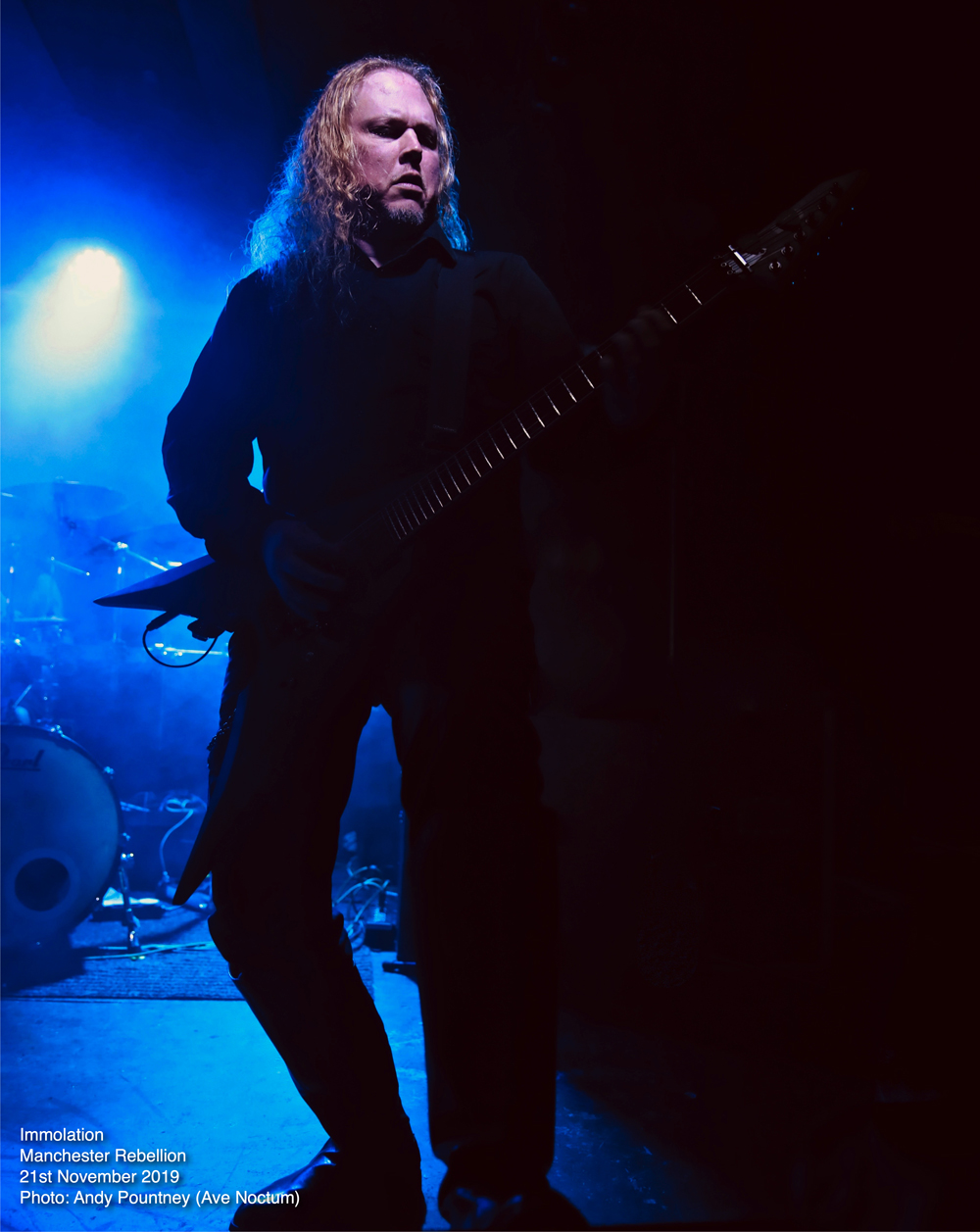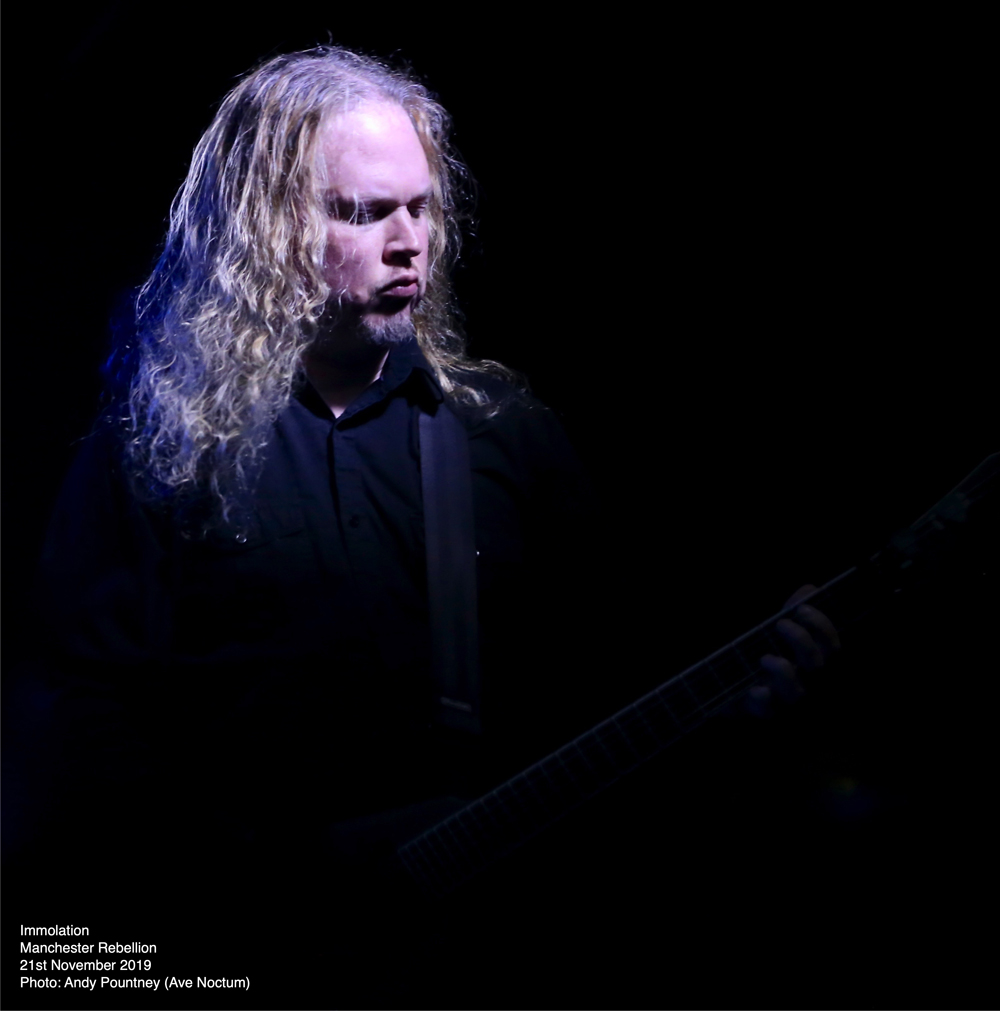 Savaging the crowd with “Kingdom Of Conspiracy” the sound seemed to just encase you as Ross Dolan’s bass work threatened to cause sonic asphyxiation. Using the stage wisely so that the guys didn’t crash into each other, especially Dolan’s hair which is still the longest I’ve seen, except maybe Alex Krull. Pausing after “Father, You’re Not A Father” where the deluging double bass endangered the foundations of the building, Ross had a brief chat of the usual stuff before “Distorting Light” was thrust outwards like a tsunami as the dispassionate onslaught led straight into “Swarm Of Terror” before wielding the vicious “Into Everlasting Fire” from the band’s debut some 28 years ago. With audience chants of the band’s name there was more chat offering some respite as “World Agony” was a sinuous amorphous assault where ultra-deep guttural vocals captured an aura of grisly horror. With an extensive discography there was an extensive set list as “Spectacle Of Lies” continued the bombarding nihilism producing a sonic opacity that only Immolation can produce. “Burn With Jesus”, another old track, was nothing short of explosive as transport arrangements became impending and I left whilst they plunged into the cavernous destructiveness of “Lower” knowing that I had witnessed a fantastic evening of extreme metal.